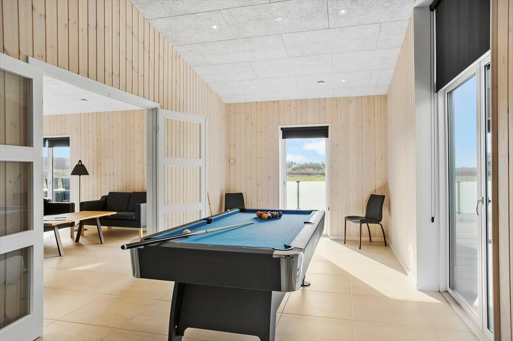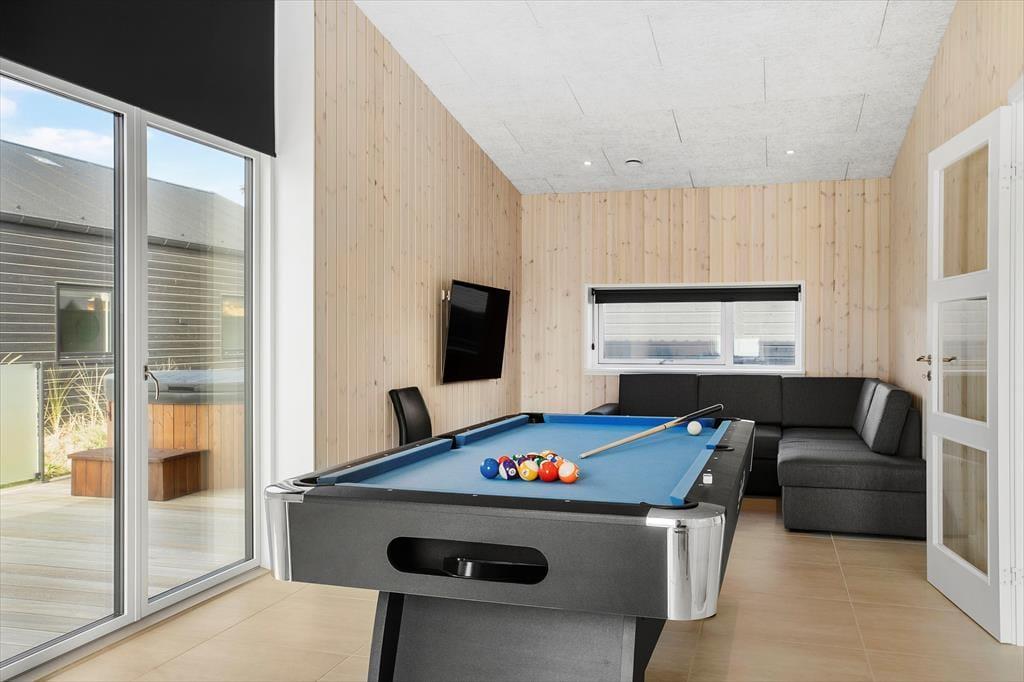 Atmosfæren er særdeles indbydende inden døre i huset, som med sine 147 m2 nemt kan rumme otte personer. Der er tre soveværelser med dobbeltseng og mulighed for at rede op til to på den dobbelte sovesofa i aktivitetsrummet – når I altså ikke hygger jer med at spille pool eller blive underholdt af fladskærmen. I det tilstødende opholdsrum er der også fladskærms-tv med Chromecast foruden sofaarrangement, spisebord og et lækkert køkken med alt det nødvendige for at lave smagfulde måltider. Badeværelser er der to af, hvoraf det ene er med sauna, som er en herlig tilføjelse, hvis I trænger til at slappe fuldstændigt af i løbet af ferien.