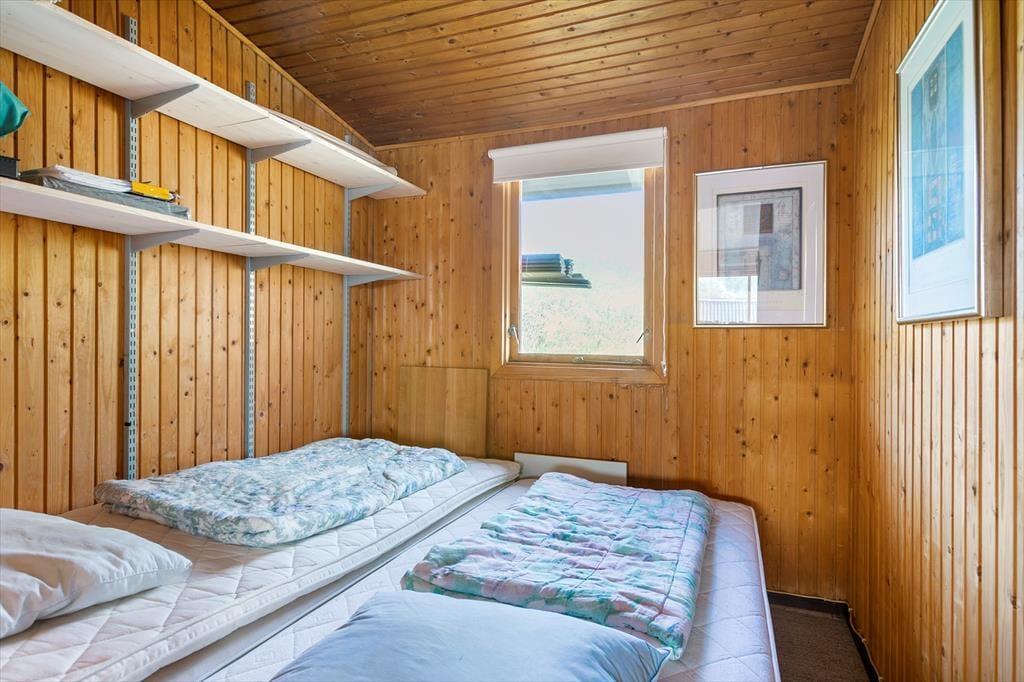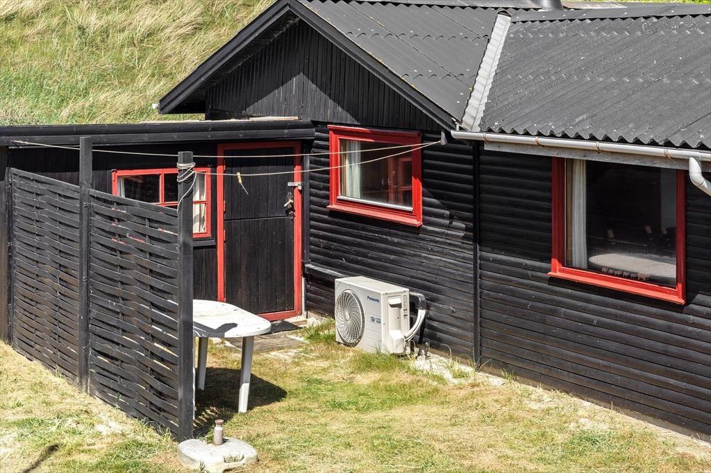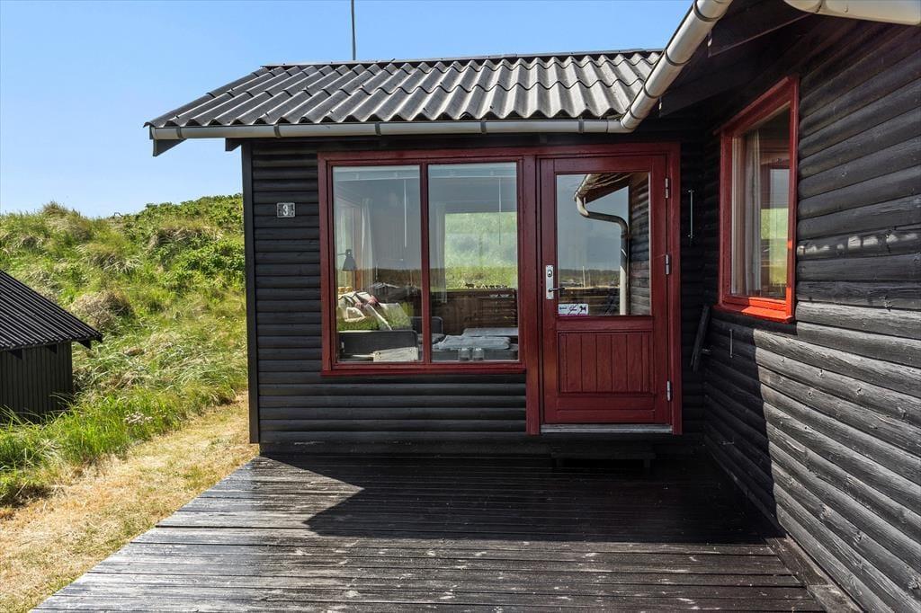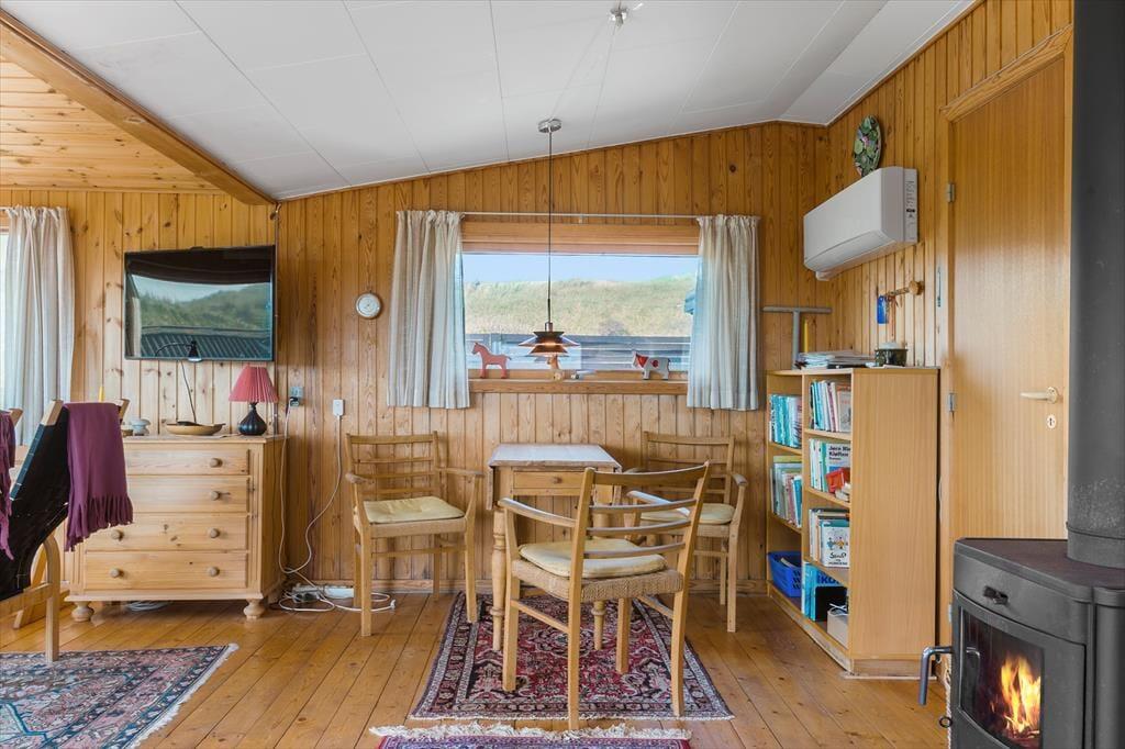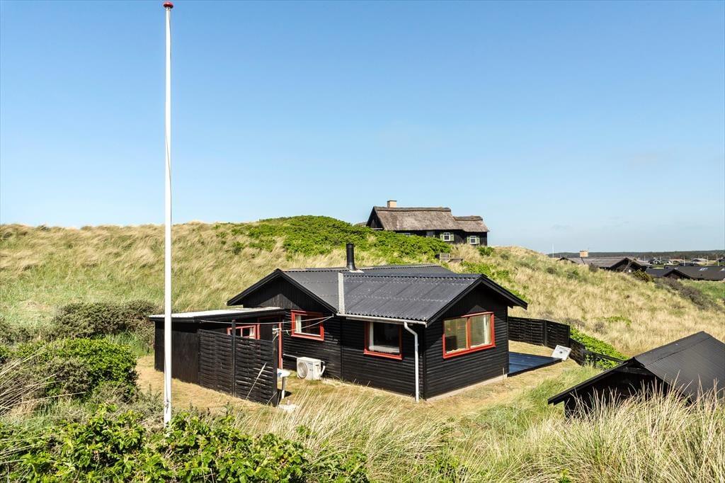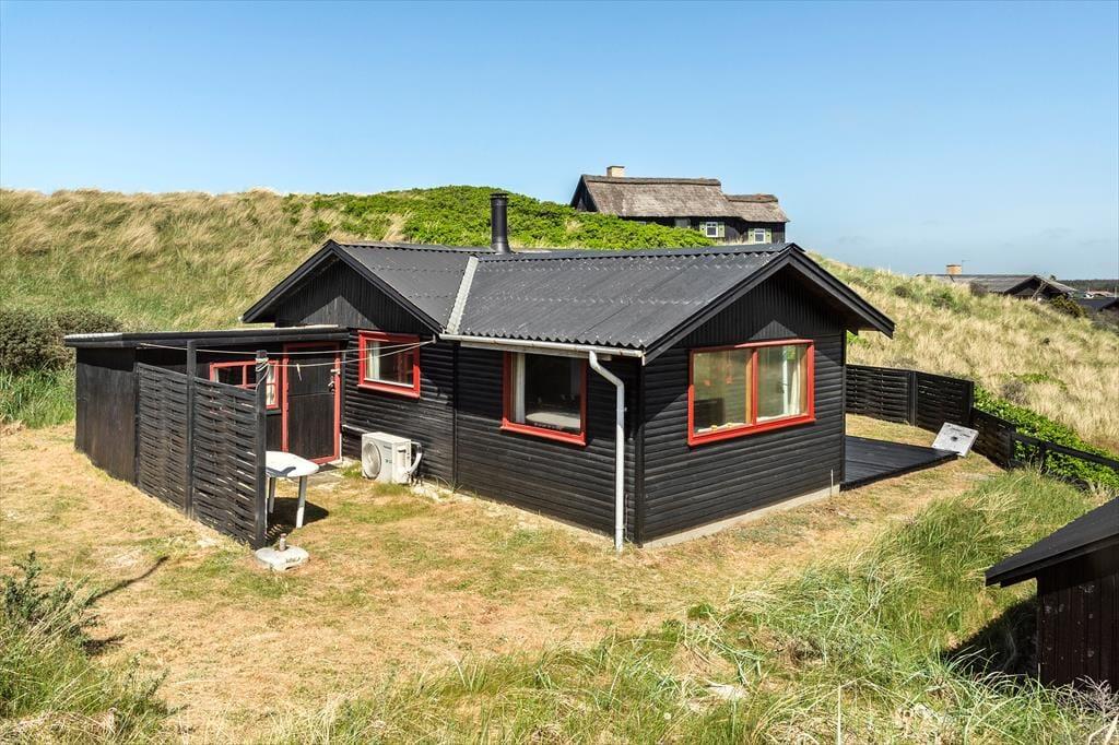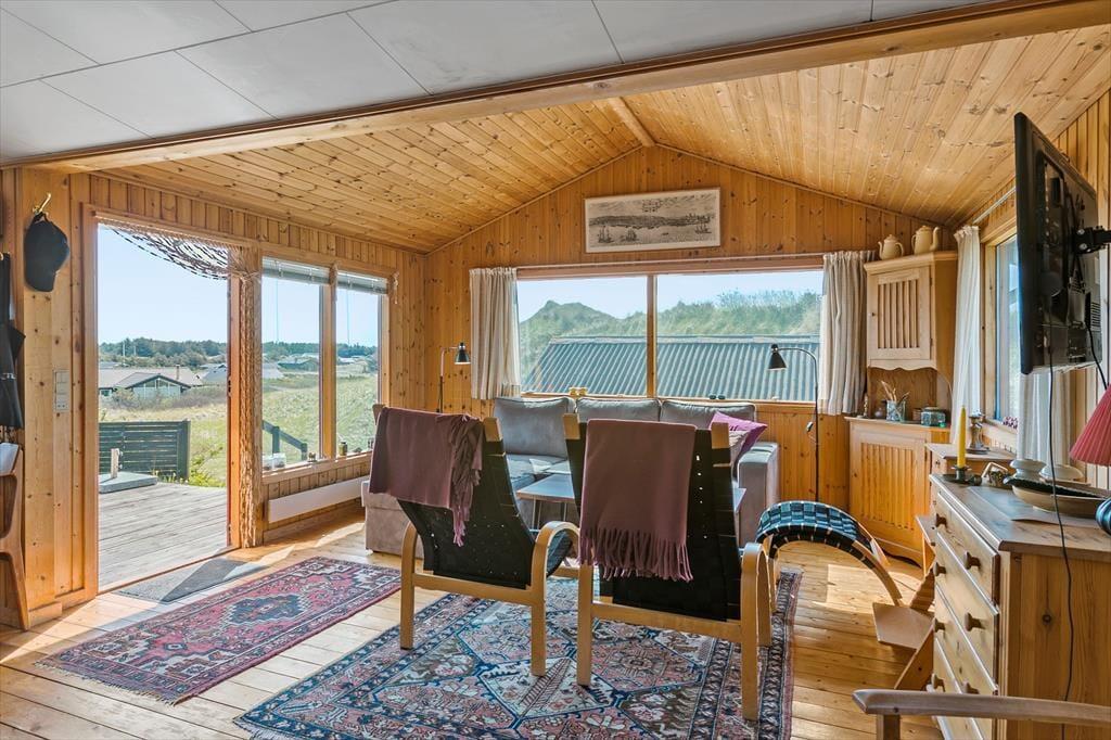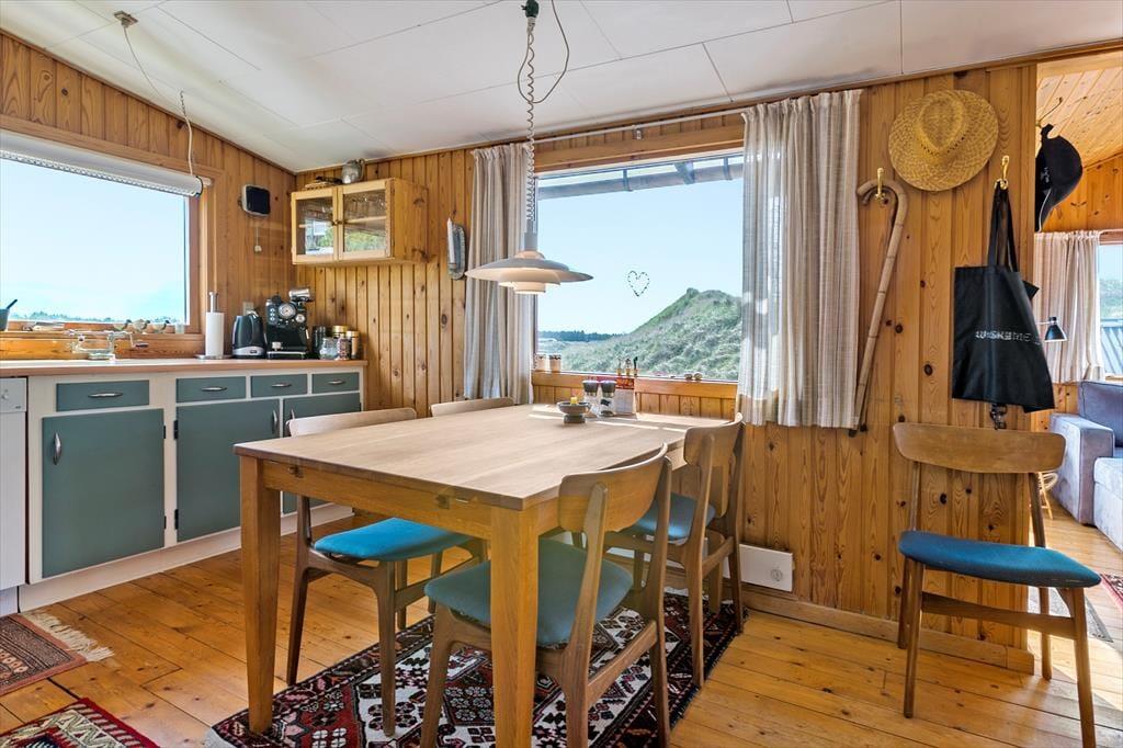 Sommerhuset, der er opført i 1965 og måler 54 m2, er indbegrebet af et klassisk dansk feriehus: Der er loft til kip, trævægge og hyggeligt møblement inden døre, og en brændeovn står klar til at sprede varme og god stemning. Gennem vinduerne kan I se lige ud på de marehalmsklædte klitter og det naturskønne sommerhusområde – ja, selv fra badeværelset kan I se lige ud i det grønne. Der er en dør imellem toilettet og baderummet, hvor I for øvrigt finder en vaskemaskine, mens køkkenet er integreret med stuen. I selve sommerhuset er der to soveværelser, og et anneks byder på ekstra sengepladser, så det er muligt at være op til seks personer, hvis det er ønsket.