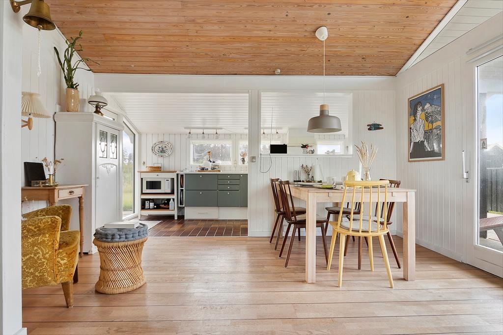 Efter seneste istandsættelse er farvetonerne lyse inden døre, og man har fundet en skøn balance mellem moderne møblement og retro elementer, der bidrager til den helt rette sommerhusstemning. I stuen kan I tilmed tænde op i pejsen, når I vil hygge jer med en god bog eller krydsogtværs i sofaen – bare husk at kigge op engang imellem, så I kan nyde udsigten over det åbne landskab, der breder sig udenfor stuevinduerne. Et funktionelt indrettet køkken ligger i forlængelse af stuen, og derudover består planløsningen af tre gode soveværelser og et badeværelse med bruser.