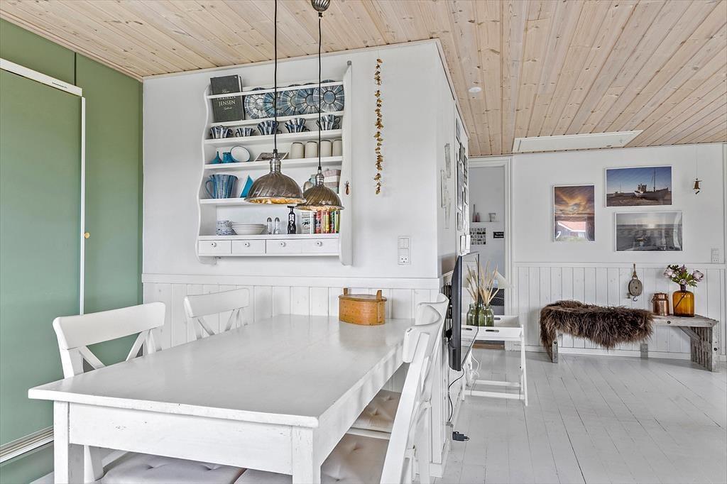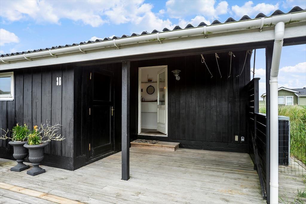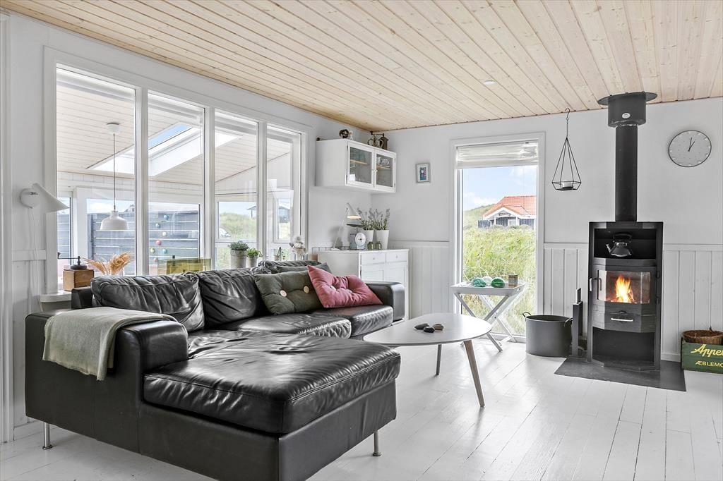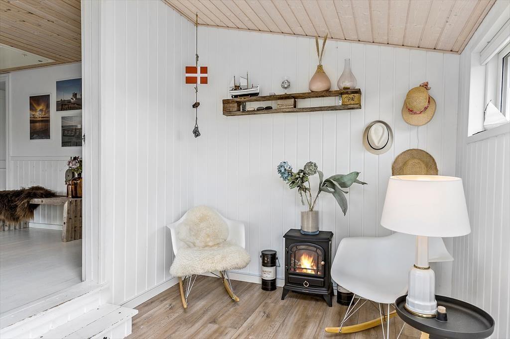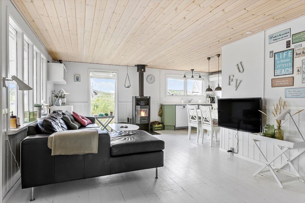 Da det 80 m2 store sommerhus blev renoveret, var der fokus på at modernisere og lysne rummene, men samtidig bevare den gode atmosfære, så huset er en optimal base for de, der trænger til at slappe af. Rummene indbyder til at tage den med ro, uanset om det er vejr til at tænde op i brændeovnen og flade ud i stuens sofa, eller om I bruger det meste af ferien i den tilstødende udestue. Hvis I kan lide at lave mad, har I en god arbejdsstation i det åbne køkken, og så er der både bruser og vaskemaskine på badeværelset. Soveværelser er der to af og I har mulighed for at være op til seks personer i huset. Ydermere er der babyseng og babybadekar i huset.