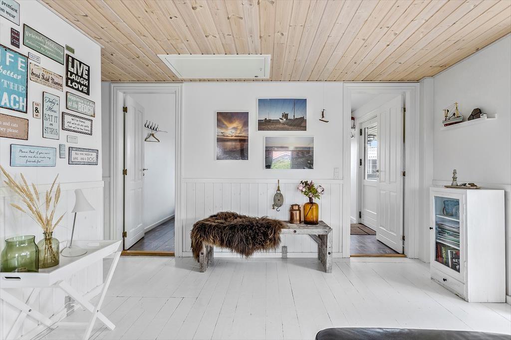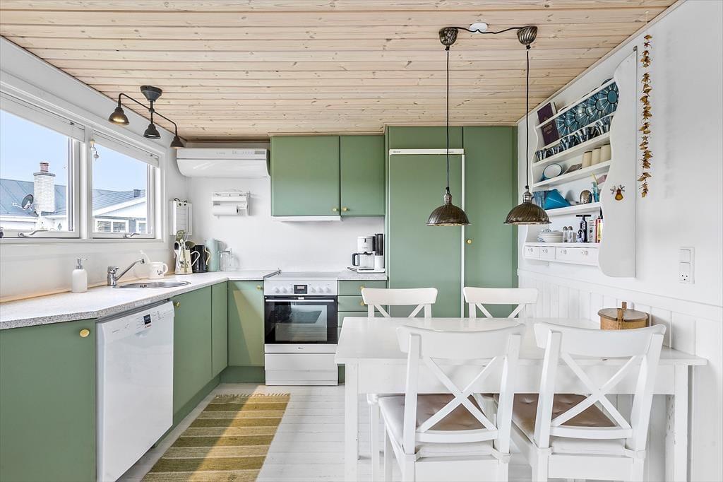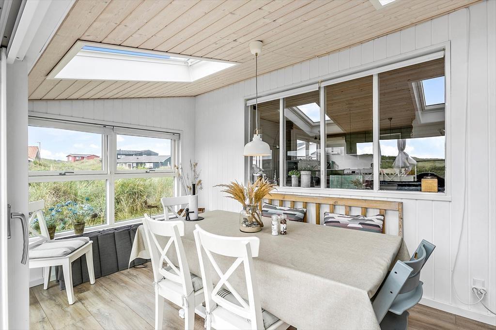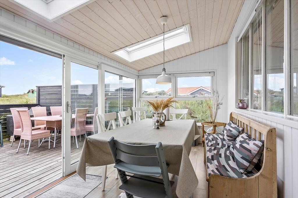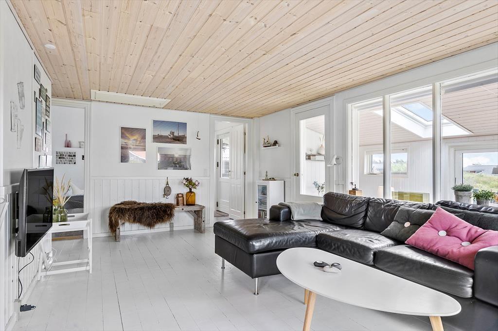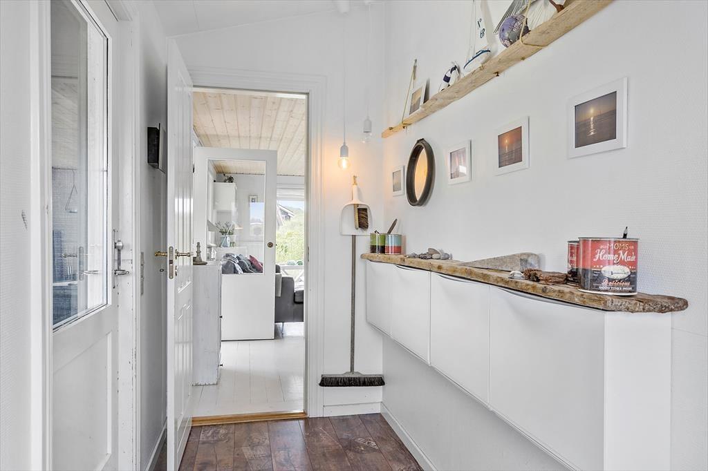 Da det 80 m2 store sommerhus blev renoveret, var der fokus på at modernisere og lysne rummene, men samtidig bevare den gode atmosfære, så huset er en optimal base for de, der trænger til at slappe af. Rummene indbyder til at tage den med ro, uanset om det er vejr til at tænde op i brændeovnen og flade ud i stuens sofa, eller om I bruger det meste af ferien i den tilstødende udestue. Hvis I kan lide at lave mad, har I en god arbejdsstation i det åbne køkken, og så er der både bruser og vaskemaskine på badeværelset. Soveværelser er der to af og I har mulighed for at være op til seks personer i huset. Ydermere er der babyseng og babybadekar i huset.