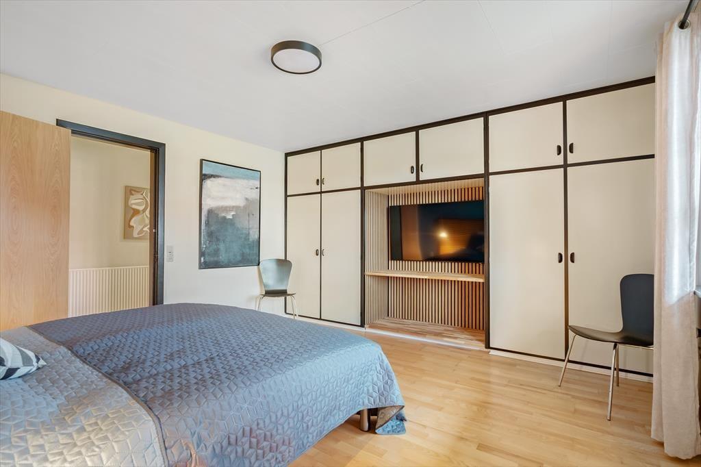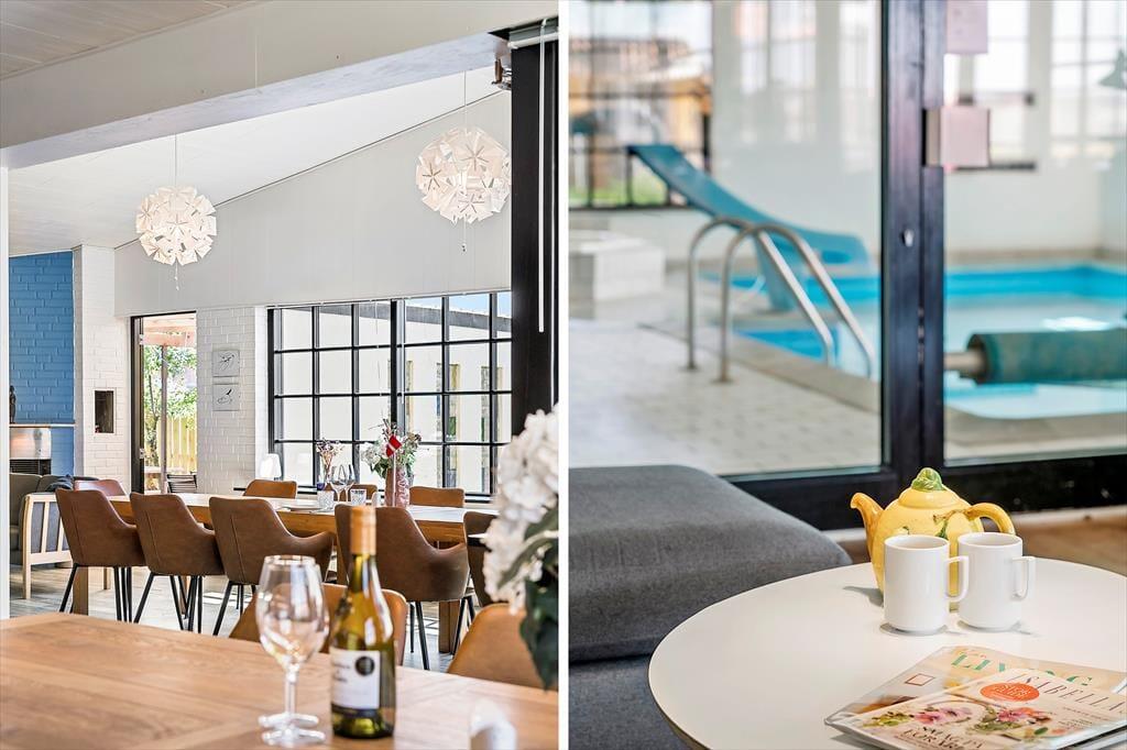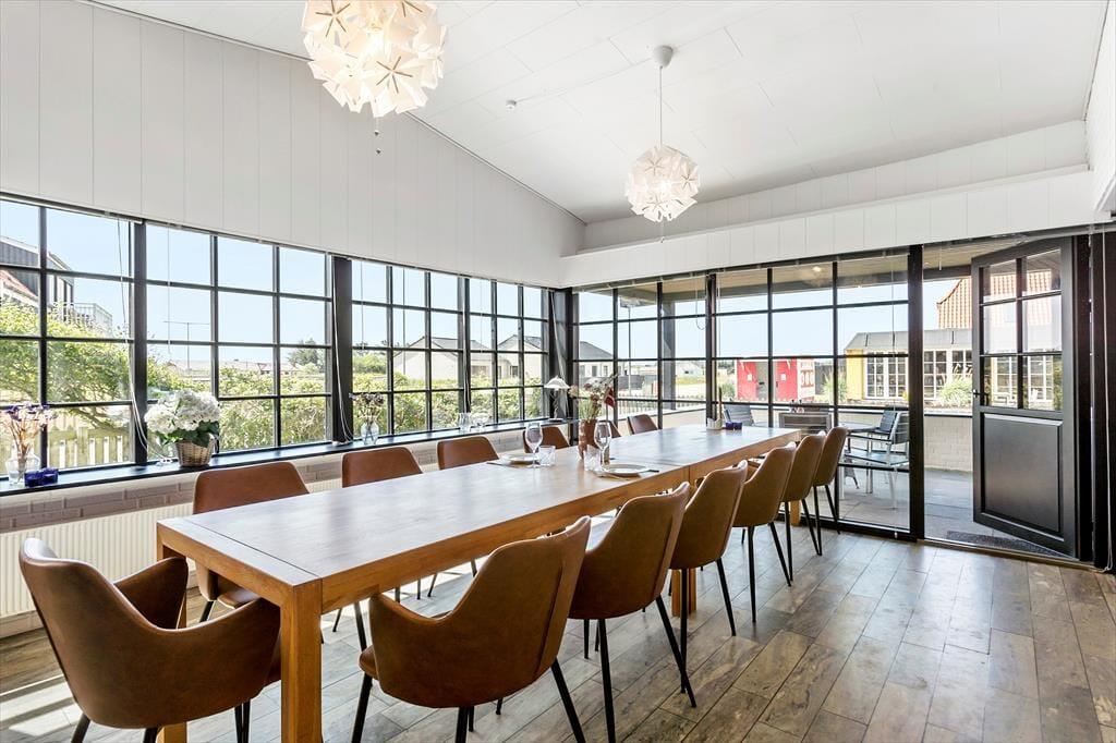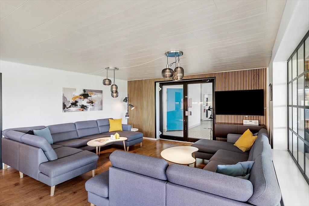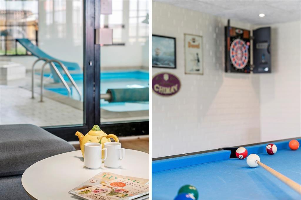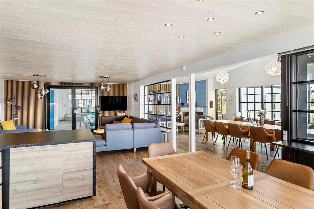 Sommerhuset er blevet renoveret i 2022, hvilket tydeligt fremgår af den stilfuldt indrettede opholdsafdeling og flere af de øvrige rum. Inden døre har I hele 339 m2 at brede jer på, og planløsningen passer glimrende til 17 personer. Sengepladserne er fordelt på syv gode soveværelser, der alle er udstyret med tv, og badeværelser er der hele fire af foruden et gæstetoilet og et separat baderum. Et af badeværelserne ligger som del af poolafdelingen, der byder på spabad, sauna og swimmingpool med rutsjebane. Når I ikke bruger tiden her på wellness og leg, kan I spille pool og dart i aktivitetsrummet – eller mødes til lækre middage, filmaftener og andre hyggestunder i husets flotte stue. Et moderne og veludstyret køkken er en integreret del af opholdsmiljøet, og her er der god plads, så I kan nemt gøre madlavningen til et hyggeligt fællesprojekt.