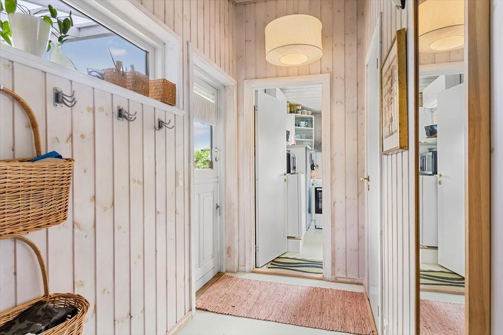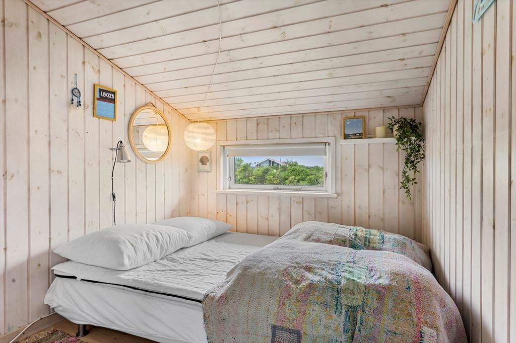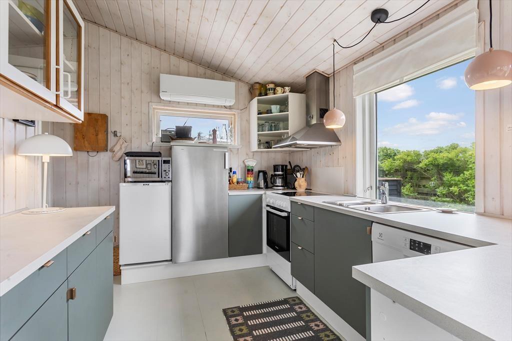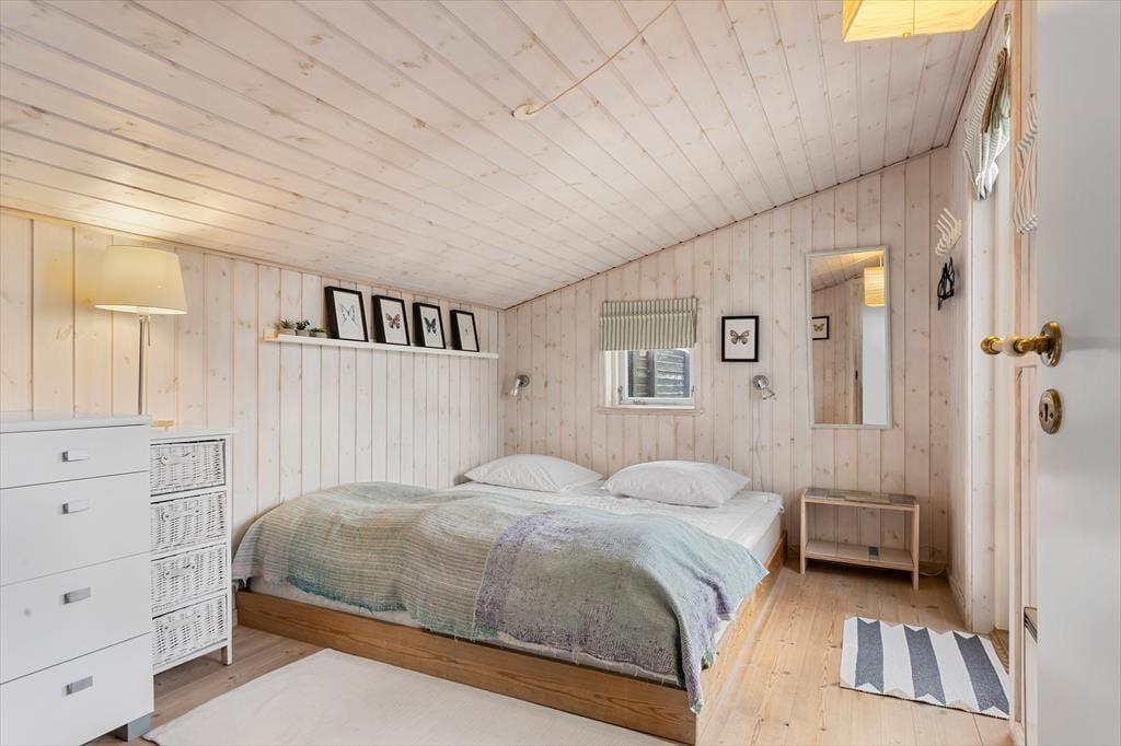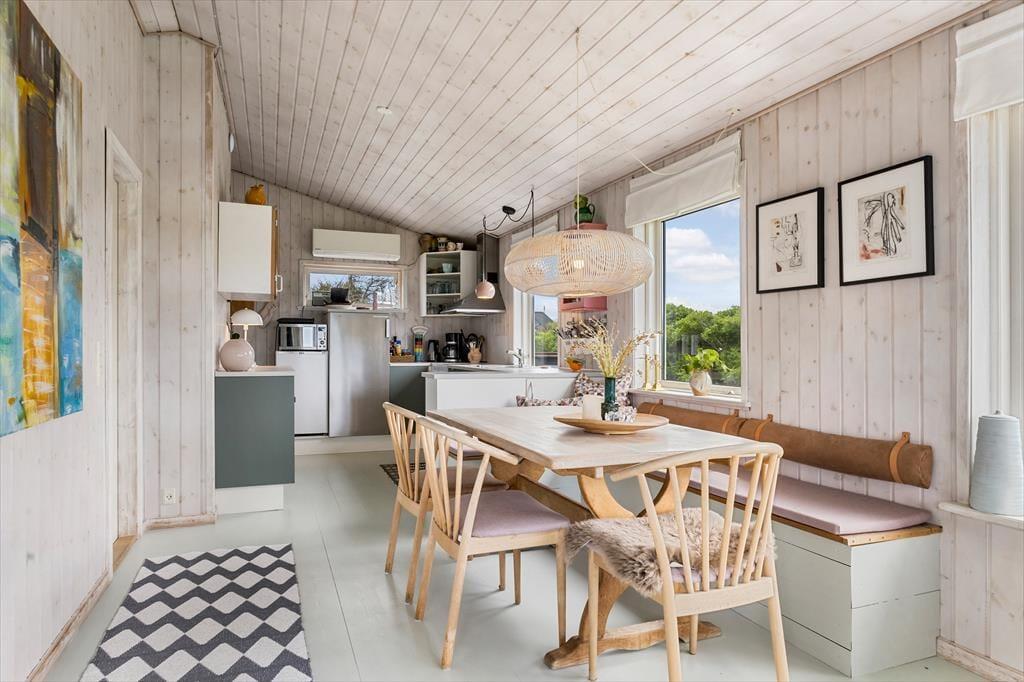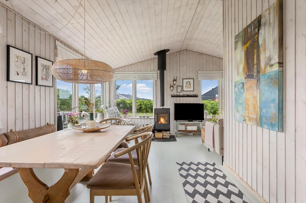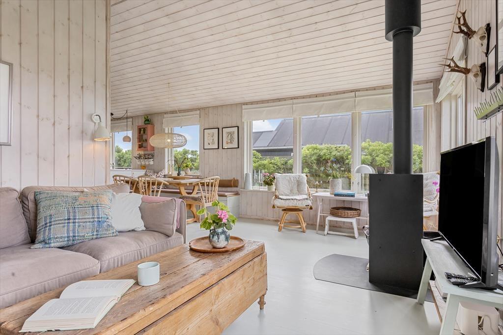 De lyse trævægge, det pæne møblement og den hyggespredende brændeovn er alt sammen med til at give huset en rar atmosfære, så I hurtigt kan føle jer hjemme og mærke feriefreden sænke sig. Det øger også sommerhusromantikken, at I kan se lige ud på havens hybenbuske gennem stuevinduerne – der for øvrigt også sørger for et godt lysindfald i løbet af dagen. Et fladskærms-tv står lige ved sofaen, hvis I er i humør til en tilbagelænet filmaften, og I kan også samles ved spisebordet for at hyggesnakke og spille kort i timevis. I det åbne køkken er der opvaskemaskine, mikroovn og andre gode hvidevarer, der gør det nemt at trylle små og store feriemåltider frem. Et badeværelse med bruser og vaskesøjle ligger lige ved entréen, og når det er sengetid, har I tre gode soveværelser til rådighed.