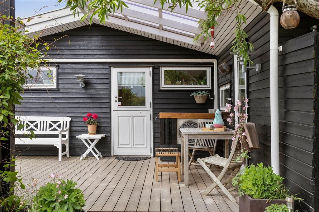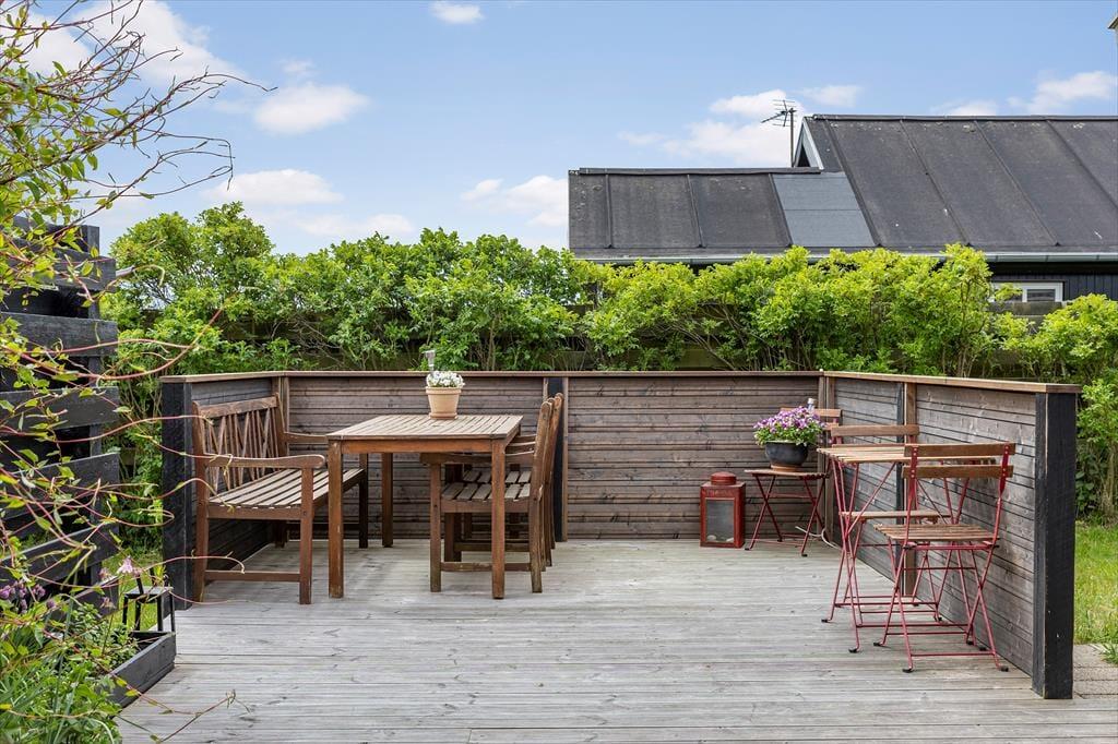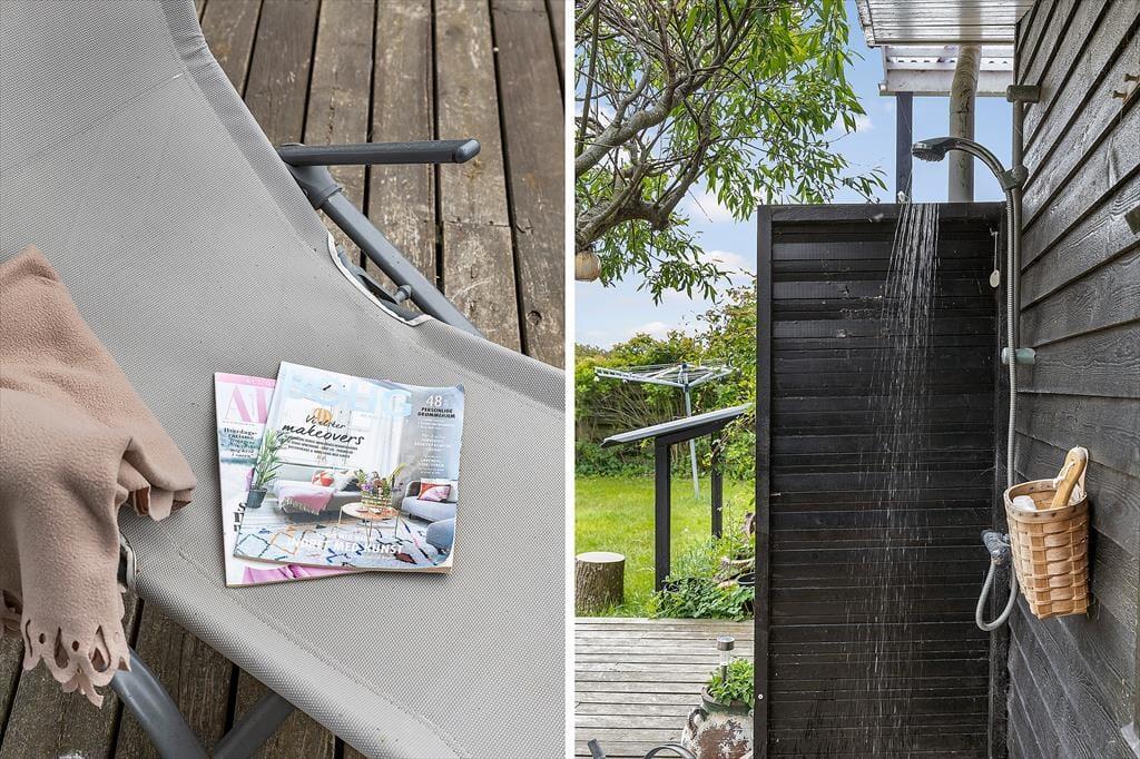 Sommerhusets grund omkranses af tætte buske, og på græsplænen er der god plads til at spille frisbee eller lege med hunden. Trænger I mest af alt til at slappe af, er det helt rigtigt at slå sig ned på det ugenerede og solrige terrassemiljø, der breder sig mod syd og øst. Der er flere gode siddepladser at vælge imellem, inklusiv et overdækket areal, og takket være bruseren kan I starte dagen med et udendørs skyl, mens fuglene kvidrer deres morgensang, og Furreby langsomt vågner.
