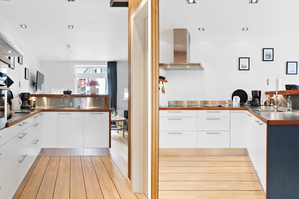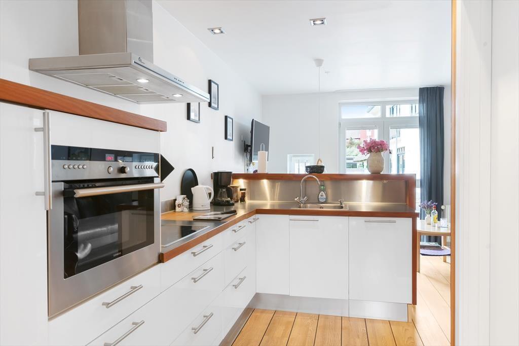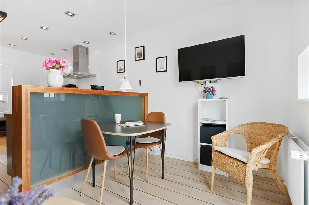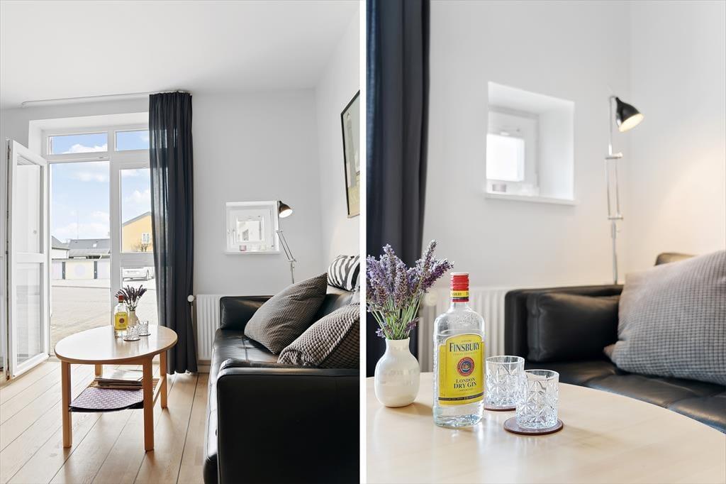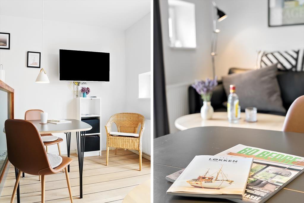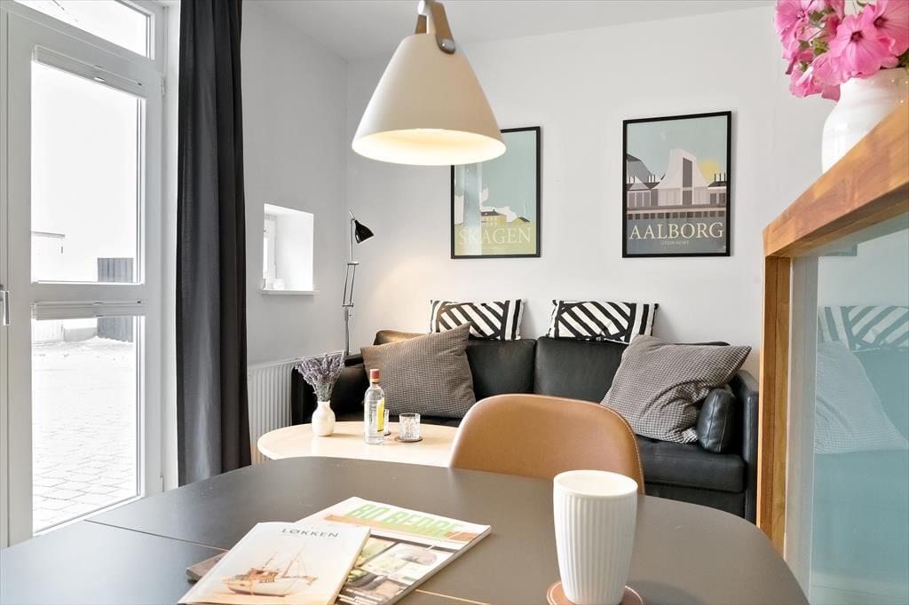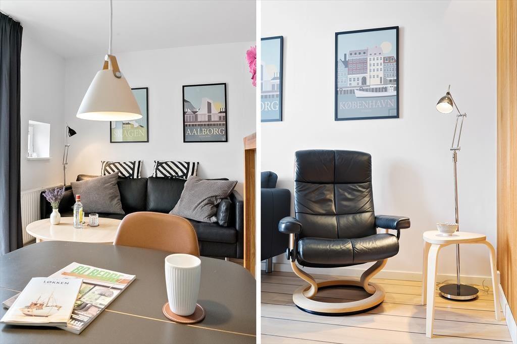 Når I ikke er ude for at nyde livet på stranden eller i Løkkens hyggelige gader, er det skønt at kunne slappe af i lejlighedens hyggelige og velindrettede rammer. Det er en perfekt lejlighed til parferien, for der er dobbeltseng på soveværelset, mens stue og køkken er forenet som et indbydende opholdsrum med sofa, spisebord og fladskærms-tv. I køkkenet har I alt det nødvendige for at lave lækker mad – inklusiv en opvaskemaskine, så I hurtigt kan få afviklet afrydningen efter måltidet. Badeværelset er med bruser, og det fremstår lyst og pænt som resten af lejligheden.