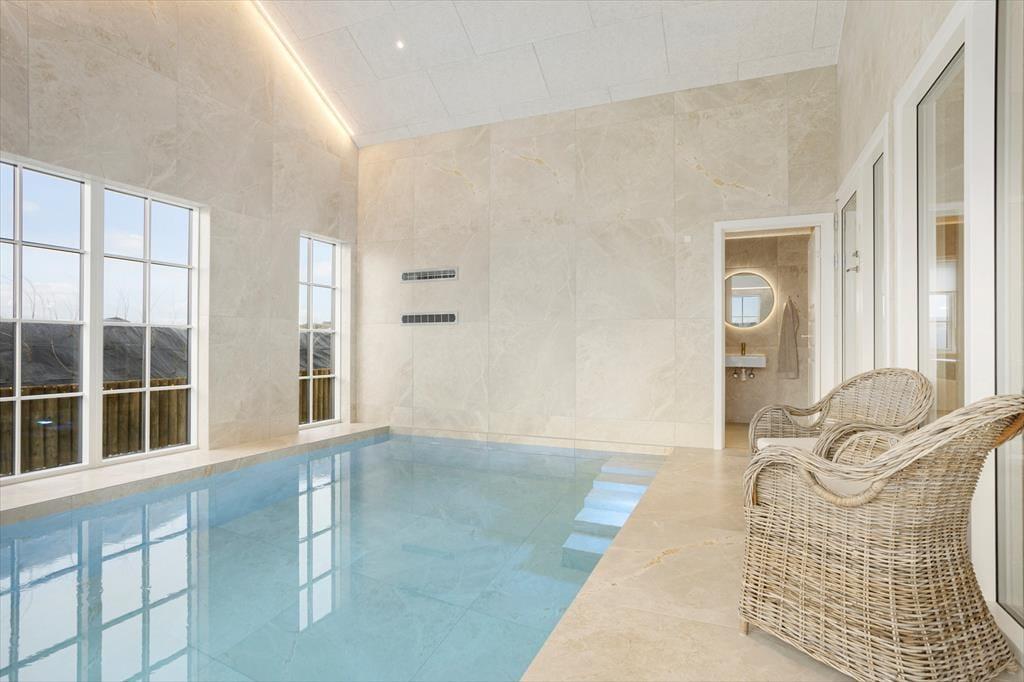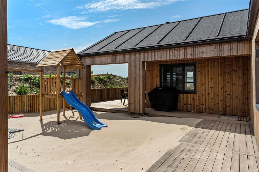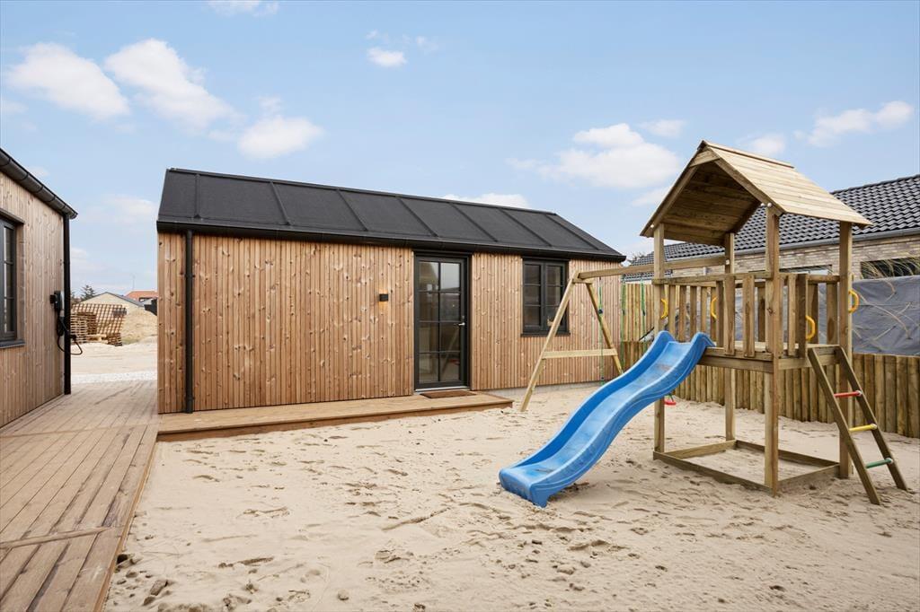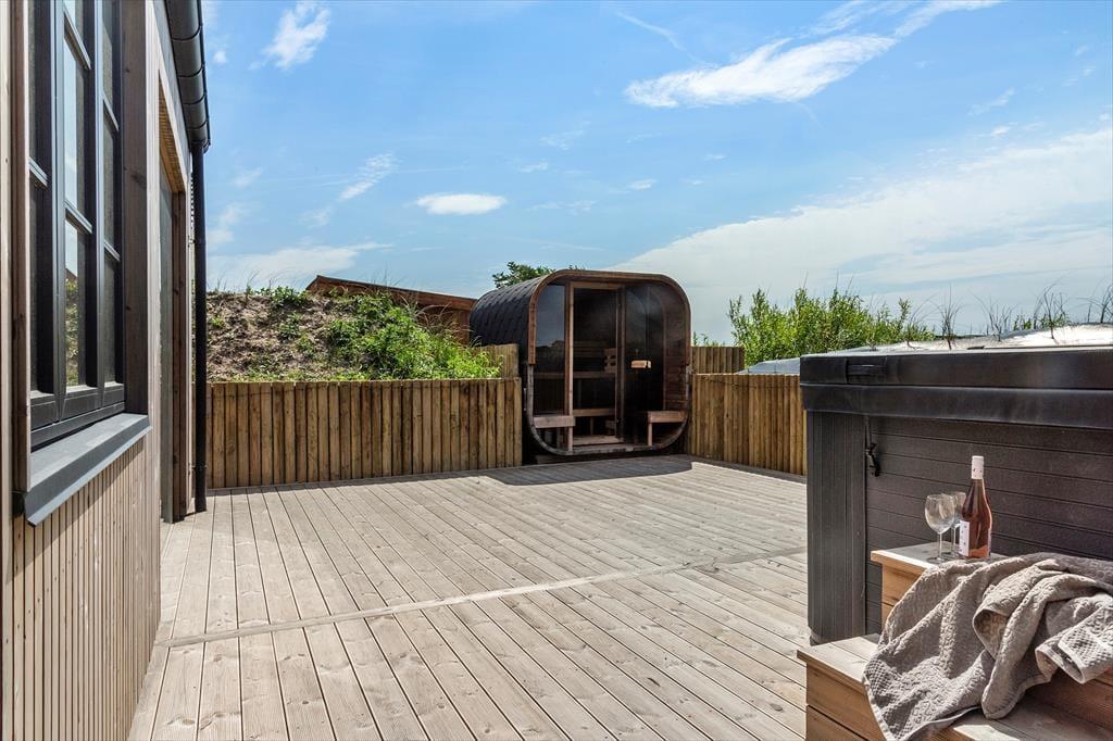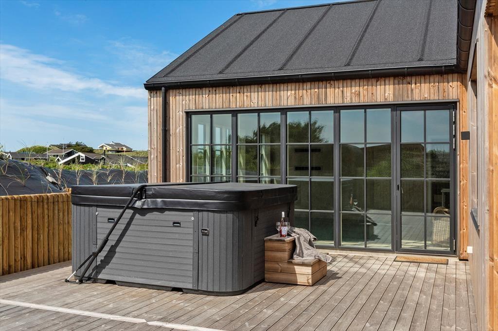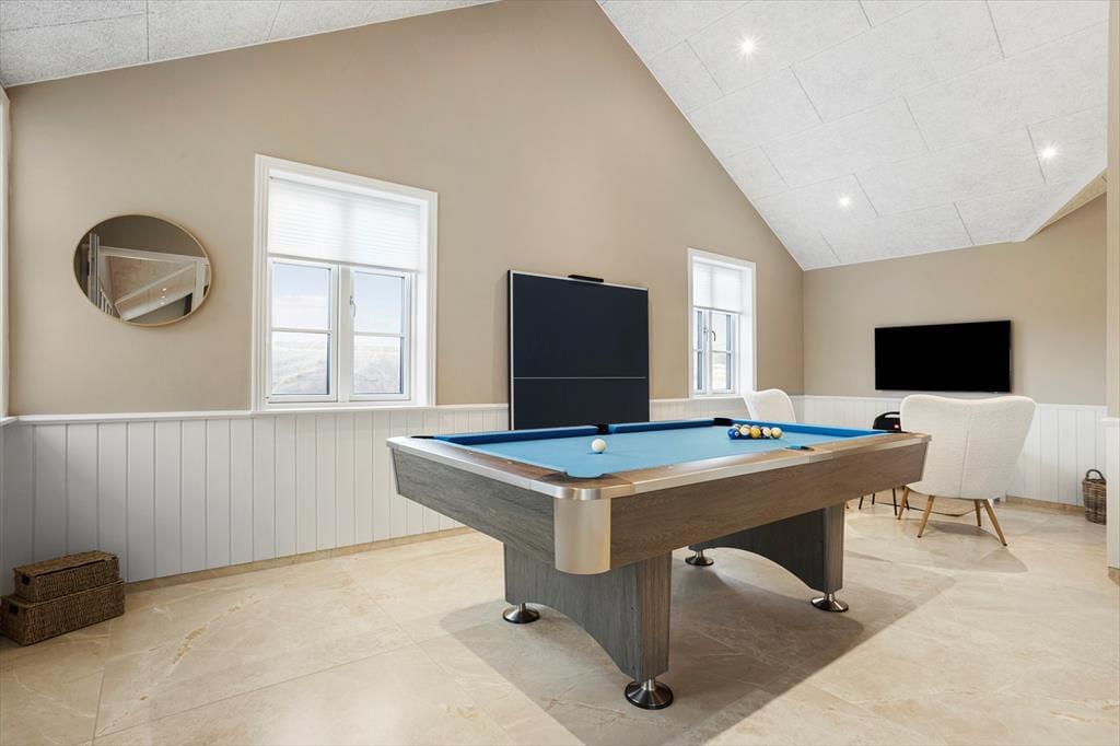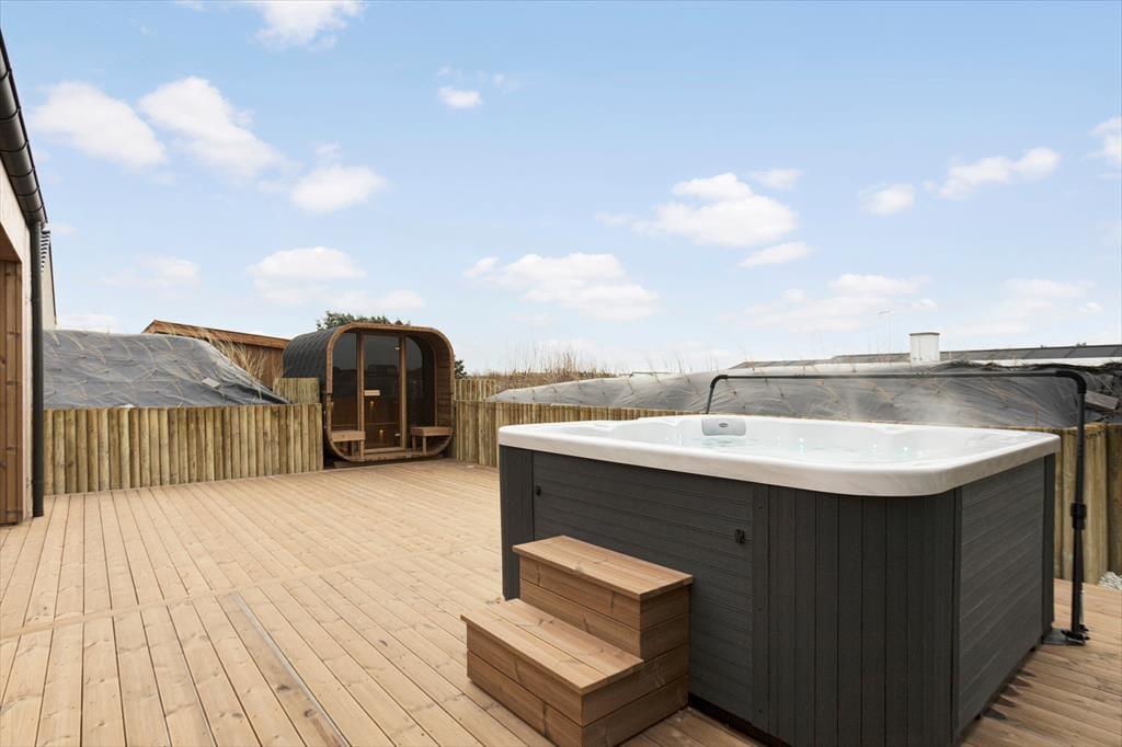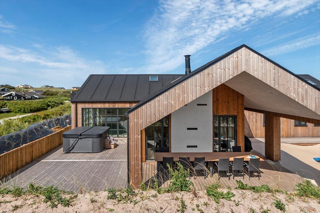 Moderne sommerhus i Løkken med pool, spabad, brændeovn og aktivitetsrum, tæt på strand og by.