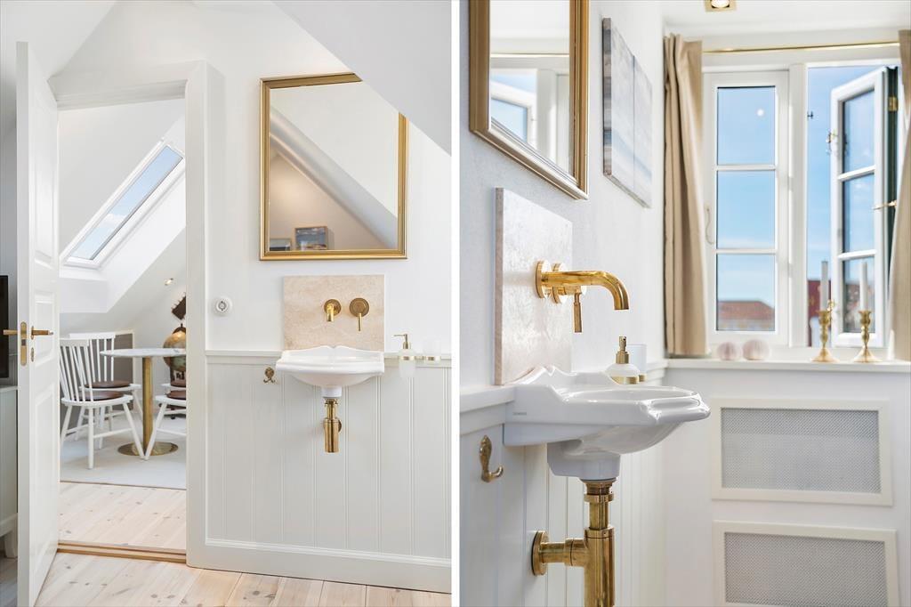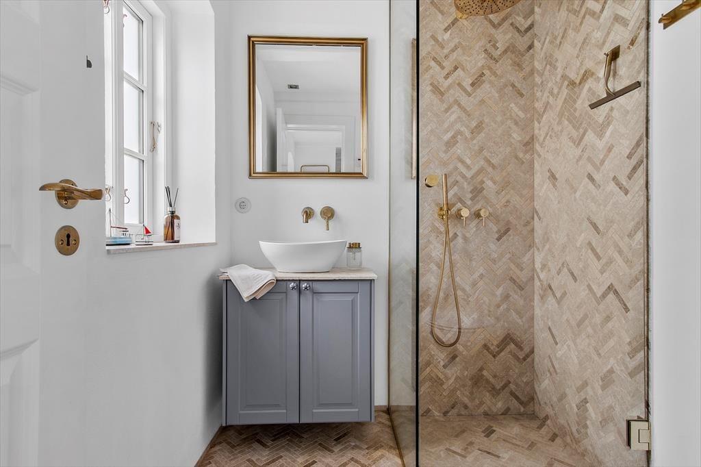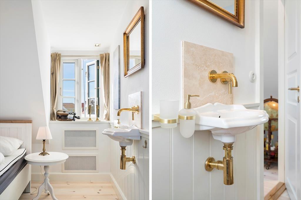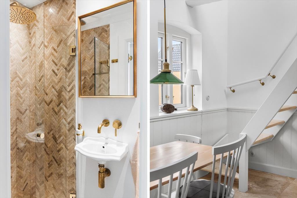 På sommerhusets flotte badeværelser er det skønt at bruse sig, men hvis du lige er vendt hjem fra en strandtur og dagens første dukkert, vil du måske hellere skylle sand og saltvand af under udebruseren. Her kan du stå og bruse dig i husets lukkede solgård, der også fungerer som en skøn ramme for sommerens øvrige udeliv – uanset om du vil drikke morgenkaffe ved havebordet, have en middagslur i en af liggestolene eller nyde de stille aftener med familien, mens tusmørket langsomt sænker sig. Den omsluttende mur skærmer gården godt af, men Løkkens kirketårn og den høje himmel er selvfølgelig til frit skue.