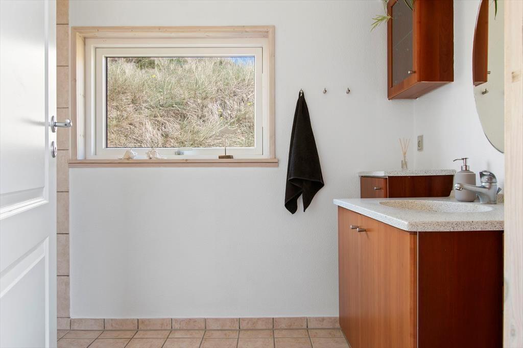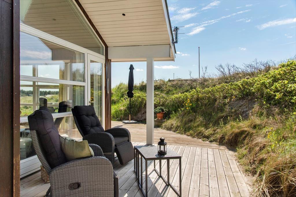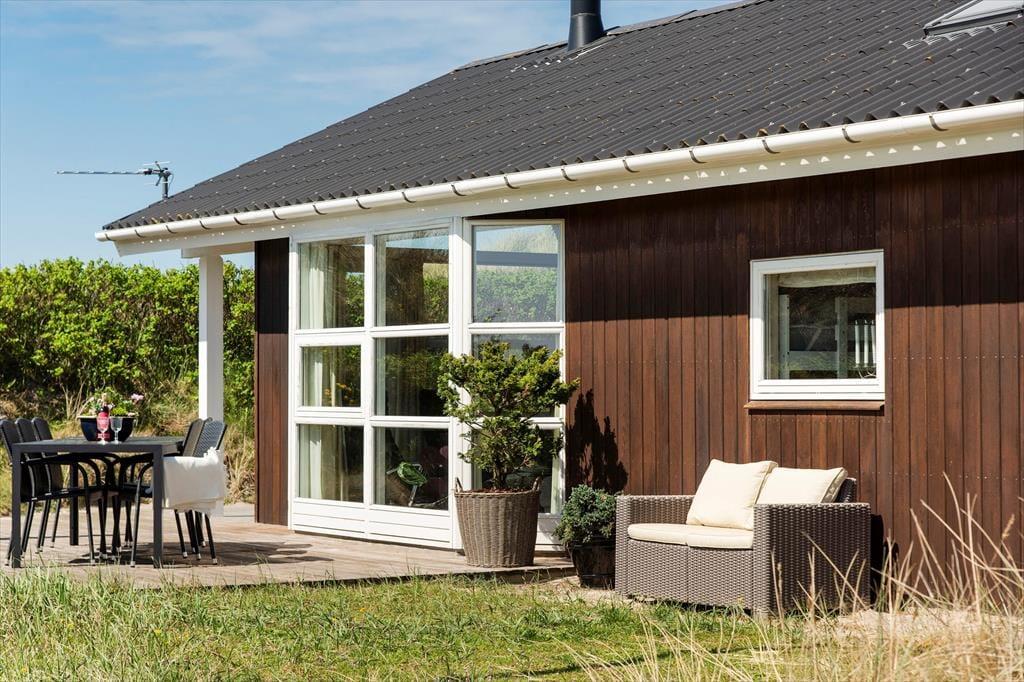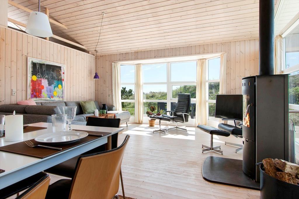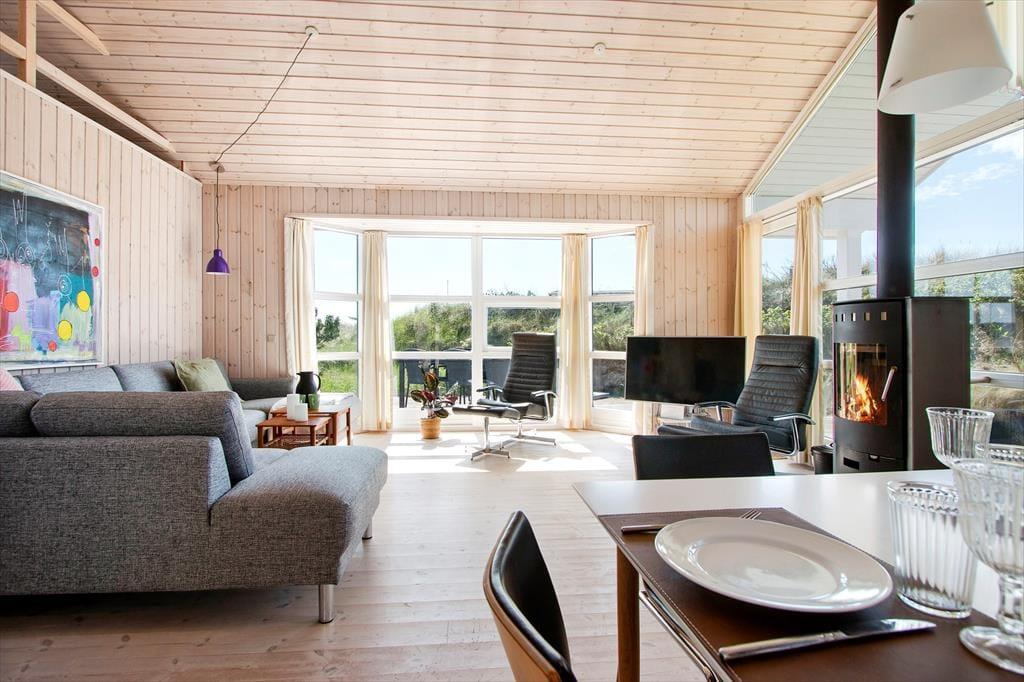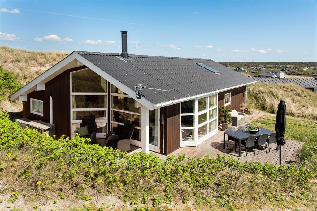 Det klassiske træhus ligger lige ud til klitterne, så du kan kigge ud på bølgende marehalm og hybenbuske, når du hygger dig inden døre. Især stuens store vinduespartier inviterer naturen og en generøs mængde sollys indenfor, så selvom du har mest lyst til at hygge dig inden døre med en god bog eller et familievenligt brætspil, er det stadig til at mærke, at du er på ferie ved vestkysten. På klassisk sommerhusmanér er der brændeovn, hems og loft til kip, og en alkove giver plads til middagslure og avislæsning på langs, hvis ikke du ligefrem får lyst til at overnatte her i de hyggelige omgivelser. Der er nu også godt at sove på de to værelser, der ligger ved siden af hinanden og tæt på brusebadeværelset.