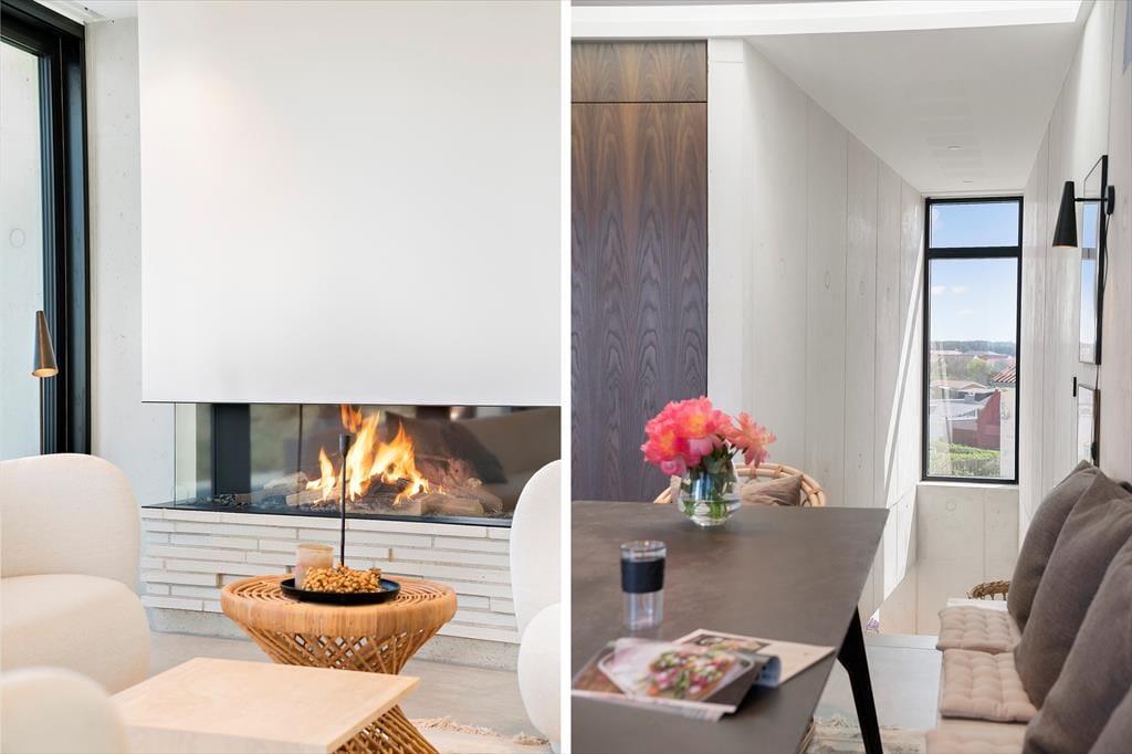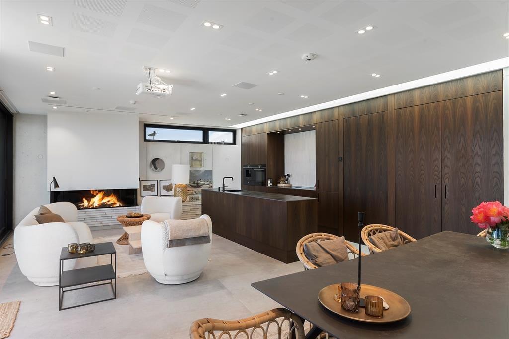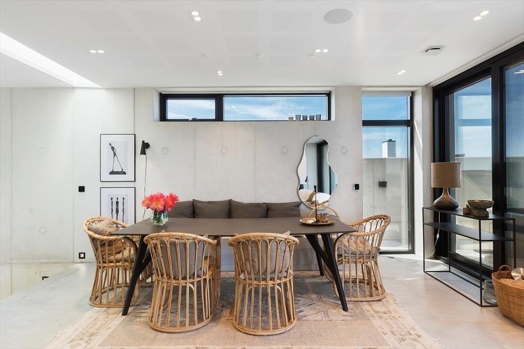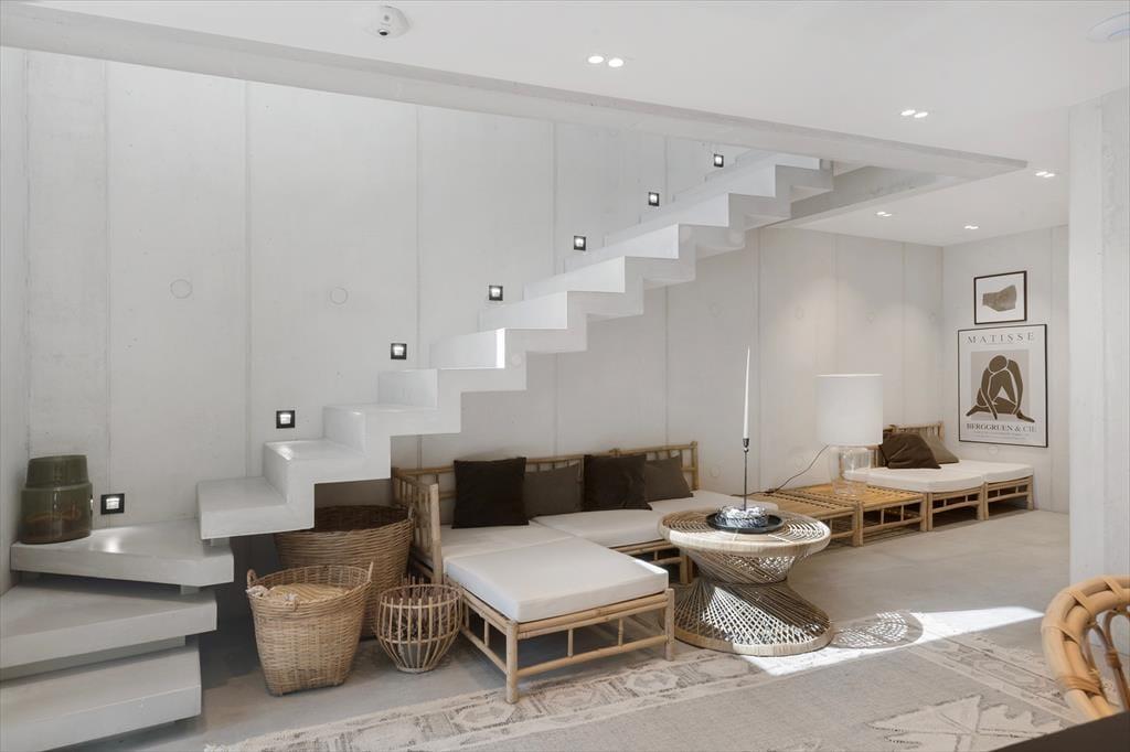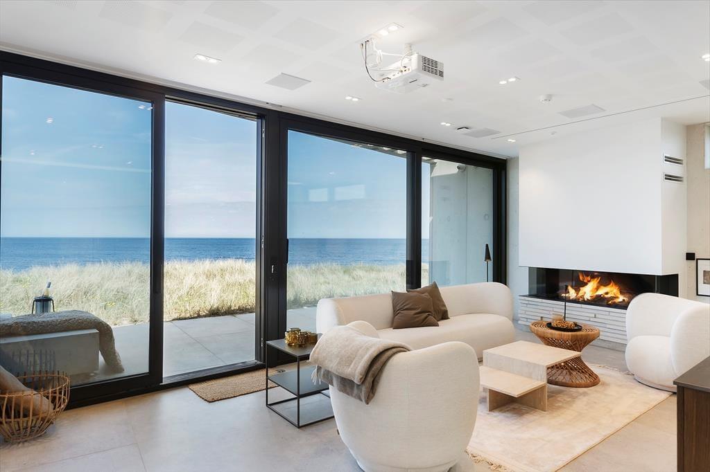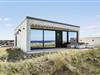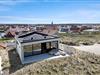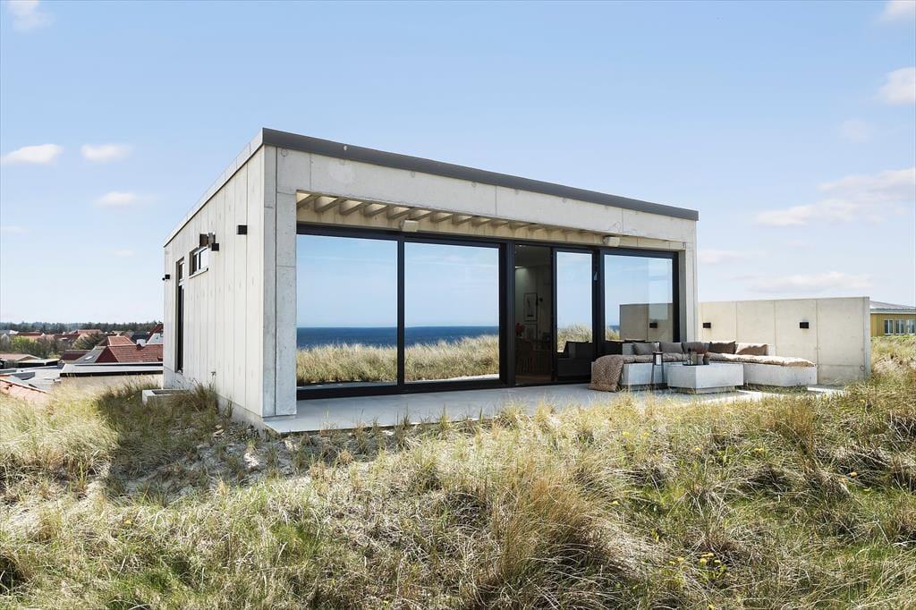 Sommerhuset er bygget ind i klitterne, og med sin stilrene facade i hvid beton spiller det smukt sammen med omgivelserne. Bemærk også, hvordan havet og marehalmen spejles i panoramavinduerne – det er blot én af detaljerne, der viser, at der virkelig er tænkt over at forene arkitekturen med naturen. Inden døre får du selvfølgelig også rig mulighed for at beundre landskabet, navnlig i opholdsafdelingen i husets øverste plan, hvor et kæmpe panoramavindue udgør hele den vestlige væg i opholdsafdelingen. Alt, lige fra det moderne Hanstholm køkken til det hvide sofaarrangement og den smukke spiseplads demonstrerer husets høje kvalitet, og samme niveau gør sig naturligvis også gældende i de øvrige rum. Fordelt på de to etager finder du blandt andet tre soveværelser og to badeværelser, hvoraf det ene er med lækkert badekar. Overalt er der gulvvarme og et behageligt indeklima, så huset fungerer som en skøn feriebolig både sommer og vinter.