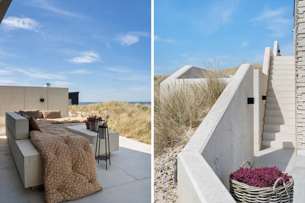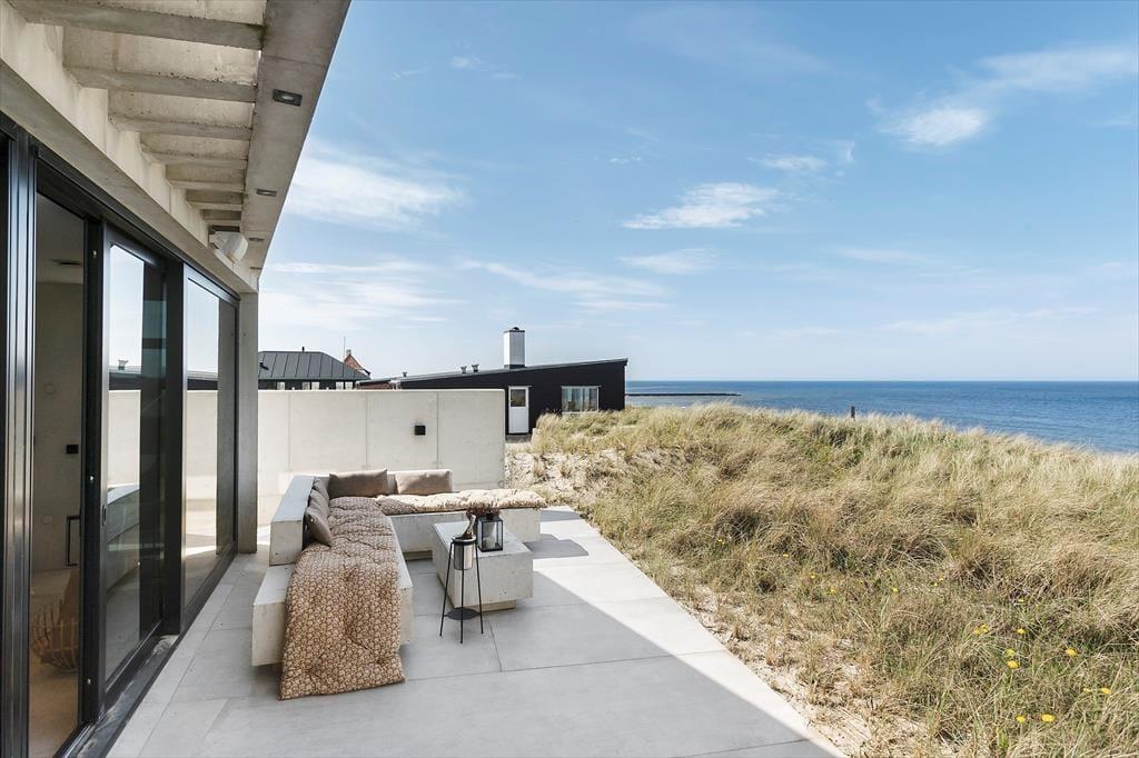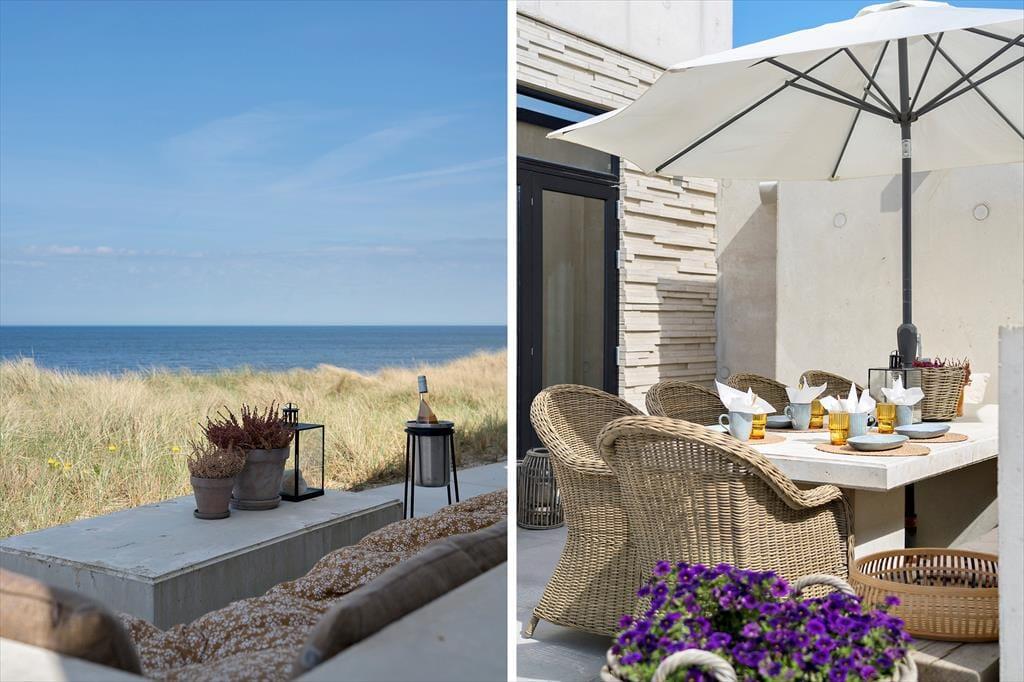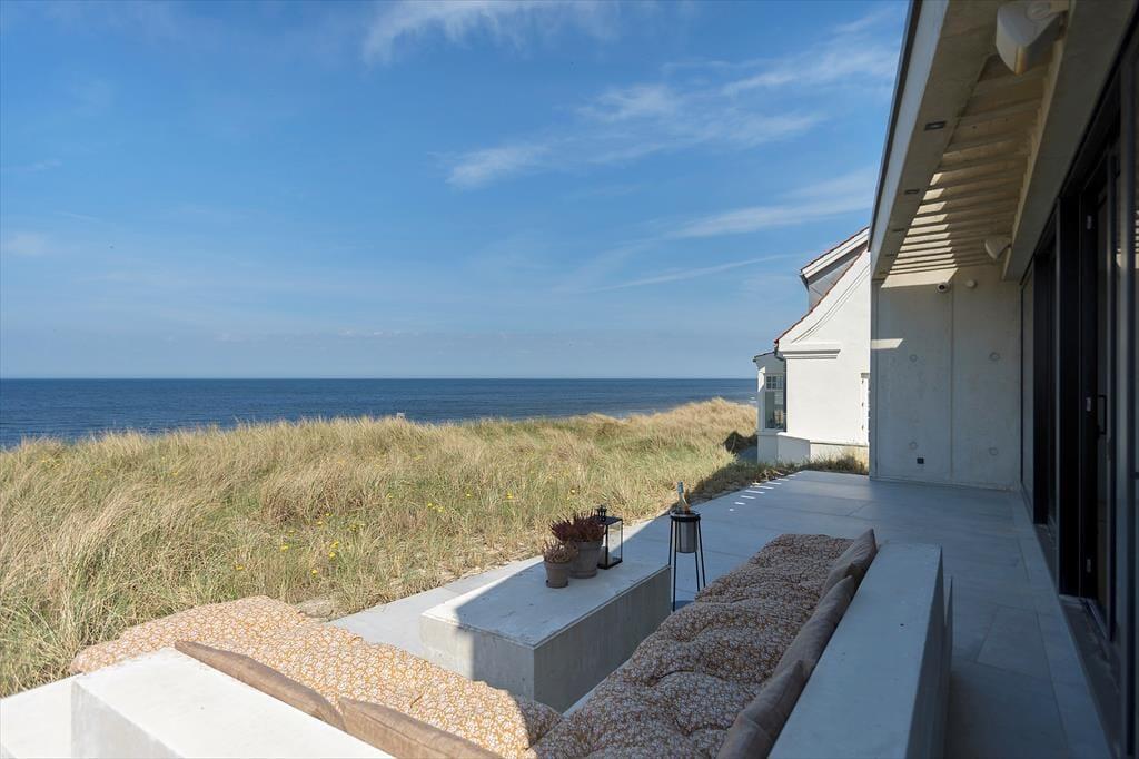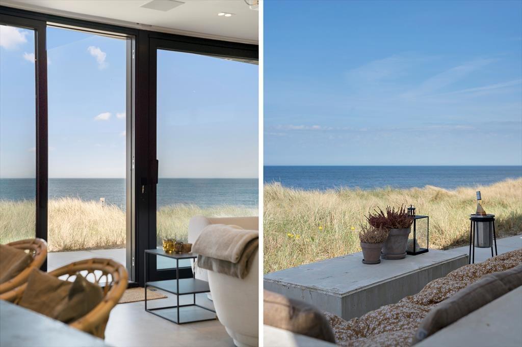 Der er terrasser på begge sider af huset, så det er nemt at finde den helt rette opholdsplads. Det sydøstlige opholdsmiljø er dejligt solrigt først på dagen, og her sørger klitterne og selve huset for læ, hvis det skulle blæse ind fra havet. Panoramaudsigten er til gengæld intet mindre end fantastisk fra den nordvestvendte terrasse, for du sidder lige ud mod den bølgende marehalm og med frit udsyn til hav og høj himmel – og det er selvfølgelig også her, du skal opholde dig, når solen går ned og maler omgivelserne i orange og rosa farvetoner.