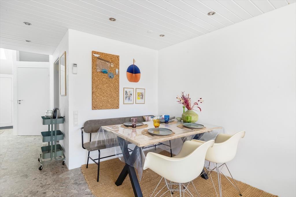 Mere præcist er der tale om at gedigent rækkehus, der er opført i røde mursten og har en velfungerende planløsning til fire personer. Efter seneste renovering har alle rum en lys og indbydende indretning, og der er mange lækre detaljer at bemærke – se for eksempel det stilfulde badeværelse såvel som det store ovenlysvindue, der inviterer solen ind til førstesalens sofahjørne. Også i stueplan er lysindfaldet skønt i det store køkken-alrum, hvor du og familien kan samles til lækre måltider og hygge nær brændeovnen. Er det tid til at sige godnat, kan du gå til ro på et af de tre soveværelser, hvoraf et ligger i stueplan og to på førstesalen.