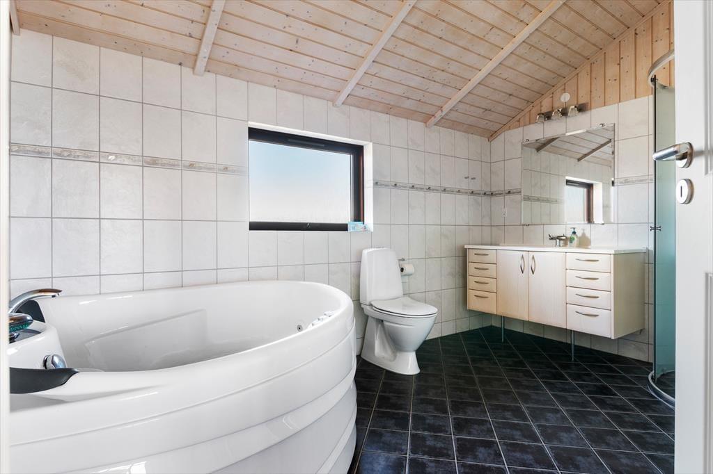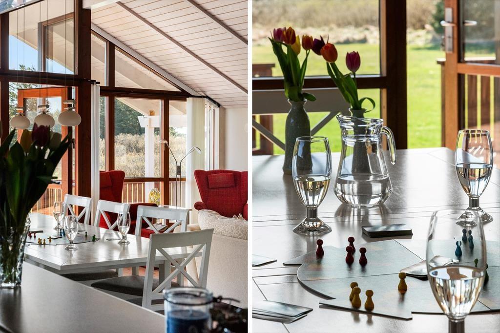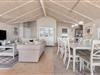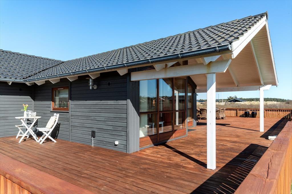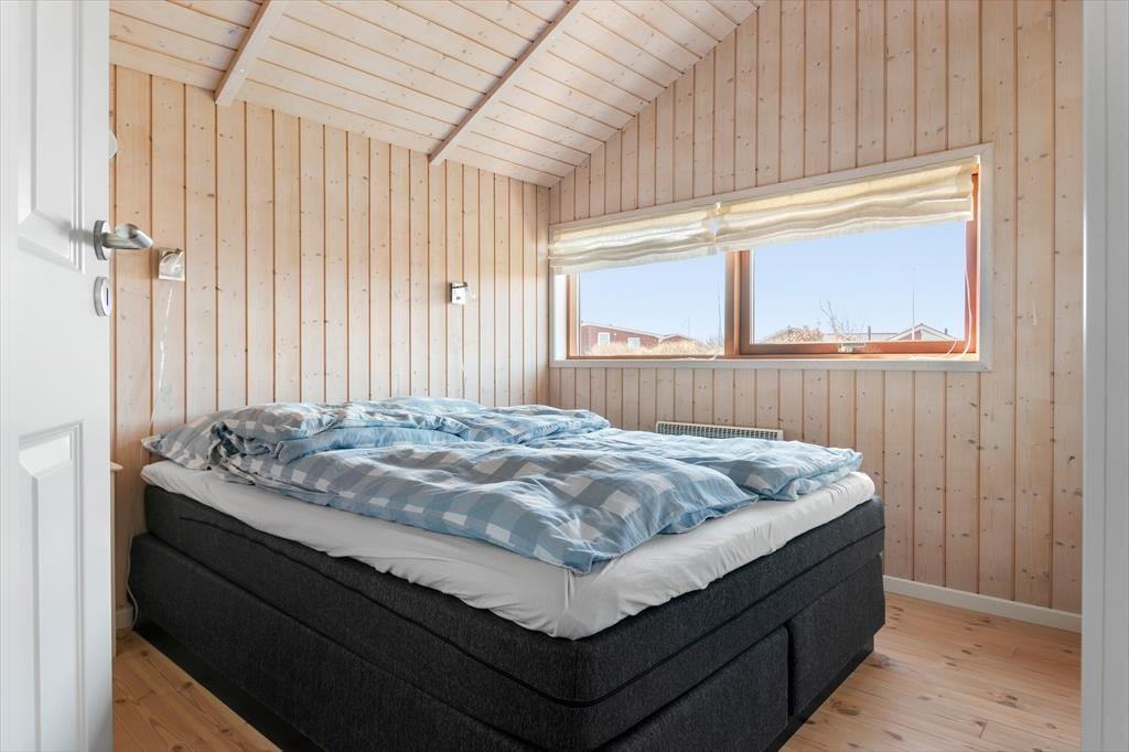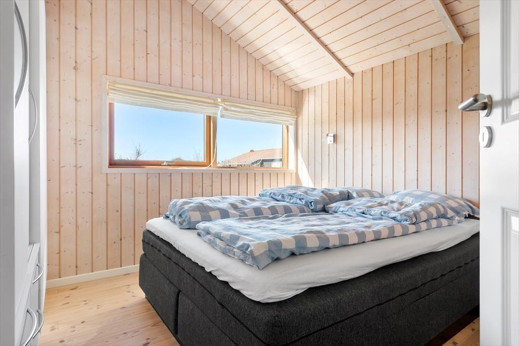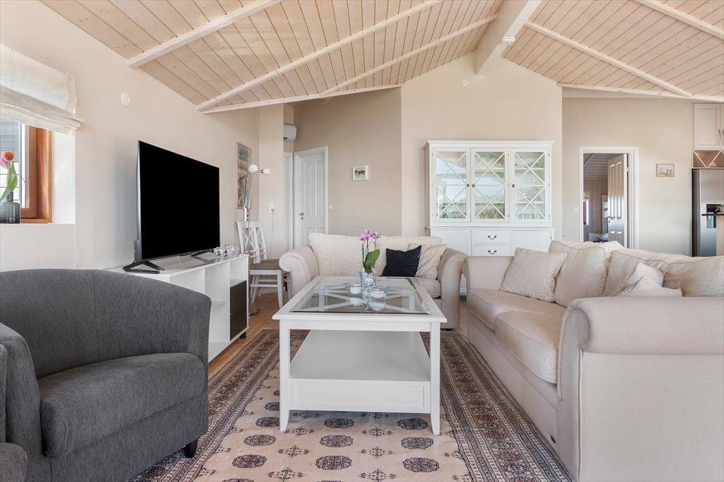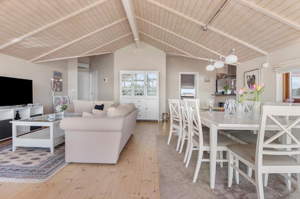 Dette moderne sommerhus er lyst og indbydende med højt til loftet og store vinduespartier, der sikrer et skønt lysindfald dagen igennem. Planløsningen er praktisk og gennemtænkt, med plads til hele familien. I stue og køkken er der åbent opholdsmiljø, så I kan samles om madlavningen og hyggelige samtaler ved spisebordet eller foran brændeovnen. De tre rummelige soveværelser giver god plads til otte personer. Huset har også to badeværelser, og et praktisk bryggers.