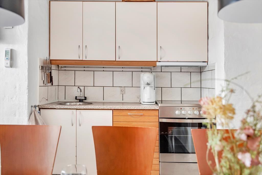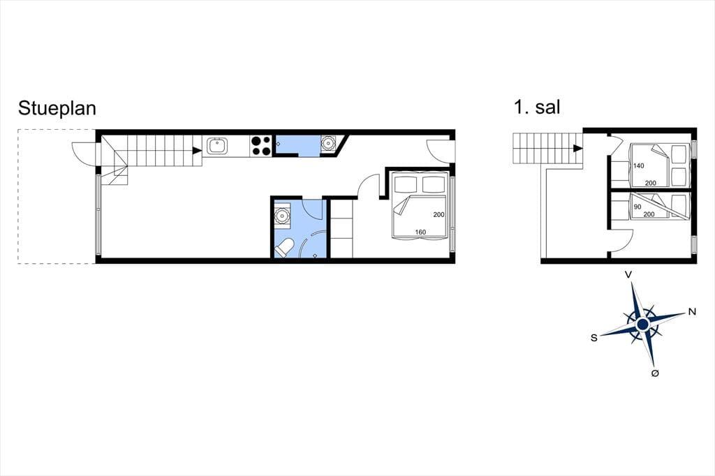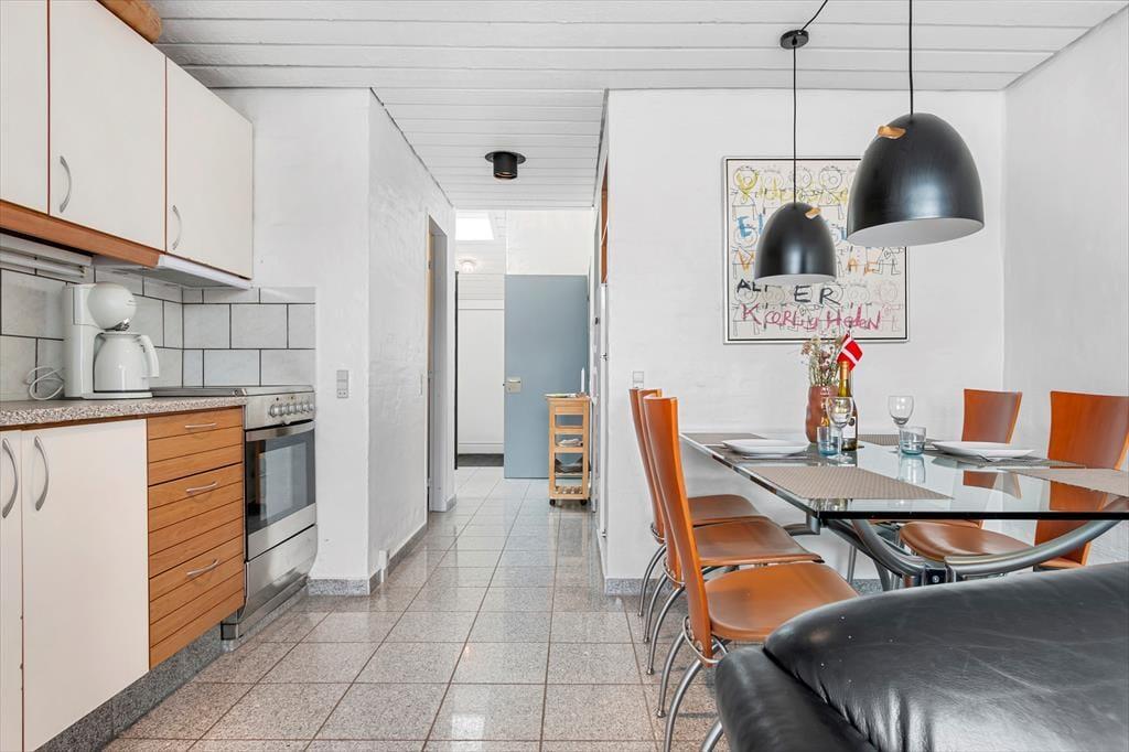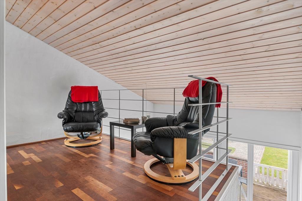 Når du bor så tæt på både bymidten og stranden i Løkken, kan badeture, shopping, galleribesøg og surfing sikkert hurtigt komme til at fylde en god del af tiden – men det er nu også fristende bare at tage det med ro derhjemme i sommerhuset. Planløsningen breder sig over to plan, og to af soveværelserne ligger på første sal, mens det tredje er placeret i stueplan lige ved entréen. Badeværelset er opdelt, så der er separat bad og toilet, og et lille, men funktionelt køkken er integreret med stuen, så det er nemt at smutte hen for at brygge mere kaffe eller starte på at forberede aftensmaden. Både spisebordet og sofaafdelingen er hyggelige steder at samles, og hvis du trænger til en rolig stund, kan du slå dig ned med en god bog i en lænestol på førstesalens repos.