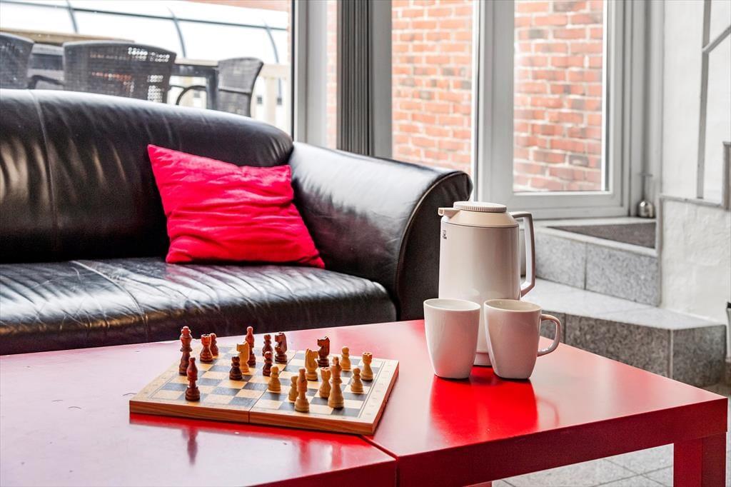 Fra stuen har du direkte adgang til en dejlig terrasse, hvor sommerens små og store måltider kan indtages med kig til himlens drivende skyer. Terrassen vender ind mod rækkehusbebyggelsens fællesgård, så her er ganske fredeligt, hvis du vil blive hængende hele formiddagen for at løse krydsogtværs og drikke iskaffe i solen. I gården er der græsklædte arealer og fliseområder med bord-bænke-sæt, men det allerbedste er nu den overdækkede swimmingpool, hvor du kan svømme baner eller tage et opkvikkende dyp, når du vender hjem fra dagens udflugter. Bemærk, at poolen er uopvarmet, og den kan frit benyttes fra omkring påske til omkring uge 42.
