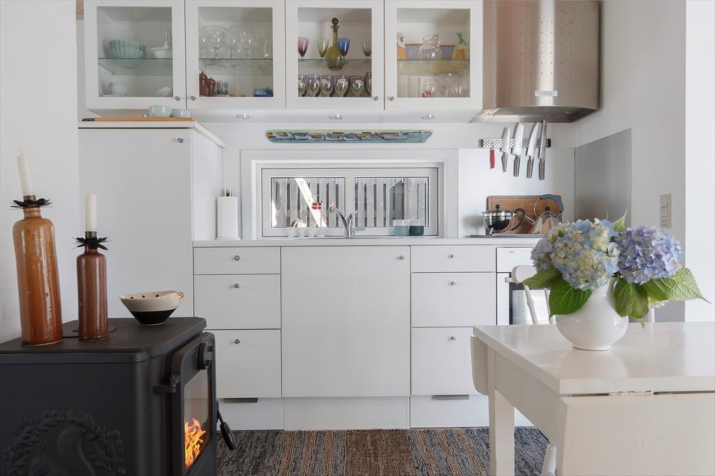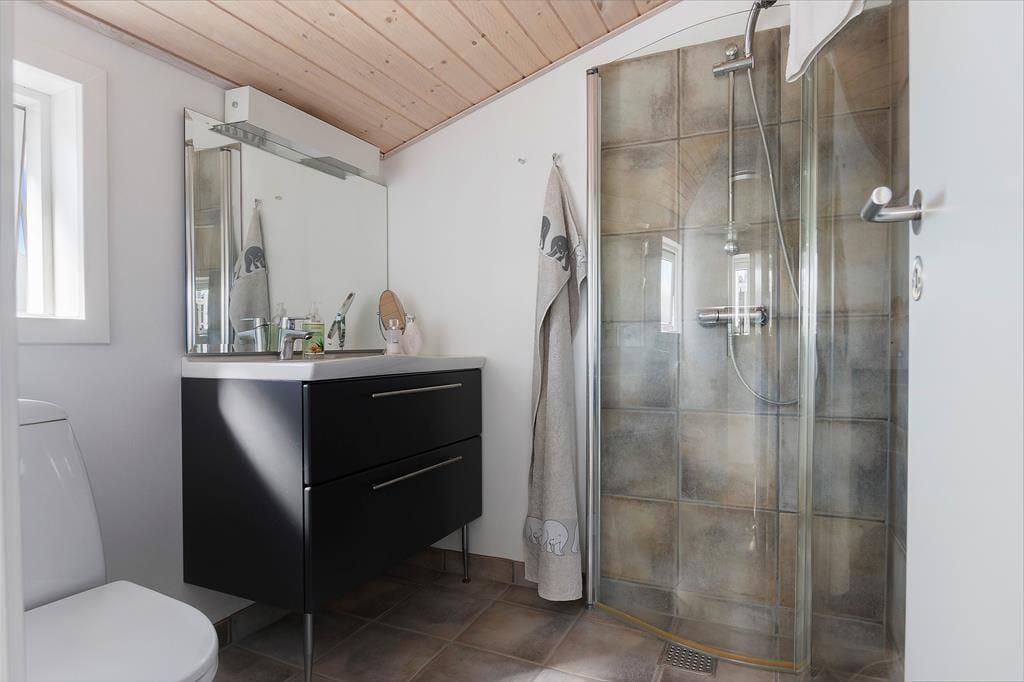Når du træder ind i dette flot indrettede sommerhus, mødes du af et lyst og åbent rum med store vinduespartier, der lukker dagslyset ind og skaber en indbydende atmosfære. Sommerhuset rummer et hyggeligt soveværelse og en stue med en varmende brændeovn, der indbyder til afslappende aftener med en god bog eller en hyggelig film. Køkkenet er veludstyret og åbent, så du kan nyde samværet med familien, selv når du står og laver mad. De store vinduer giver en smuk udsigt til haven og de grønne omgivelser, mens den udendørs vandhane er praktisk til at skylle sandet af efter en tur på stranden.