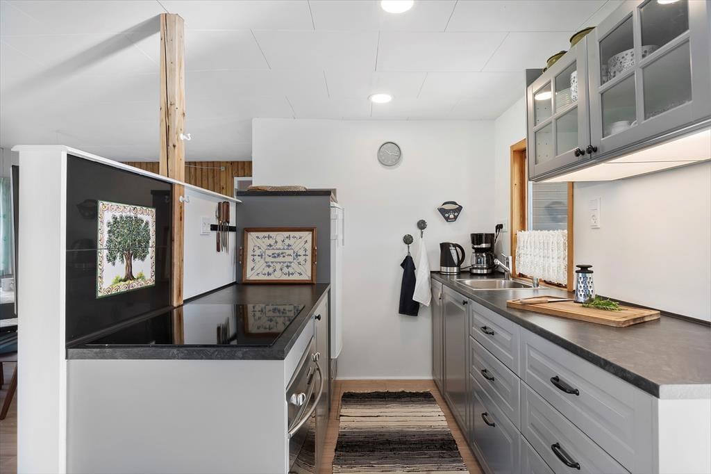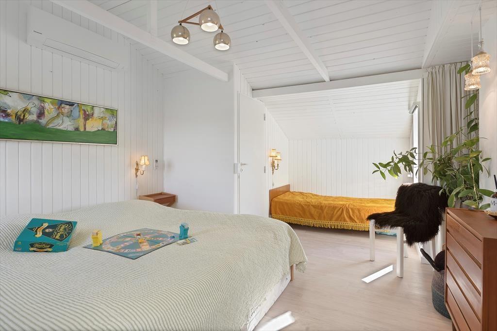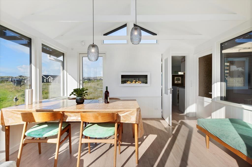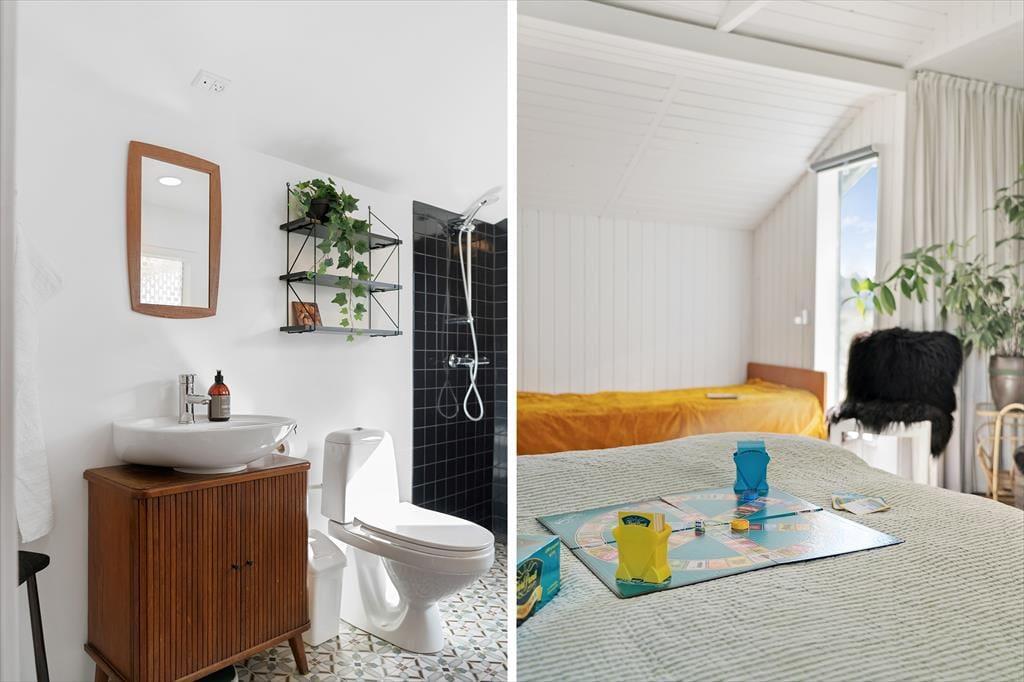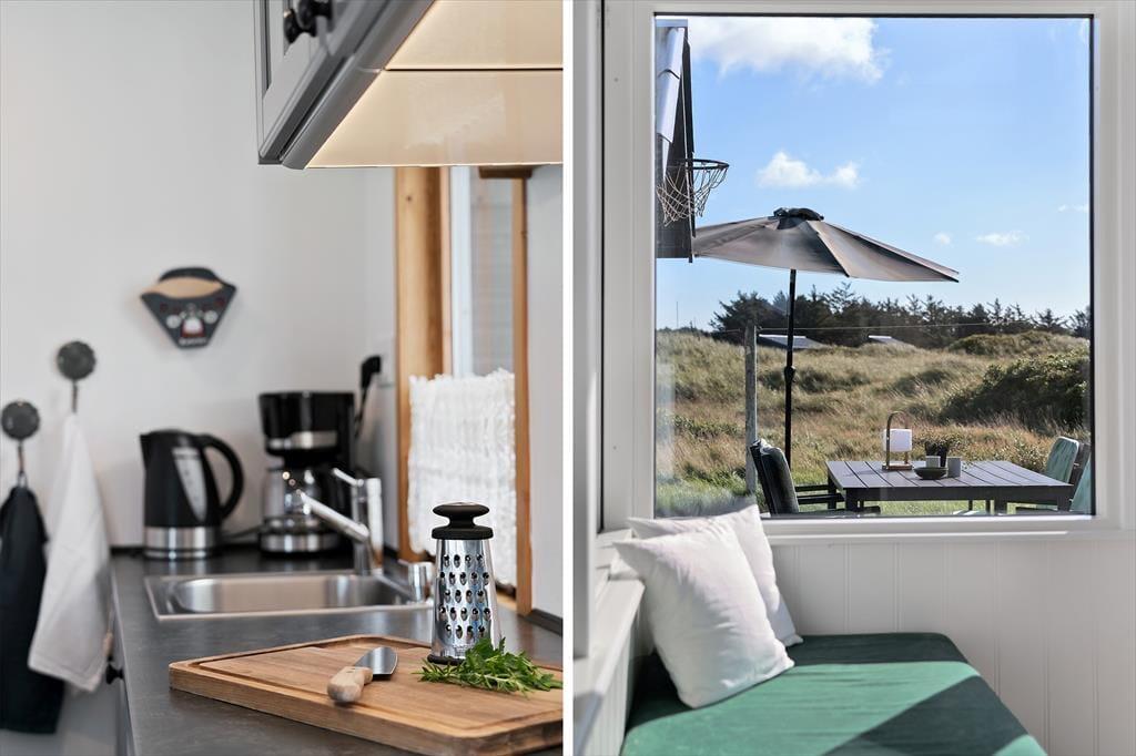Sommerhuset byder på en charmerende og lys indretning, hvor hyggelige kroge og praktiske løsninger gør det nemt at slappe af og nyde samværet. Inde i huset finder du to gode soveværelser og et badeværelse med behagelig gulvvarme, som gør morgenerne ekstra rare. Køkken og stue er integreret i et åbent og indbydende opholdsområde, hvor store vinduer lukker masser af lys ind og inviterer naturen med indenfor. Ved siden af stuen kan du træde ud i en hyggelig udestue, hvor en biopejs spreder varme og atmosfære – perfekt til de stille aftener med en kop varm kakao og en god bog. Udestuen forlænger sæsonen og er ideel, uanset om du vil nyde de sidste solstråler i foråret eller lune efterårsaftener. Huset rummer også et praktisk vaskerum med indgang fra terrassen, så det er let at vaske sandet af efter en tur til stranden. Annekset, der ligger separat fra hovedhuset, har sit eget soveværelse og gæstetoilet, hvilket giver ekstra plads og privatliv, hvis du har gæster eller større børn med på ferie. Dette skaber en perfekt balance mellem fælles hygge og mulighed for at trække sig tilbage og nyde roen.