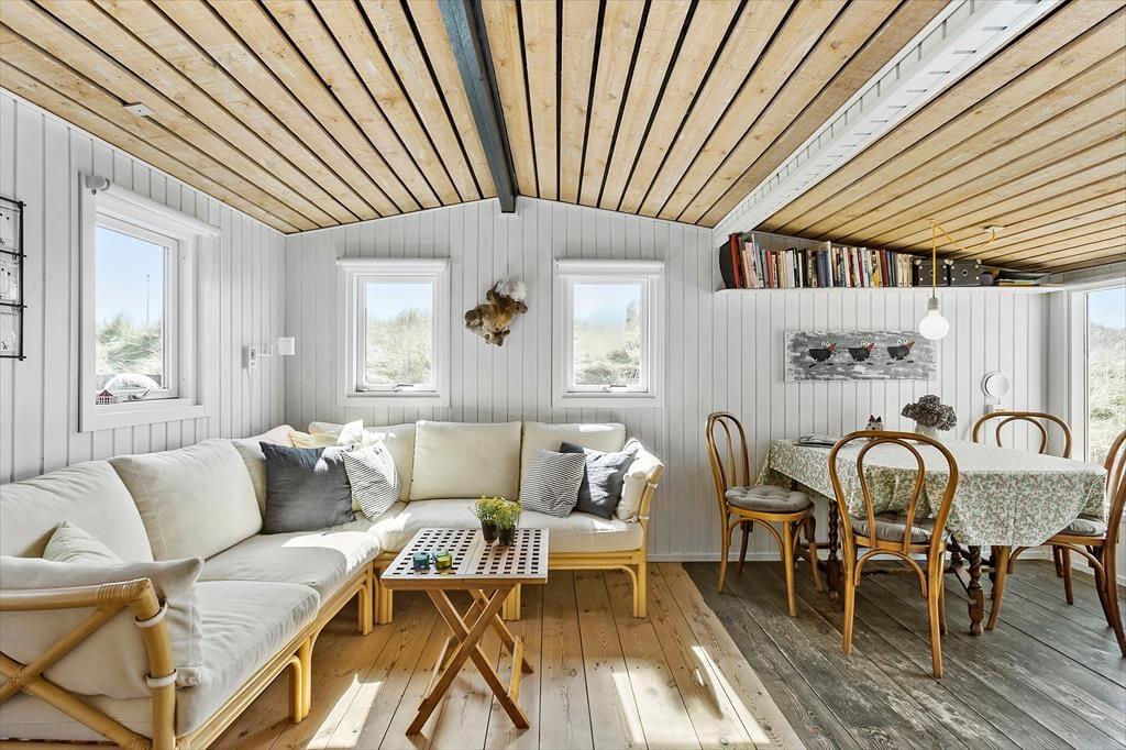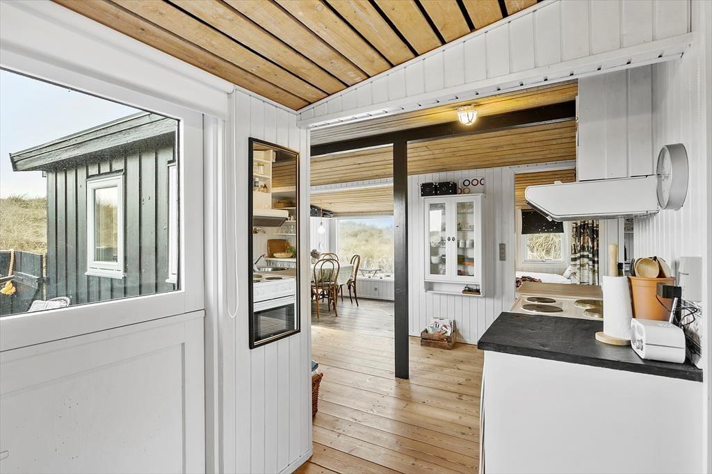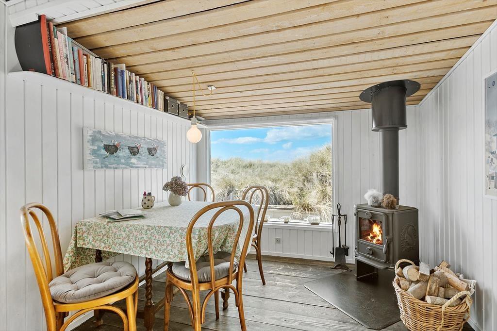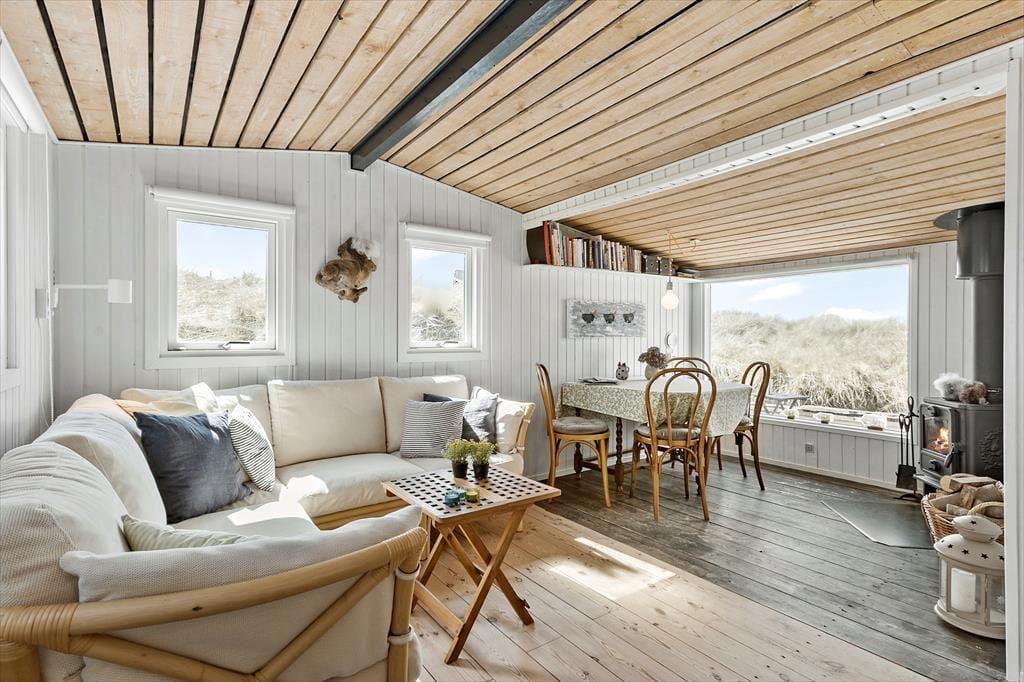 Dette charmerende sommerhus er indrettet med et dejligt lysindfald og en varm atmosfære, som indbyder til hyggelige feriedage. Stuen, der har store vinduer med kig til klitterne, er sommerhusets naturlige samlingspunkt, hvor du kan nyde lange, afslappede aftener. Her finder du også en brændeovn, som spreder varme og skaber en stemning af ro og nærvær på kølige dage. Køkkenet ligger i åben forbindelse til stuen, så du kan tilberede lækre måltider og stadig være en del af samtalen ved spisebordet. Med to gode soveværelser er her plads til både familien eller vennerne, og badeværelset er funktionelt og velholdt. Alt i sommerhuset er holdt i en enkel og hyggelig stil, der skaber de perfekte rammer for at koble af fra hverdagen.