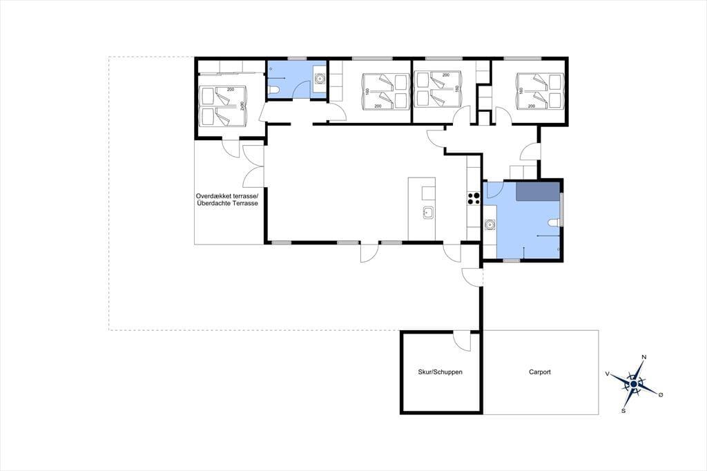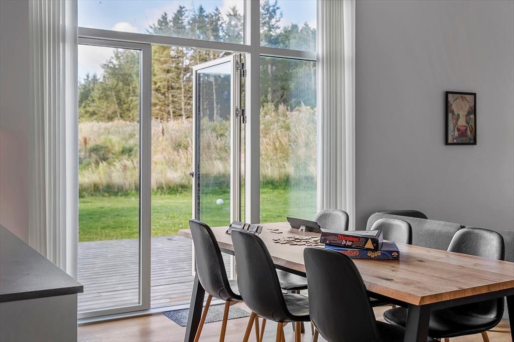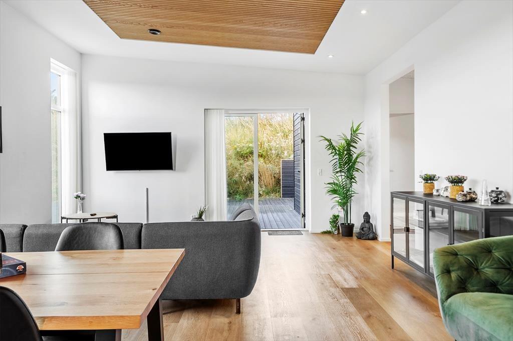 Allerede når du træder indenfor i sommerhuset, mødes du af en skøn fornemmelse af lys og luft. Det naturlige lysindfald strømmer ind gennem de store vinduespartier og fremhæver de lyse materialer og den åbne indretning. Husets hjerte er opholdsrummet, hvor køkken og stue er integreret i ét stort, sammenhængende rum. Her kan hele familien samles om madlavningen, spille brætspil ved spisebordet eller nyde en rolig stund i sofaen. De fire gode værelser giver rigeligt med soveplads og privatliv, hvis I er flere afsted, og med to badeværelser og i alt to toiletter er komforten i top. Uanset om ferien står på afslapning eller aktivitet, danner dette velindrettede sommerhus en skøn ramme for jeres tid sammen.