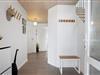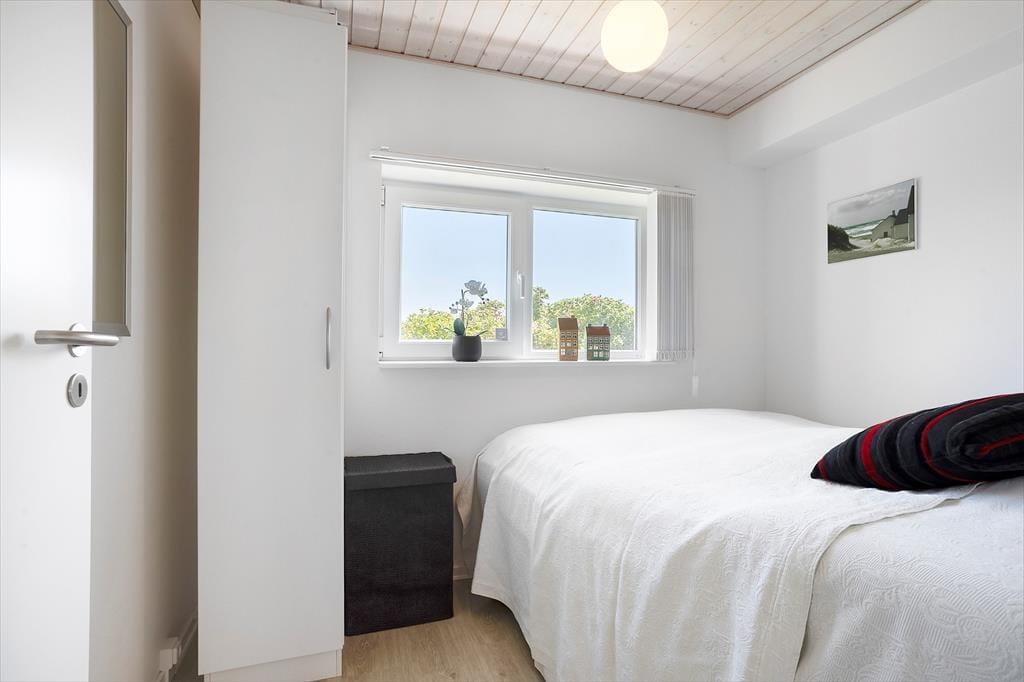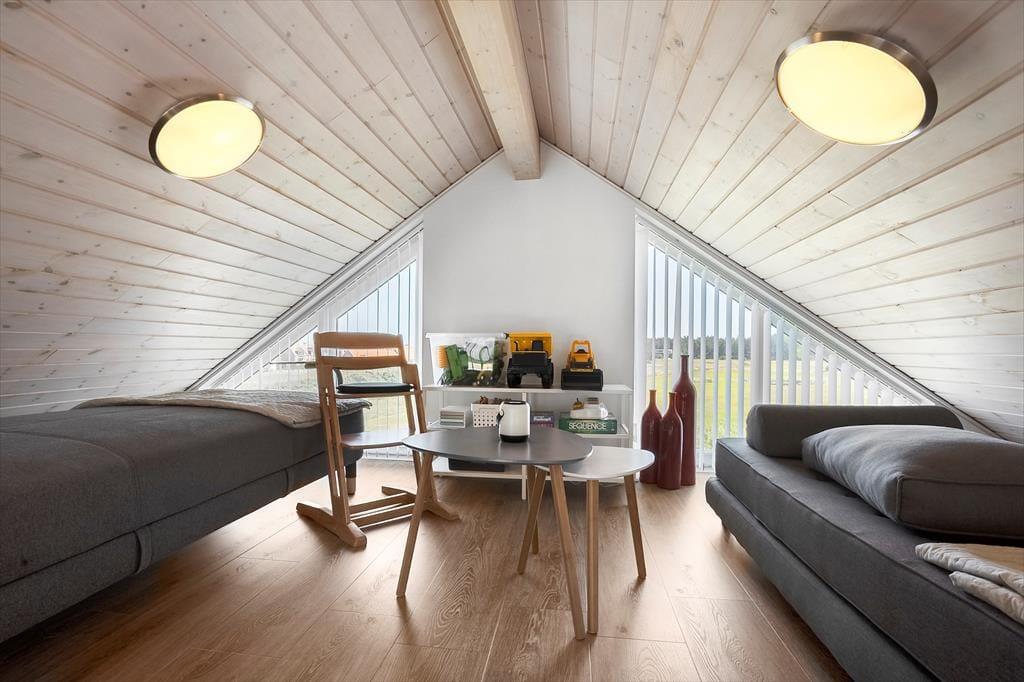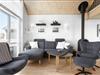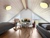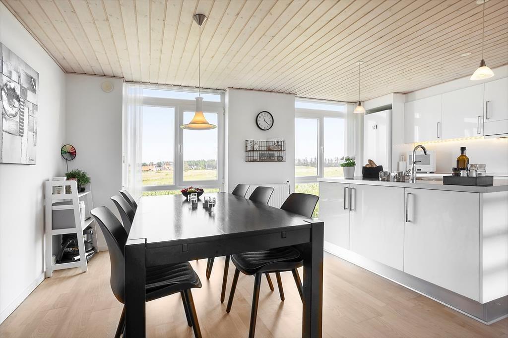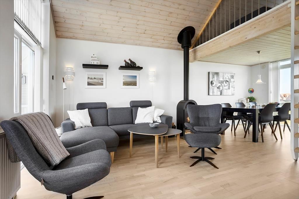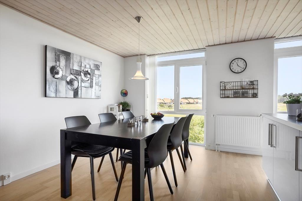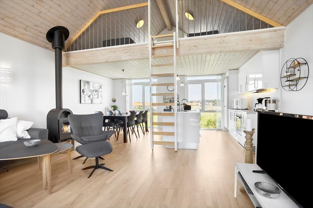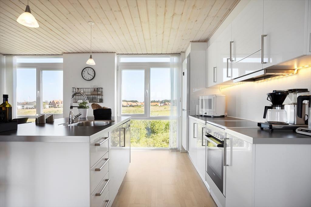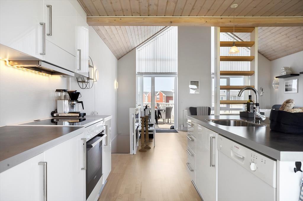 Feriehuset byder dig velkommen med et dejligt, åbent opholdsmiljø, hvor køkken og stue er samlet i ét. Her kan du mærke roen sænke sig, så snart du træder indenfor. Det flotte lysindfald fra de store vinduespartier giver rummet en lethed, og du kan hurtigt forestille dig, hvordan morgensolen rammer spisebordet, mens kaffen damper i koppen. Det åbne køkken gør det nemt at være fælles om madlavningen, uanset om der skal kokkereres en enkel frokost eller en hyggelig middag efter en dag ved havet. De tre soveværelser ligger praktisk placeret i huset, og dertil kommer en stor hems, hvor du kan mærke sommerhusstemningen i fuldt flor. Heroppe kan børnene lave deres helt eget frirum – eller de voksne kan trække sig tilbage til en stille stund. Badeværelset er rummeligt og velholdt, og alt i alt får du en indretning, der inviterer til afslapning og nærvær.