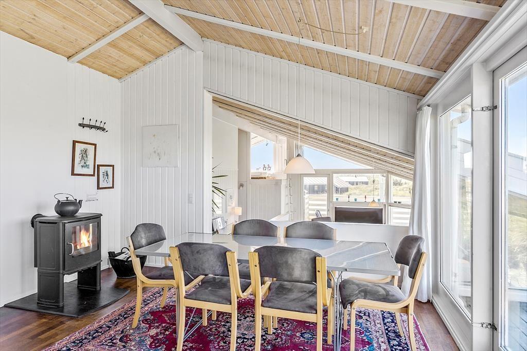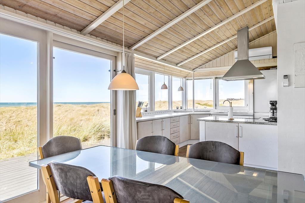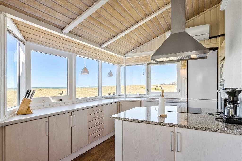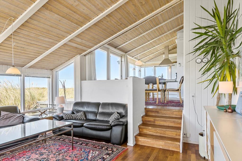 Sommerhuset byder på en enestående udsigt over vandet fra spisestuen med brændeovn og køkkenet. Huset har to badeværelser med gulvvarme, hvoraf det ene er indrettet med spabad og sauna, mens det andet har bruser, toilet, tørretumbler og vaskemaskine. To af husets soveværelser er indrettet med dobbeltsenge og et værelse er med to enkeltsenge. Fra den hyggelige, nedsænkede stue er der udsigt over havet og adgang til terrassen. En stige fører fra stuen op til en lys og meget hyggelig hems, som har udsyn over de fascinerende klitter.