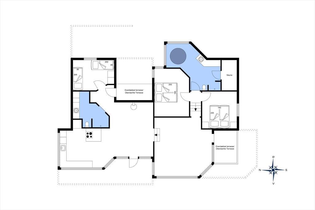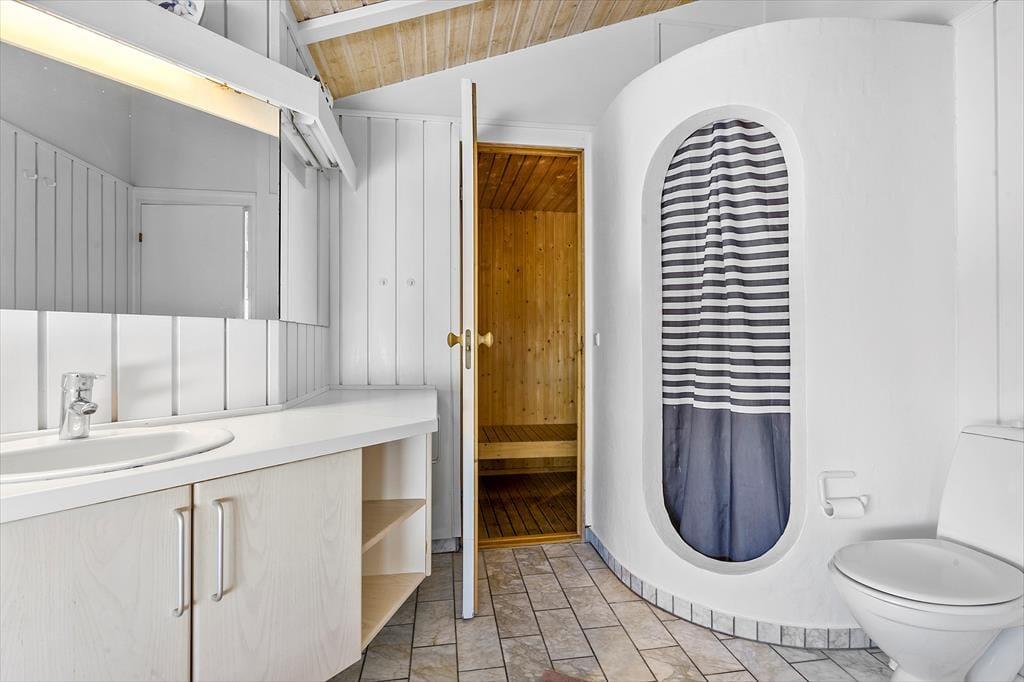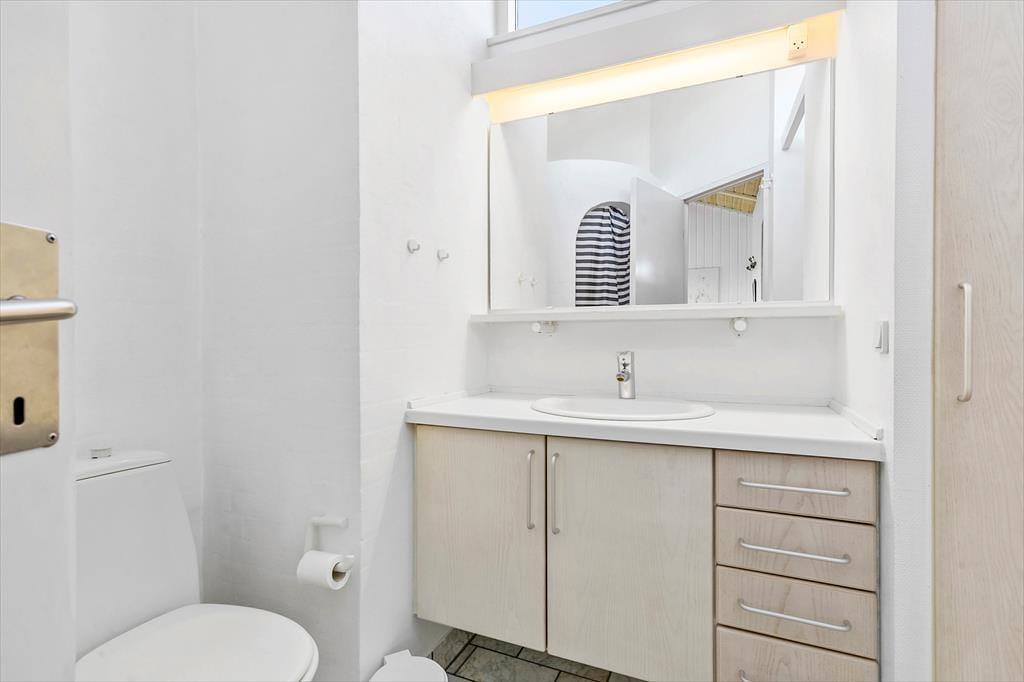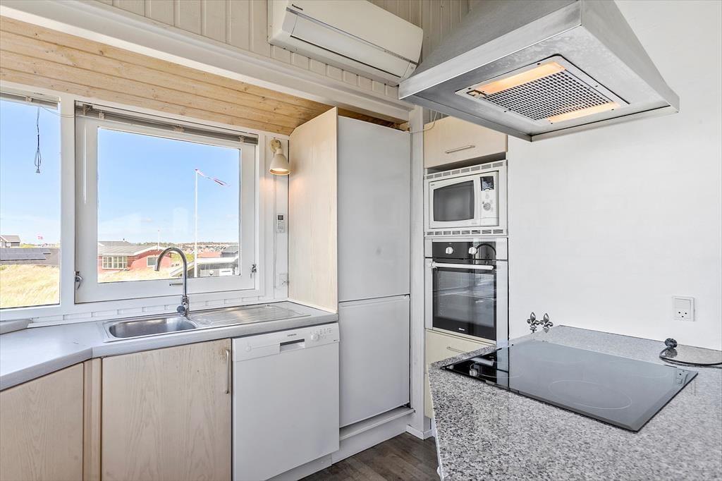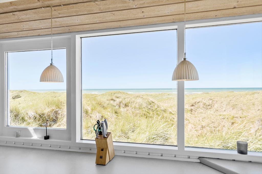 Sommerhuset byder på en enestående udsigt over vandet fra spisestuen med brændeovn og køkkenet. Huset har to badeværelser med gulvvarme, hvoraf det ene er indrettet med spabad og sauna, mens det andet har bruser, toilet, tørretumbler og vaskemaskine. To af husets soveværelser er indrettet med dobbeltsenge og et værelse er med to enkeltsenge. Fra den hyggelige, nedsænkede stue er der udsigt over havet og adgang til terrassen. En stige fører fra stuen op til en lys og meget hyggelig hems, som har udsyn over de fascinerende klitter.