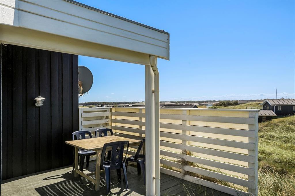 De tilhørende terrasser ligger fordelt omkring sommerhuset, så man altid kan finde et læfyldt sted i solen. Terrassen mod vest byder på en fantastisk panoramaudsigt over havet. På den lille beskyttede morgenterrasse mod øst er der en udendørs vandslange, hvor man kan skylle saltvandet af sig efter en lille morgendukkert. Foran huset i en lille nedsænket krog ligger en solgård (25 m2) med et flot granitbord, og herfra er der adgang til et lille rum, hvor havemøblerne eller cyklerne kan stilles.