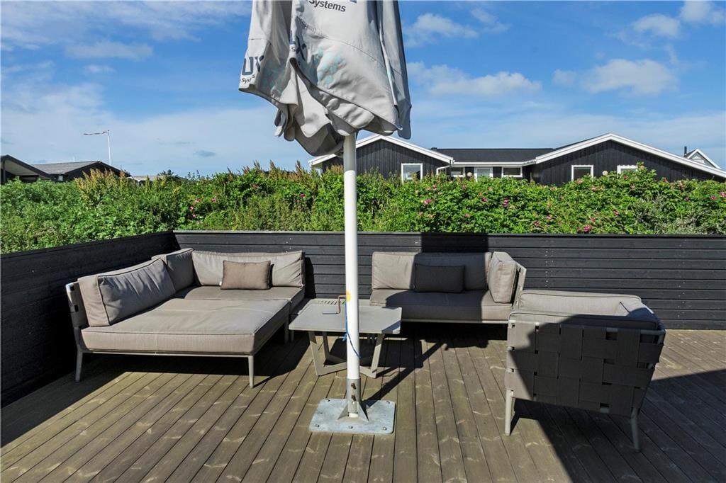 Fra opholdsområdet og aktivitetsrummet har man adgang til den sydligt beliggende træterrasse, mens der mod vest er en lukket terrasse, som giver god læ for vestenvinden. I alt 50m2 terrasse, så det altid er muligt at finde en varm og skøn plet i solen. Børnene kan spille og lege på plænen, mens bilen kan stå i læ i den tilhørende garage.
