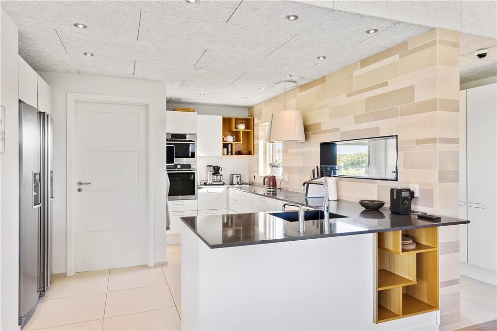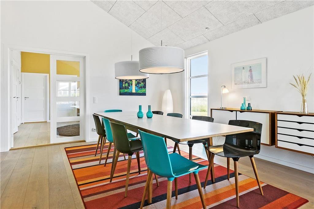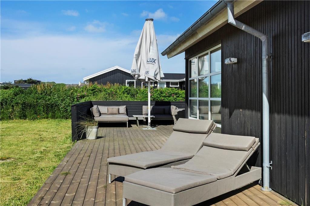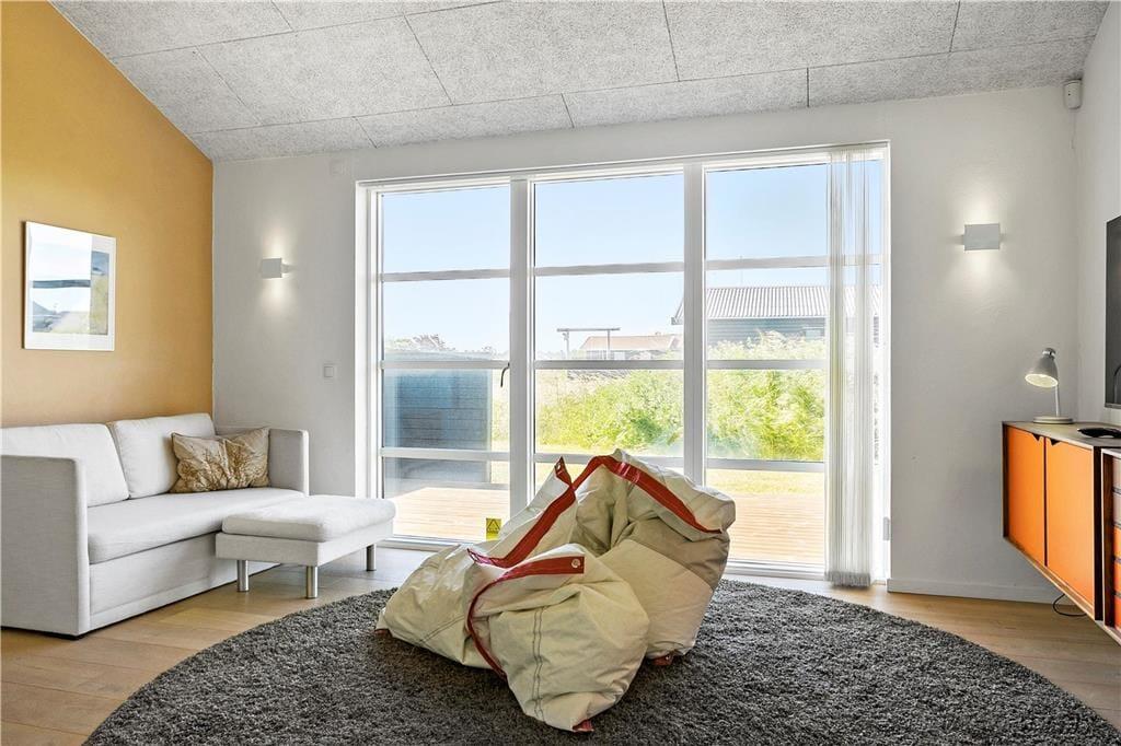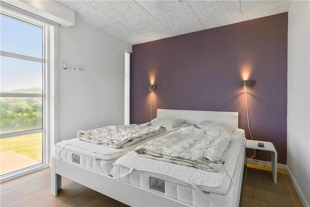 Sommerhusets indretning er gennemtænkt til mindste detalje, her er lavet et helt bevidst valg om alt fra møbler til materialer; f.eks. har hvert værelse sin egen farve, så man kan skifte soveplads alt efter humør. Sommerhusets ejere går meget op i miljøvenlighed og bæredygtighed, derfor er der mange steder valgt økologiske naturprodukter; eksempelvis kommer man til at sove i dyner og hovedpuder med fyld af kapokfiber, som er et råstof, der ikke skal vaskes eller behandles efter høst. I dette sommerhus hersker ro og harmoni. Herfra kommer man til det lyse og rummelige opholds- og spiserum med højt til loftet. I køkkenet er der lagt stor vægt på kvalitet og moderne teknologi, og har man lyst til at gøre lidt ekstra ud af aftensmaden, kan den serveres på fint porcelæn, og man kan drikke et godt glas vin af krystalglas dertil. I det store og hyggelige badeværelse går de naturlige byggematerialer igen, her er f.eks. brugt det hudvenlige corian, så også allergikere kan sidde i spa’en og nyde den varme og afslappende stemning. I denne ende af huset ligger desuden to soveværelser med hver to senge, og i den modsatte ende finder man yderligere to soveværelser; et med dobbeltseng og et med to senge, og ydermere et dejligt lyst badeværelse. Sommerhuset er velegnet til en stor eller to mindre familier, som sætter pris på faciliteter lidt ud over det sædvanlige.