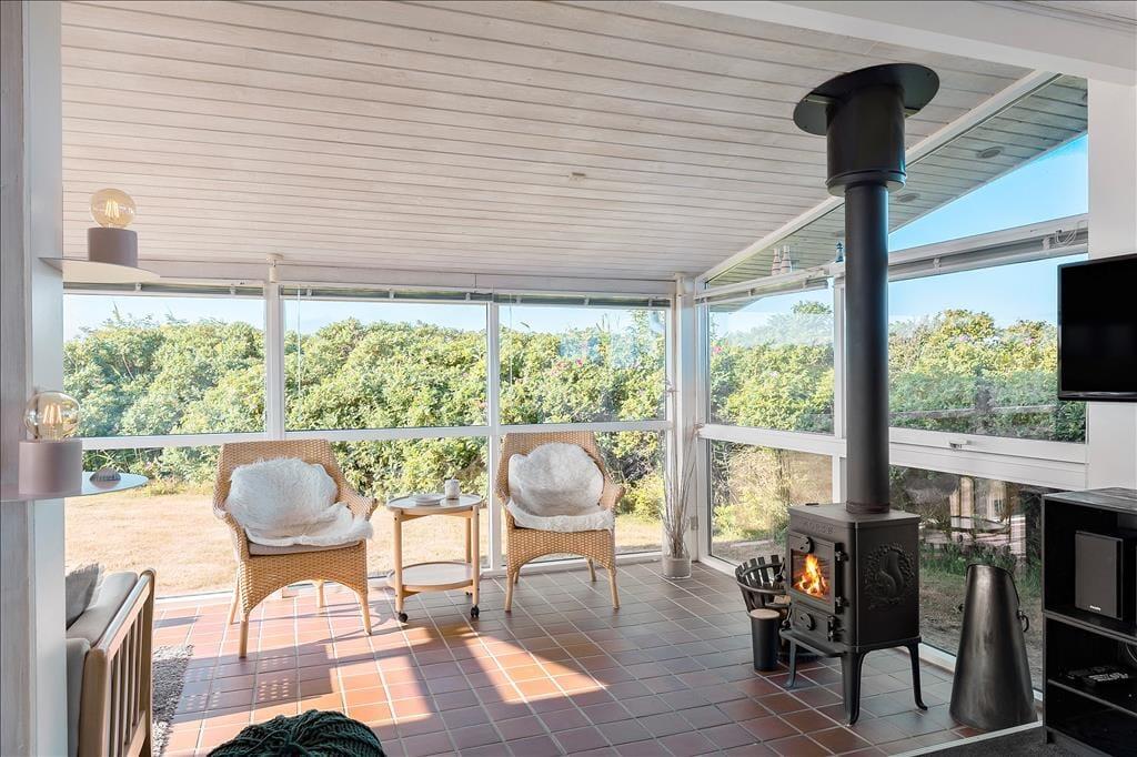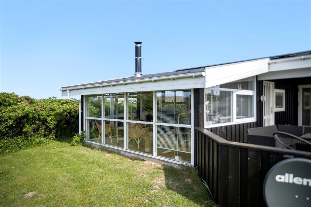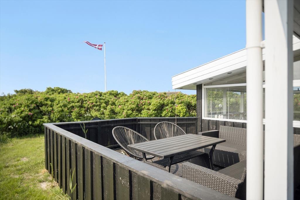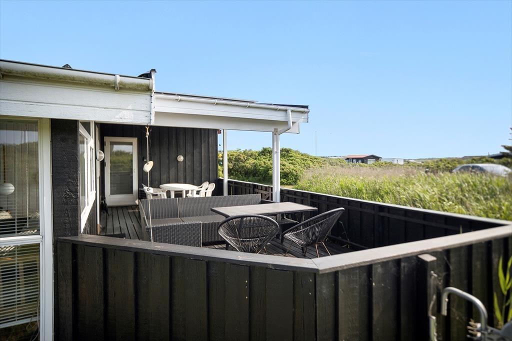 Med to dejlige terrasser er der næsten garanti for mange timer udendørs aktivitet. Foran huset ligger en lukket terrasse, som er delvist overdækket. Der er adgang fra køkkenet, så det er oplagt at tage måltiderne med herud i godt vejr. På bagsiden af sommerhuset, mod Vesterhavet, er en overdækket vestvendt terrasse med udsigt over et fælles naturområde; her kan man slappe af til lyden af Vesterhavets brusen og færdes i fred og ro, da der ikke er naboer til denne side.
