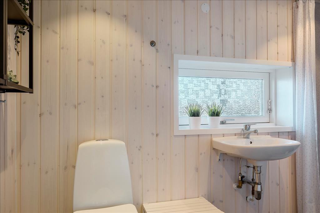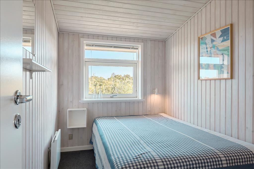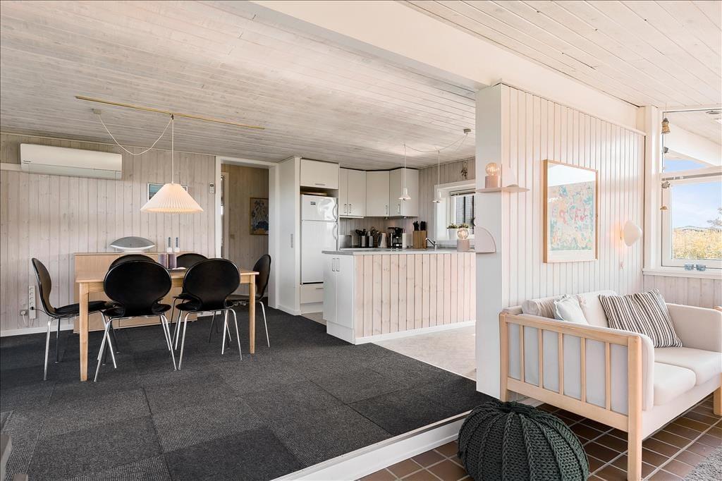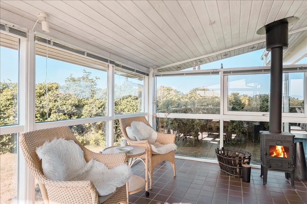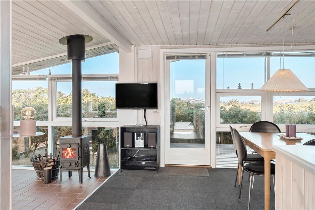Sommerhuset er pænt og velholdt, og er indrettet med store glaspartier, som lukker et dejligt og behageligt lys ind. Med lyse trævægge, gode møbler og en flot gammeldags brændeovn møder man her den typisk danske sommerhusstil. Køkkenet er udstyret med de nødvendige hjælpemidler og ligger i forbindelse med spisepladsen. Med tre fine værelser er her plads til seks overnattende gæster, og på det lille badeværelse er alle m2 godt udnyttet. Desuden er der på tv’et danske og tyske kanaler, og med internetforbindelse har man adgang til nyheder osv.