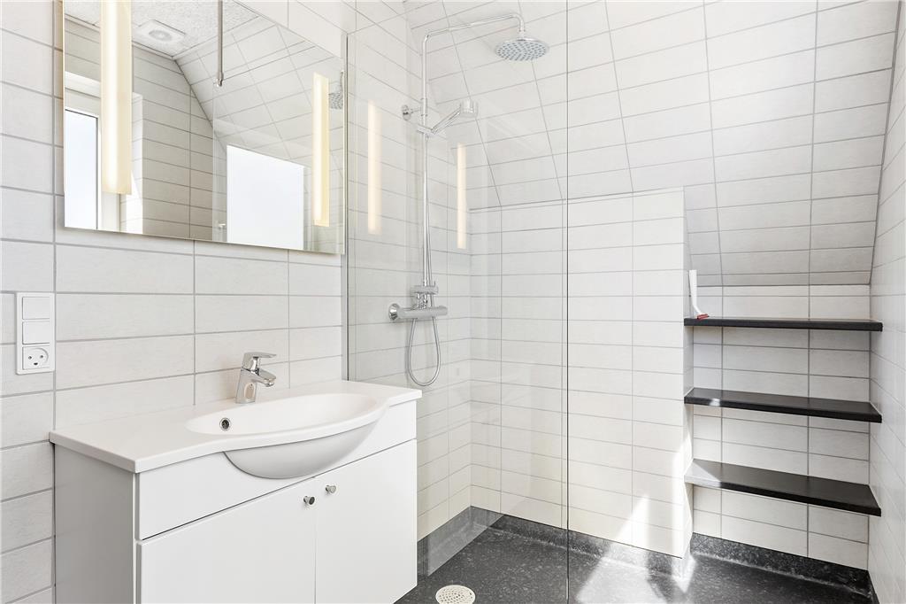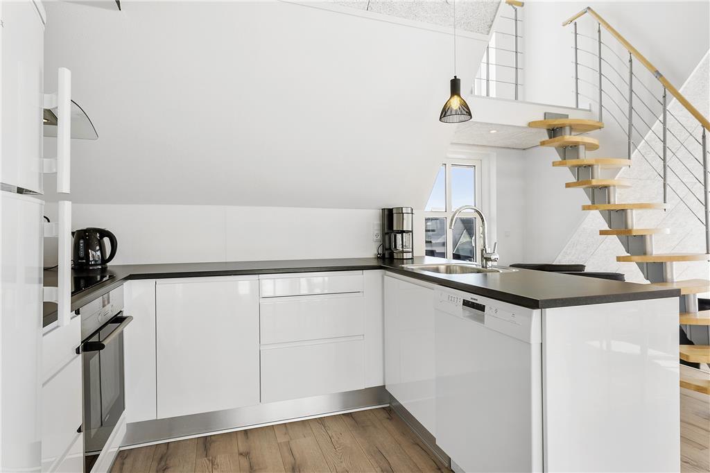 Vi er ikke bange for at kalde denne ferielejlighed for en perle i hjertet af Løkken. Med flotte lyse rum, højt til loftet, gode materialer, forskudte plan mellem stue og køkken og store vinduespartier i stuen er indretningen i en klasse for sig, og kvaliteten er helt i top. Lejligheden råder over to værelser og et dejligt badeværelse med bruser. I køkkenet er der god plads og alle de nødvendige hjælpemidler for at holde en afslappende ferie. Et par trin ned fra køkkenet ligger spisestuen og den sydvestvendte opholdsstue, som har et helt enestående lysindfald fra det store gavlvindue. Alle vinduer i lejligheden har udsigt over byen, og her er naturligvis installeret internet, som frit kan benyttes.