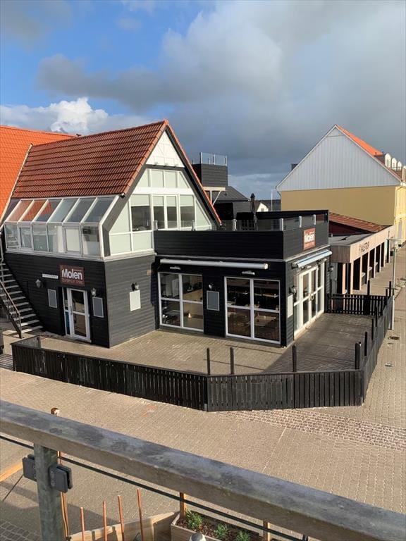 Til lejligheden hører en stor og skøn træterrasse på i alt 65m2. Den løber hele vejen rundt og har udgang fra både køkken og stue. På de forskudte plan er der udsigt til Løkkens liv mod vest og syd, og ønsker man at være helt ugeneret af forbipasserende, kan man via trappen i køkkenet sidde på den lukkede balkon, som gennem glasafskærmningen har en pragtfuld havudsigt. Man skal dog være opmærksom på, at der på grund af beliggenheden i løbet af dagen kan være en del forbipasserende og summen fra byens hyggelige liv. Der er en stor parkeringsplads i nærheden, hvor bilen kan parkeres.