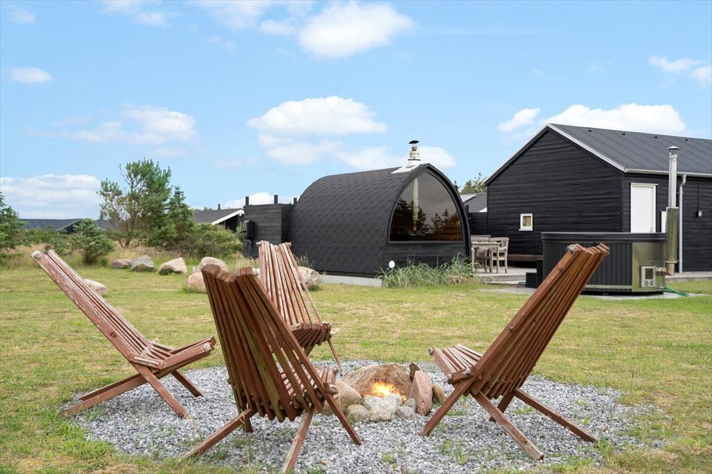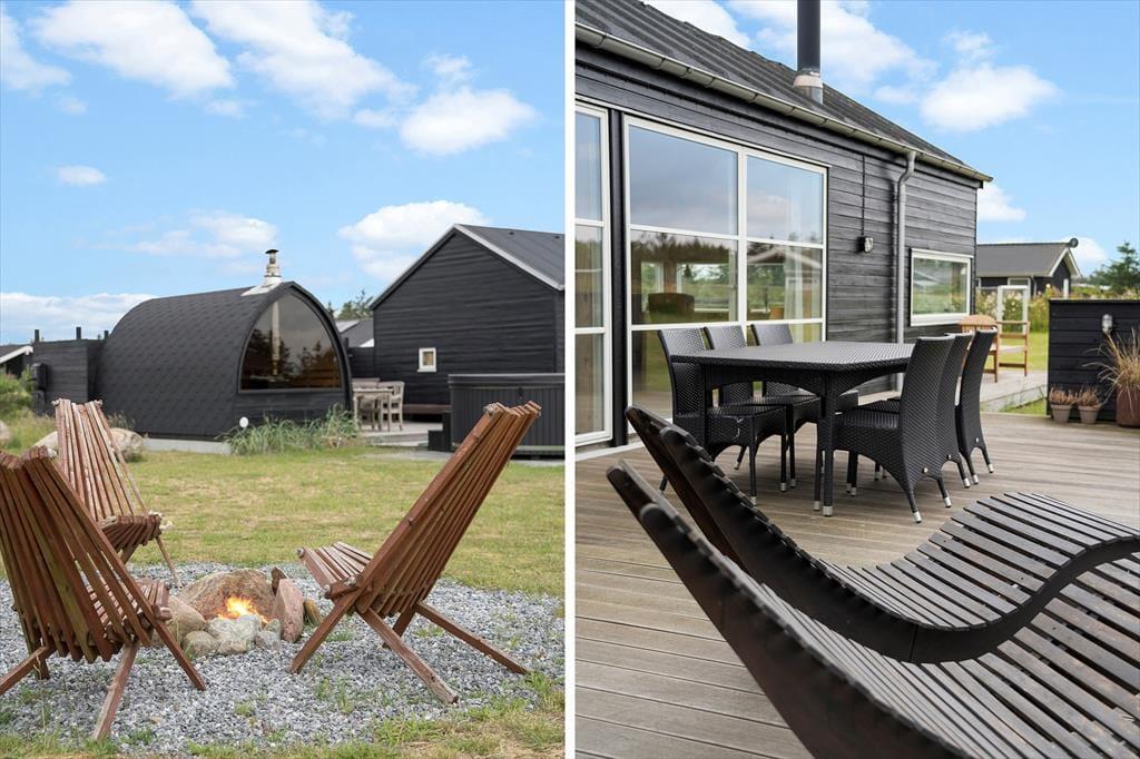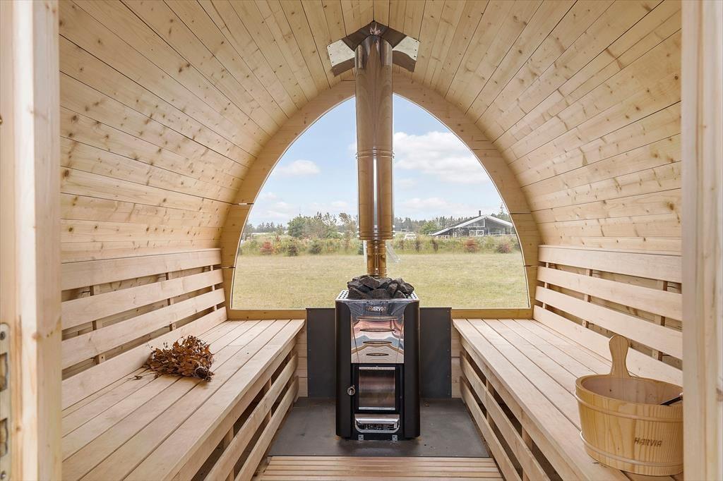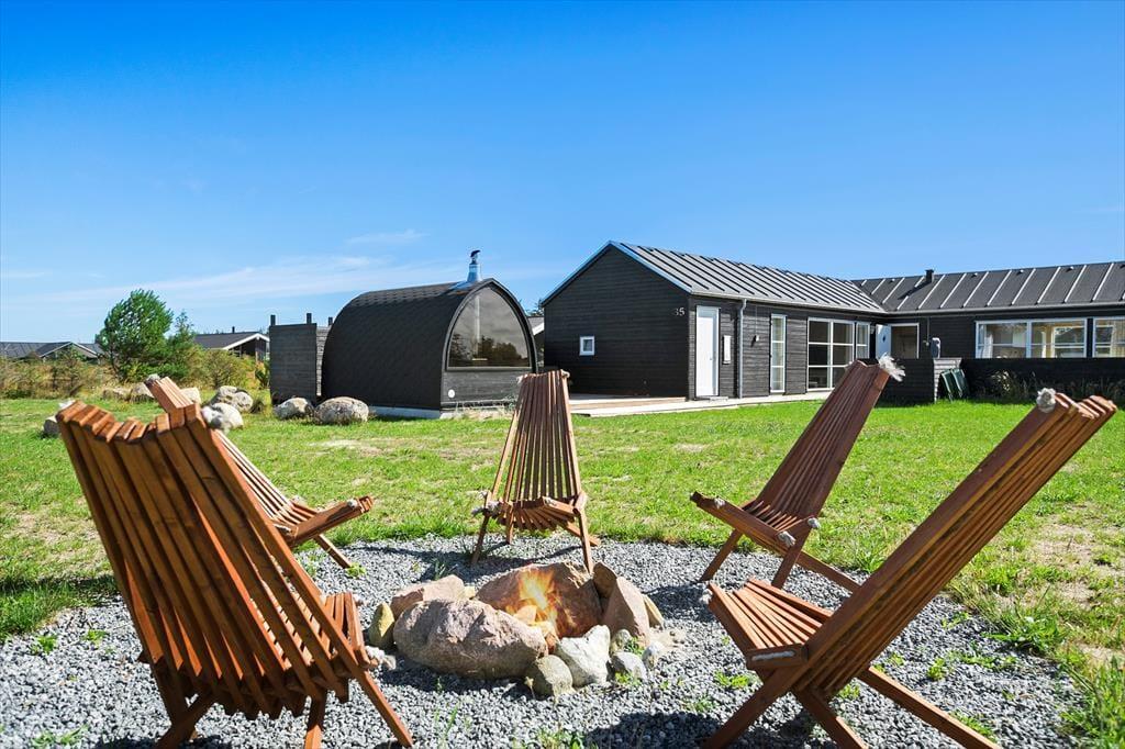Ude i det fri indbyder sommerhusets terrasser til solbadning, grill og andre former for tilbagelænet afslapning, og der er masser af plads til leg og boldspil på græsplænen. I kan også rykke hen til bålstedet, som er et hyggeligt samlingspunkt om aftenen, når himlen langsomt mørkner – og hvis I har brug for at få varmen som afslutning på dagens eventyr, kan I se frem til en rolig stund i saunaen.