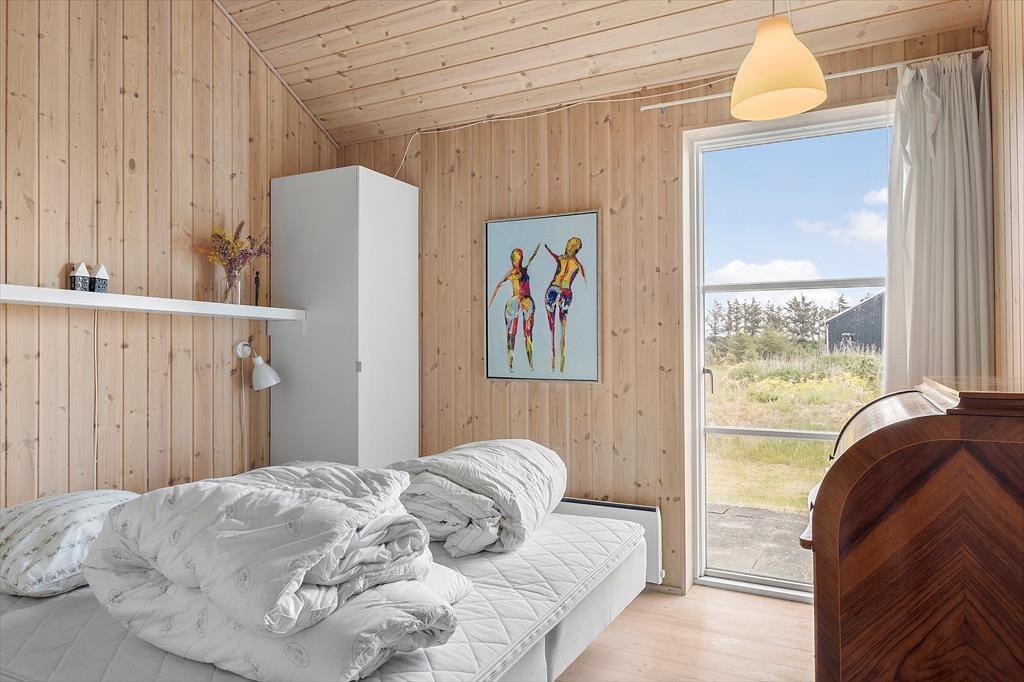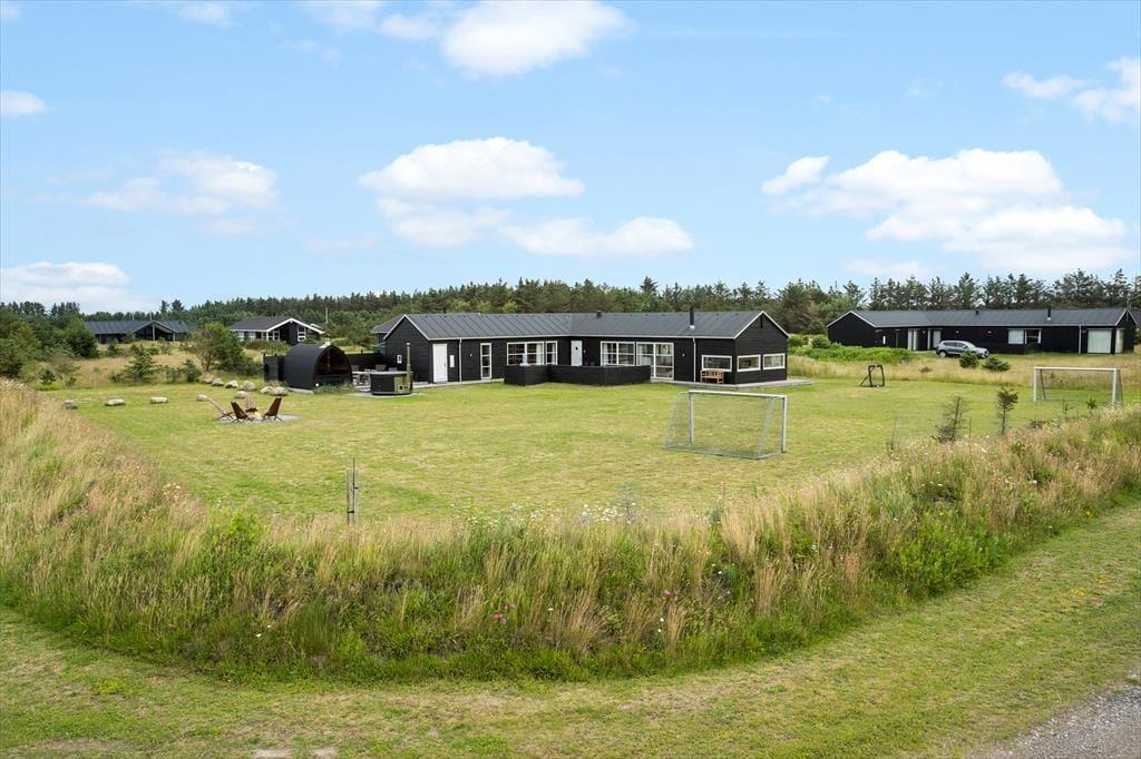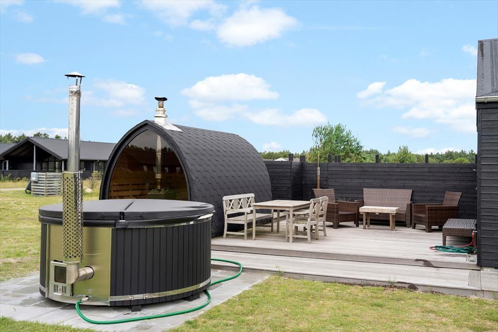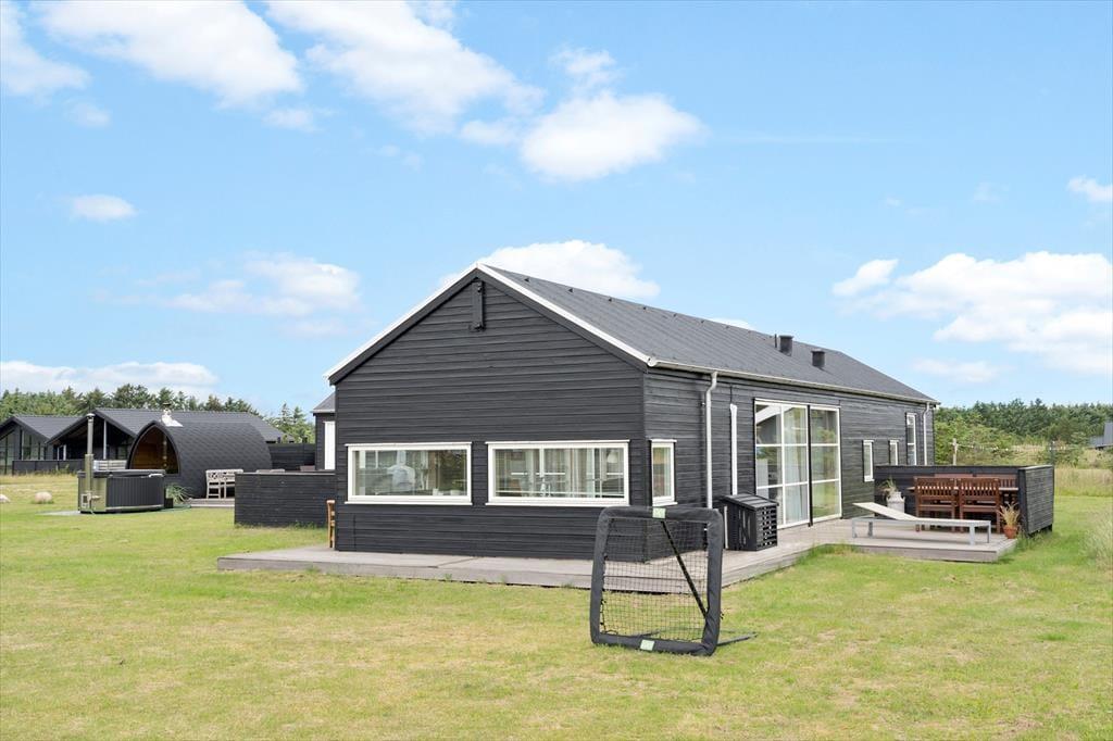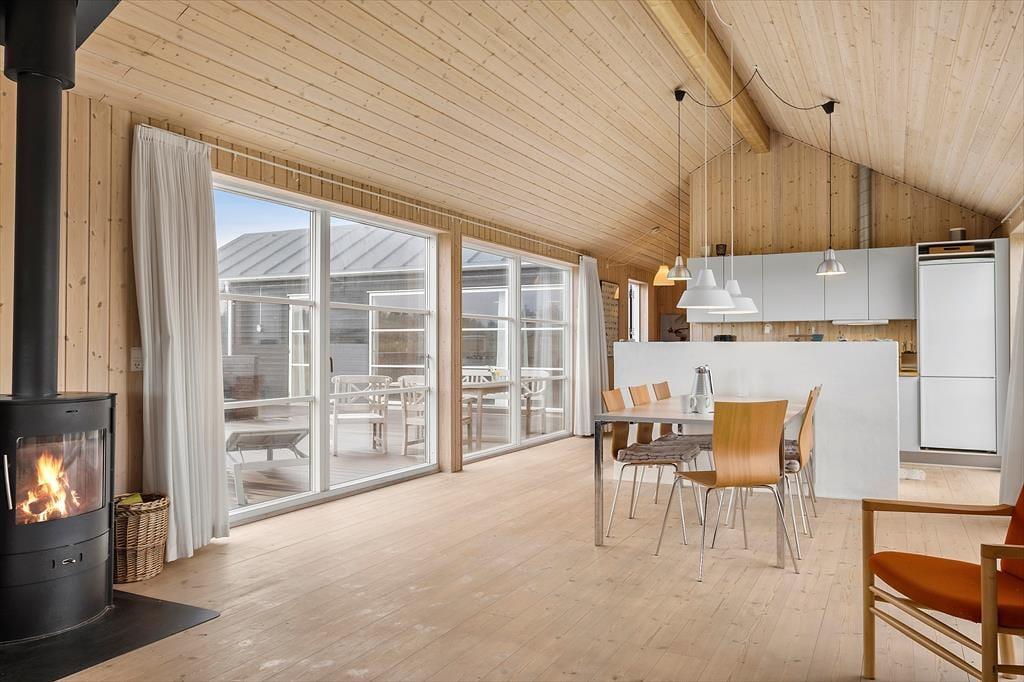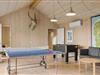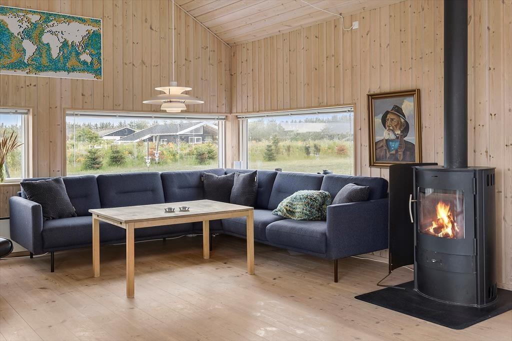 Inden døre har I hele 141 m2 at brede jer på, og med fire soveværelser og to badeværelser er planløsningen perfekt afstemt til otte personer. Trænger I til en rolig eftermiddag, er stuens sofaafdeling et skønt sted at sætte sig med sin bog eller tablet – eventuelt med ild i brændeovnen, hvis vejret er til det. Vil I spille brætspil, kan I samles omkring spisebordet, der står mellem stuens store vinduespartier og lige ved det åbne køkken. Er humøret mere til en film, kan det lade sig gøre både i stuen og i aktivitetsrummet, for begge rum er udstyret med et stort fjernsyn. På det største af husets badeværelser finder I et spabad, så wellness kan også indgå i afslapningsstunderne. Skal der være mere gang i den, er det skønt at have aktivitetsrummet, hvor I kan dyste i bordtennis og bordfodbold.