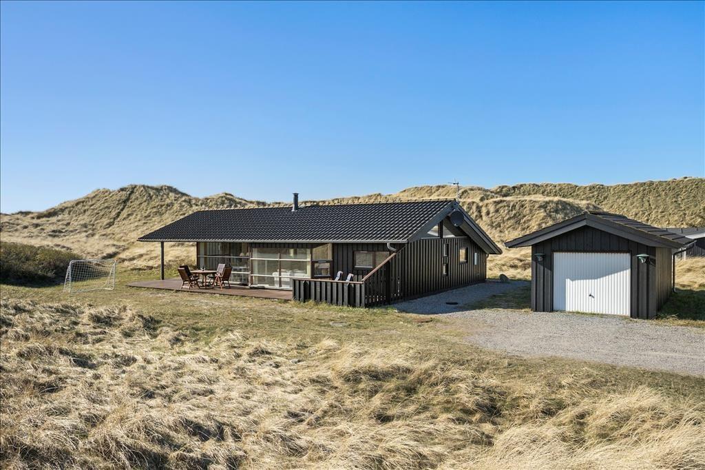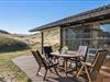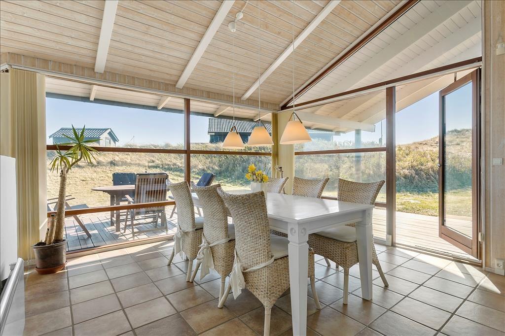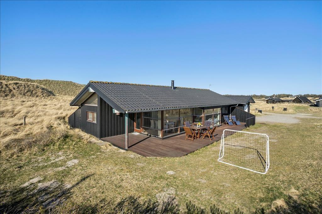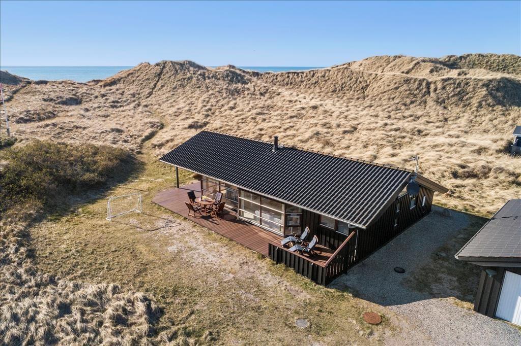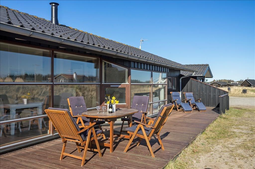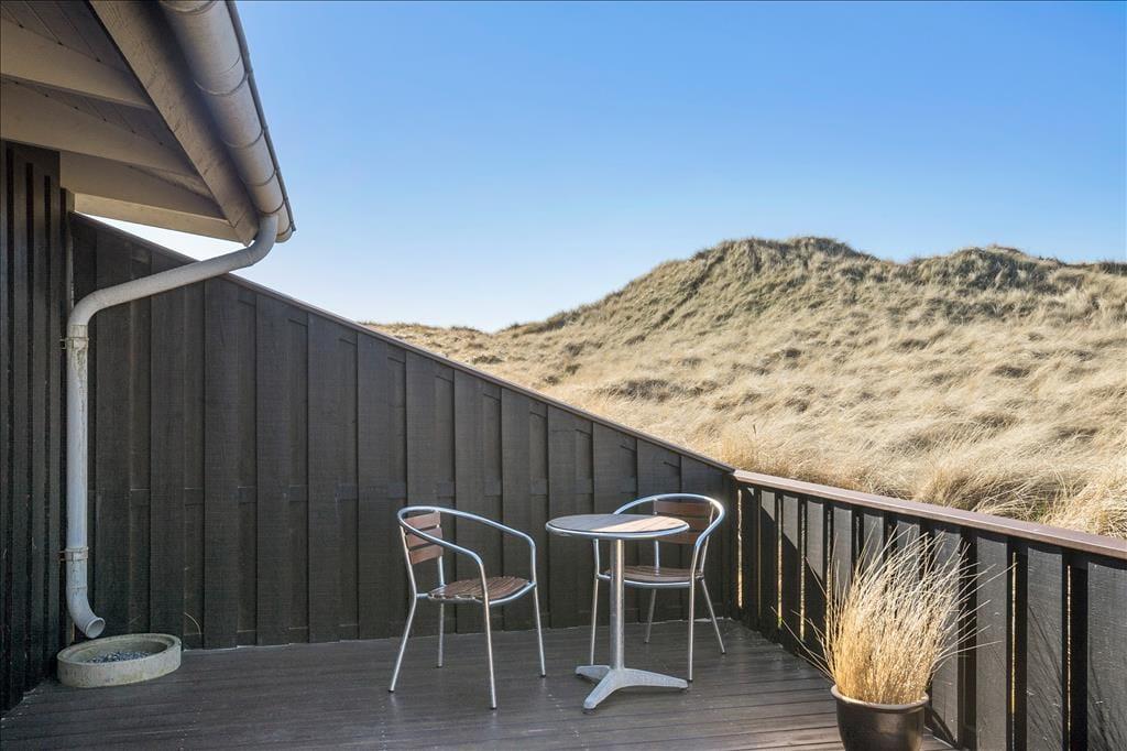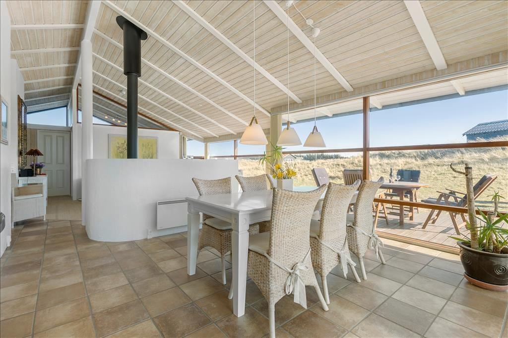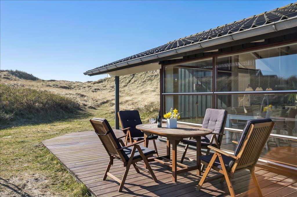 Sommerhuset ligger på en stor og flot naturgrund med marehalm, så langt øjet rækker. Her er stille og roligt og gode muligheder for at slappe af og nyde den danske sommer i fulde drag. Fra spiseafdelingen er der udgang til den delvist overdækkede terrasse, og skulle vejret drille en dag, har man her mulighed for at sidde i læ og på den måde udnytte de sene aftenstimer ude i det fri. På den anden side af huset er der endnu en lille terrasse ligeledes med god læ.
