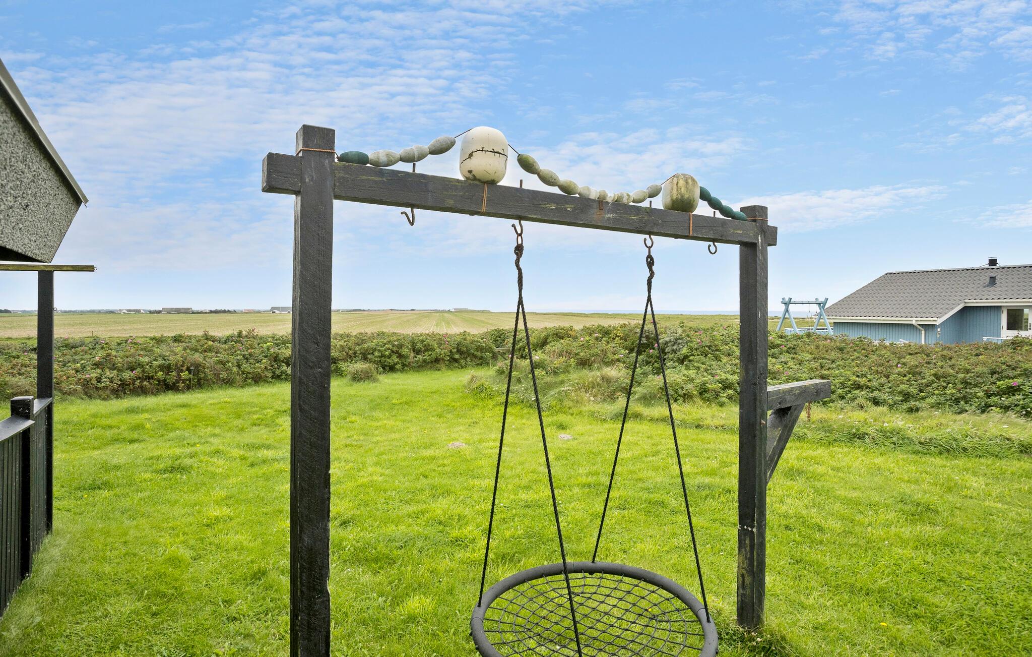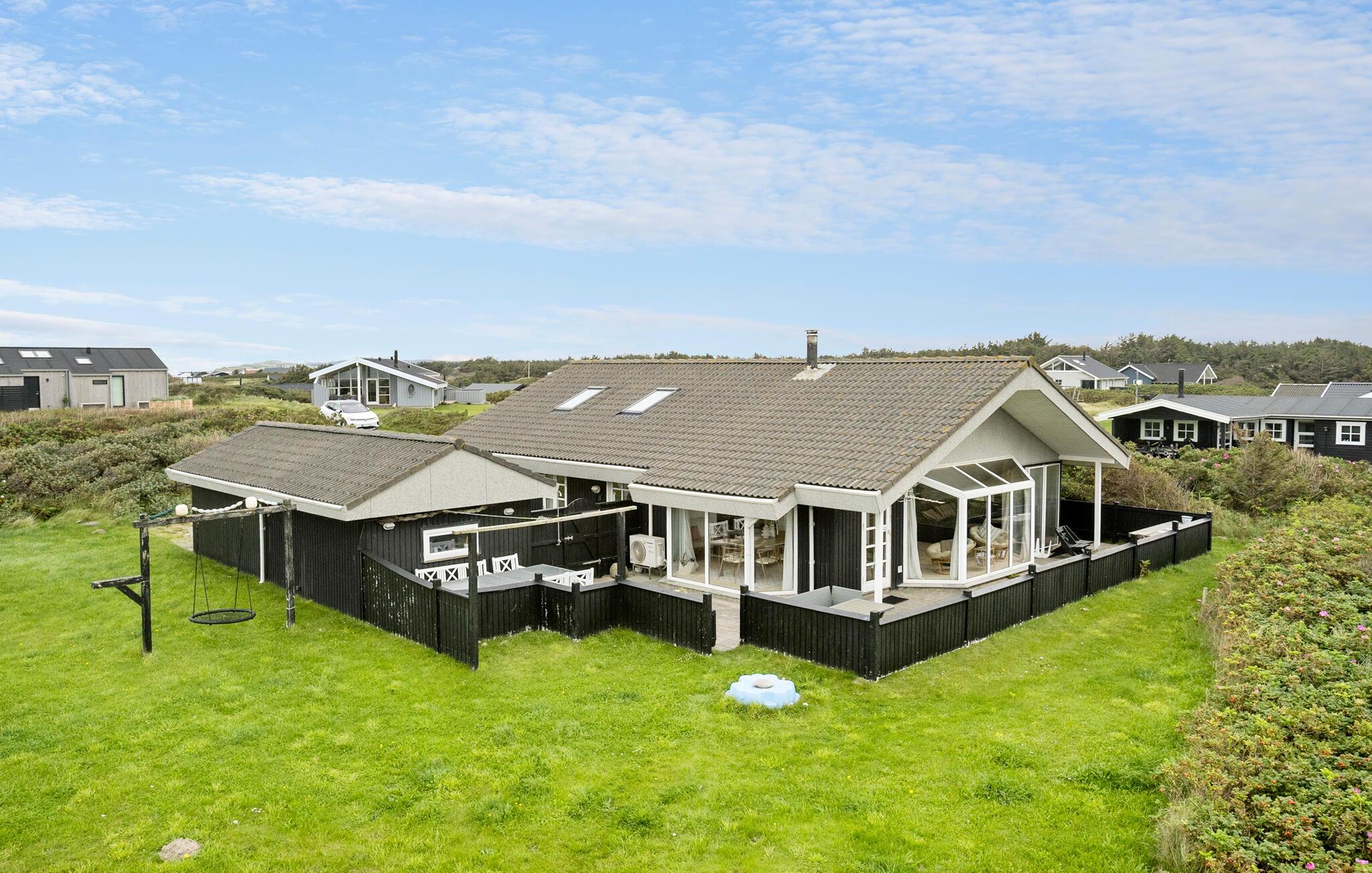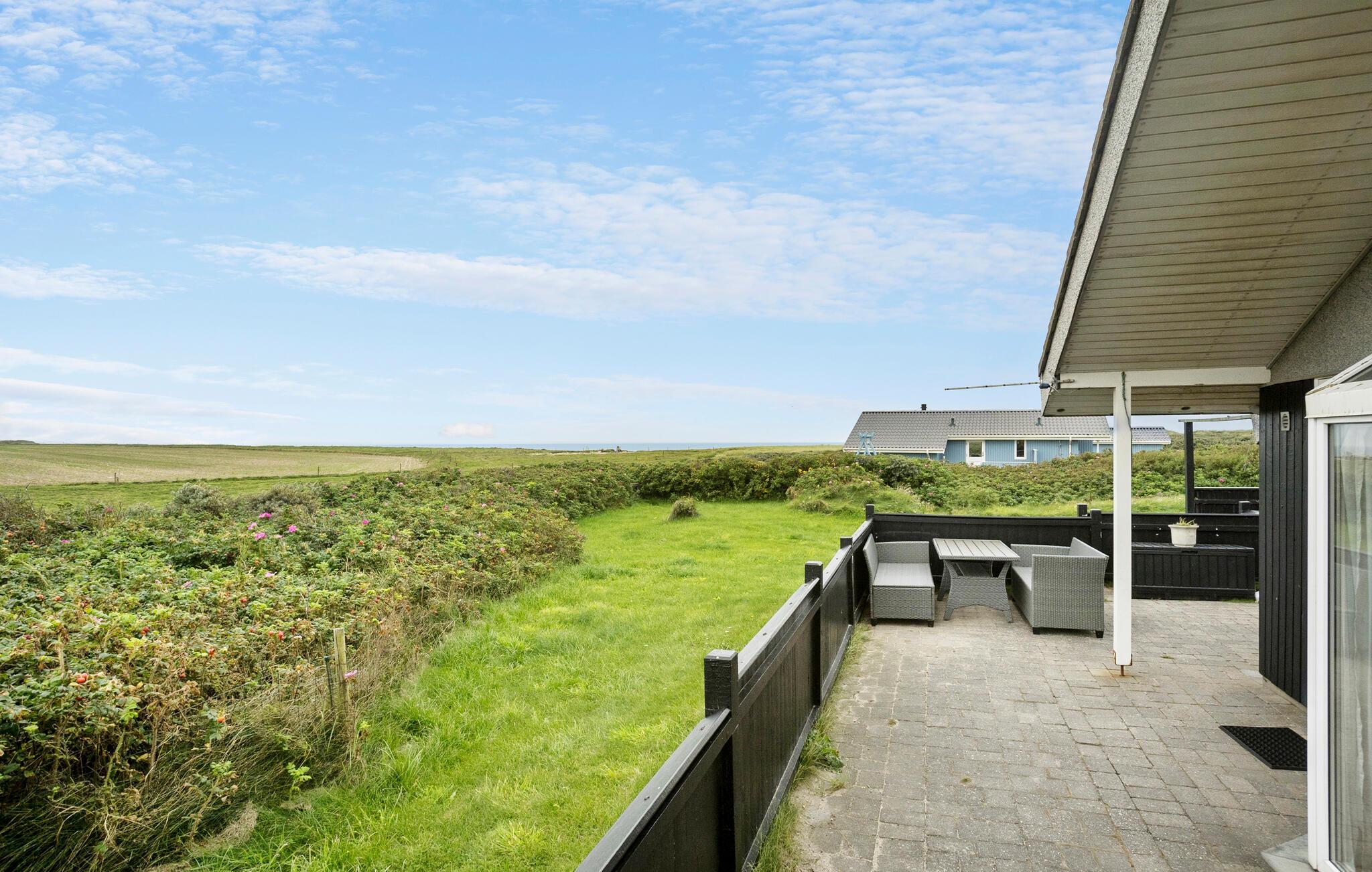 Huset venter på jer i skønne omgivelser, kun få skridt fra havet. Se frem til hyggeligt samvær i de lyse rum og slap af i saunaen efter jeres aktiviteter eller nyd den smukke udsigt over landskabet fra lænestolene i hyggeskrogen, mens brændeovnen spreder en behagelig varme. Naturgrunden har masser af plads til leg og afslapning. Ryk middagen udenfor og servér lækre retter fra grillen på terrassen. I kan også spadsere til den nærliggende strand ved det friske Vesterhav. En lille sti fører jer til strandtrappen. Der er en lille købmandsbutik i nærheden af huset i sommermånederne.