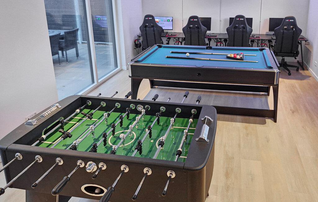 Træd ind i det rummelige opholdsområde og slå jer ned i den store sofa. Brug det flotte spisebord til fælles måltider eller sæt jer i siddenichen og hold en hyggelig pause. Her er der god plads til alle. Det moderne køkken med kogeø og store arbejdsflader indbyder til at tilberede måltider til mange personer. Spil en omgang billard, bordfodbold eller airhockey i aktivitetsrummet og benyt de fire gaming-stationer, hvor I kan tilslutte jeres egne konsoller. Et karaokeanlæg sørger desuden for underholdende aftener.