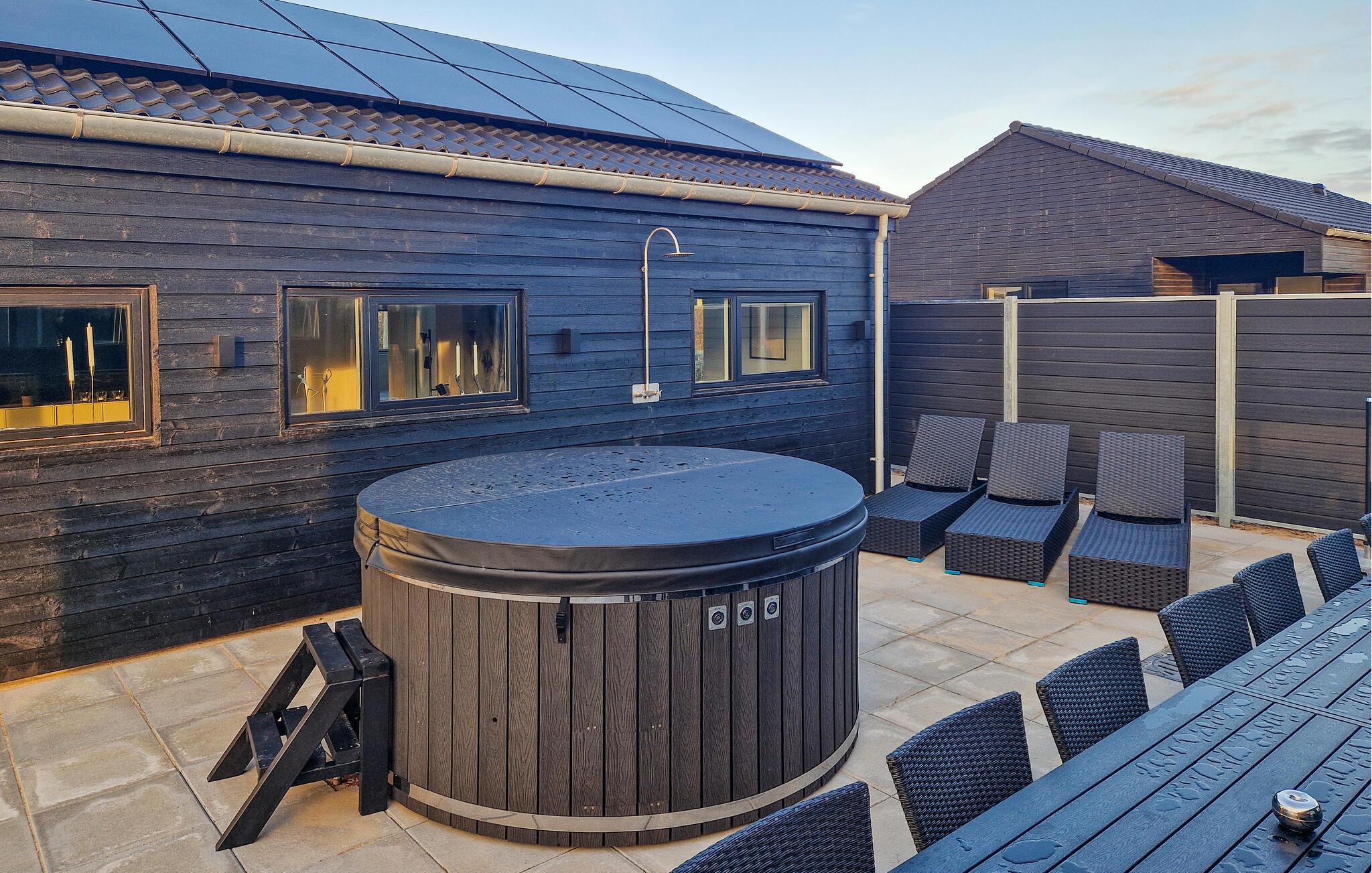 Der er dejligt læ på terrassen. Tag plads ved det lange terrassebord eller vælg en af liggestolene for at læne jer godt tilbage. Nyd det varme vand i udendørsspabadet, mens den friske luft prikker på huden. Både udespa, sauna og udebruseren er placeret i gårdmiljøet, så I kan skifte mellem faciliteterne uden at skulle ind i huset.