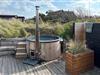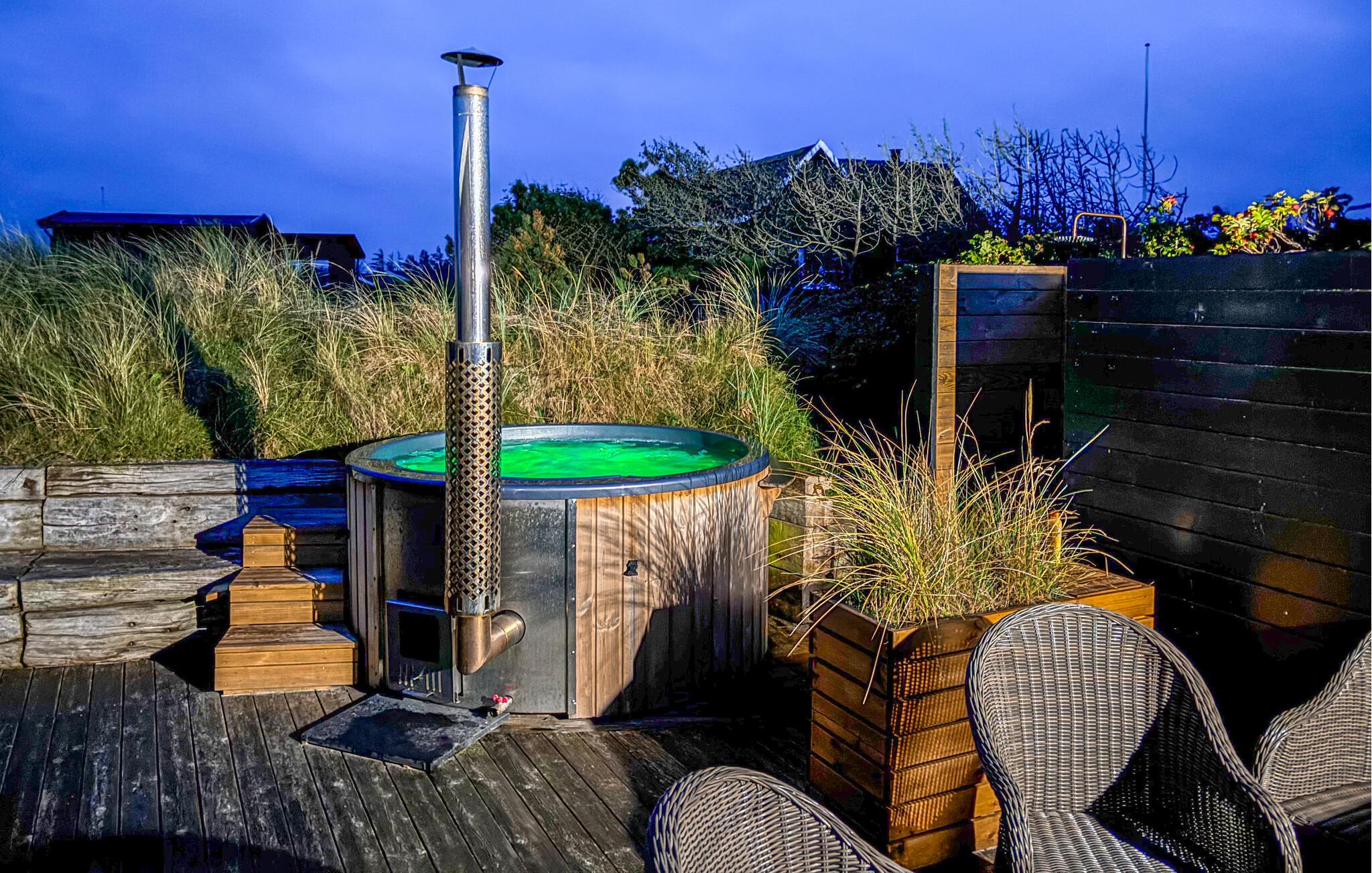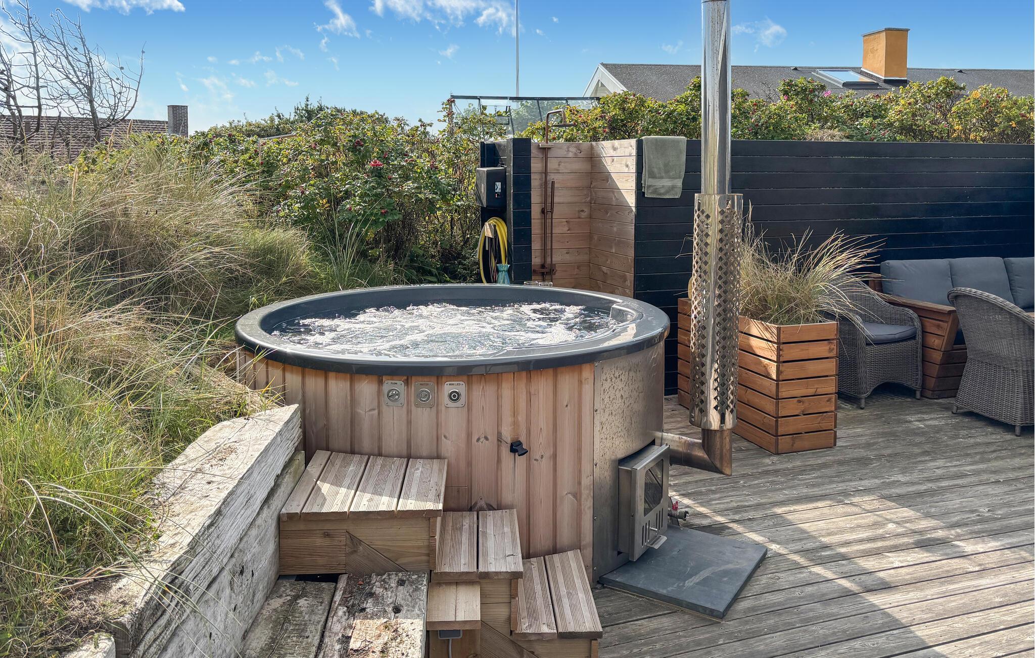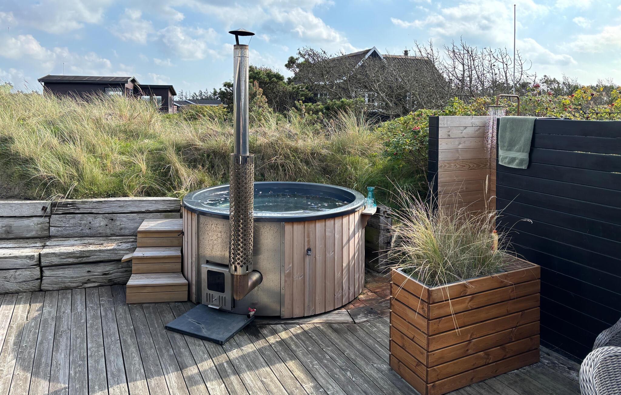 På den hyggelige terrasse kan I udsigten til den vidunderlige natur i fulde drag. Sæt jer til rette i vildmarksbadet og mærk den friske luft prikke på huden, mens I slapper af i det lune vand.