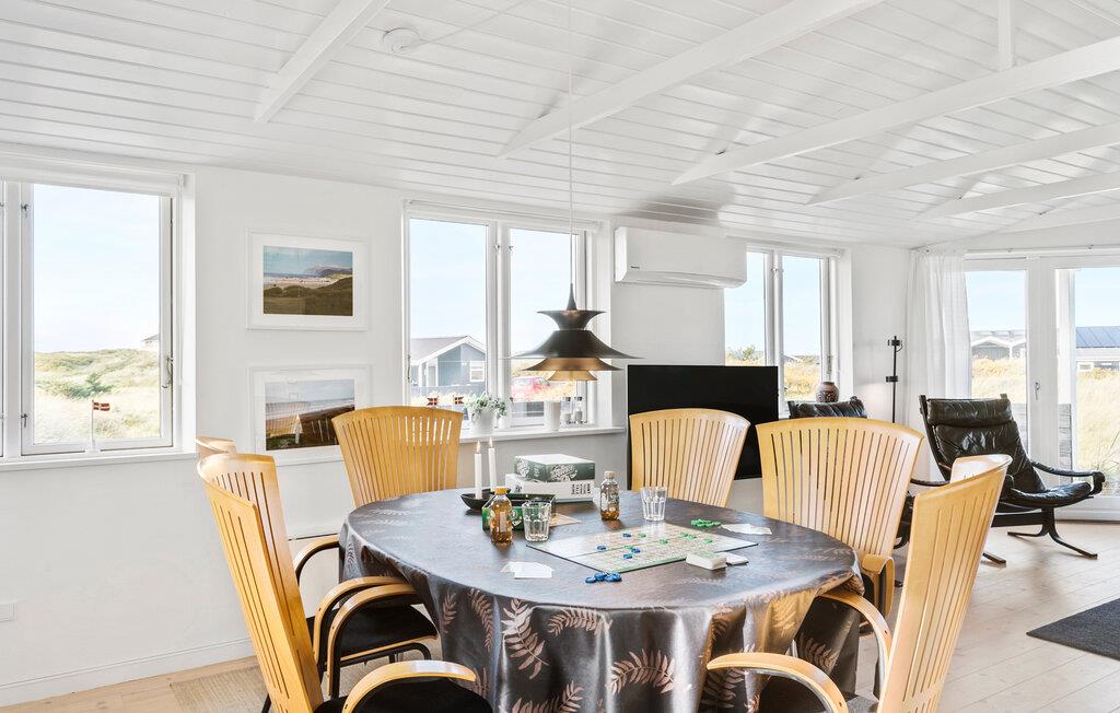 Indlejret i det klitlandskab i Hvorup Klit, nær Løkken, tilbyder dette hyggelige feriehus det ideelle tilflugtssted til en afslappet ferie med hele familien. Det lyse, moderne køkken er rummeligt og indbyder ikke kun til madlavning, men byder også på en smuk udsigt over den omkringliggende natur. Opholdsområdet er præget af store vinduer, som lader dagslyset strømme ind og skaber en varm, indbydende atmosfære. Efter dagens oplevelser kan I slappe ekstra godt af i saunaen eller spabadet. Gør jer det komfortabelt i det behagelige sofahjørne og nyd hyggelige aftener med brætspil, mens ilden knitrer i brændeovnen.
