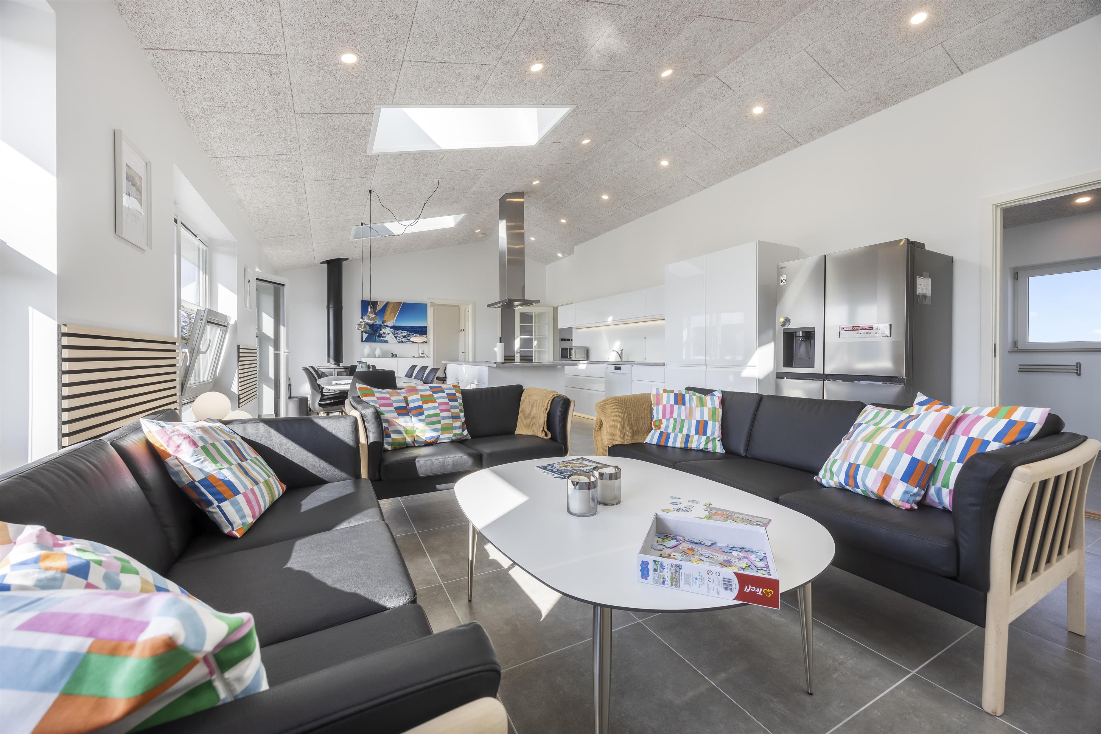 Dette nybyggede feriehus fra 2025 er lyst, rummeligt og indrettet med fokus på komfort. Her finder du et stort opholdsrum med sofagruppe og spiseplads, perfekt til hyggelige stunder efter en dag på stranden. Køkkenet er fuldt udstyret, så det er en fornøjelse at tilberede måltider sammen.