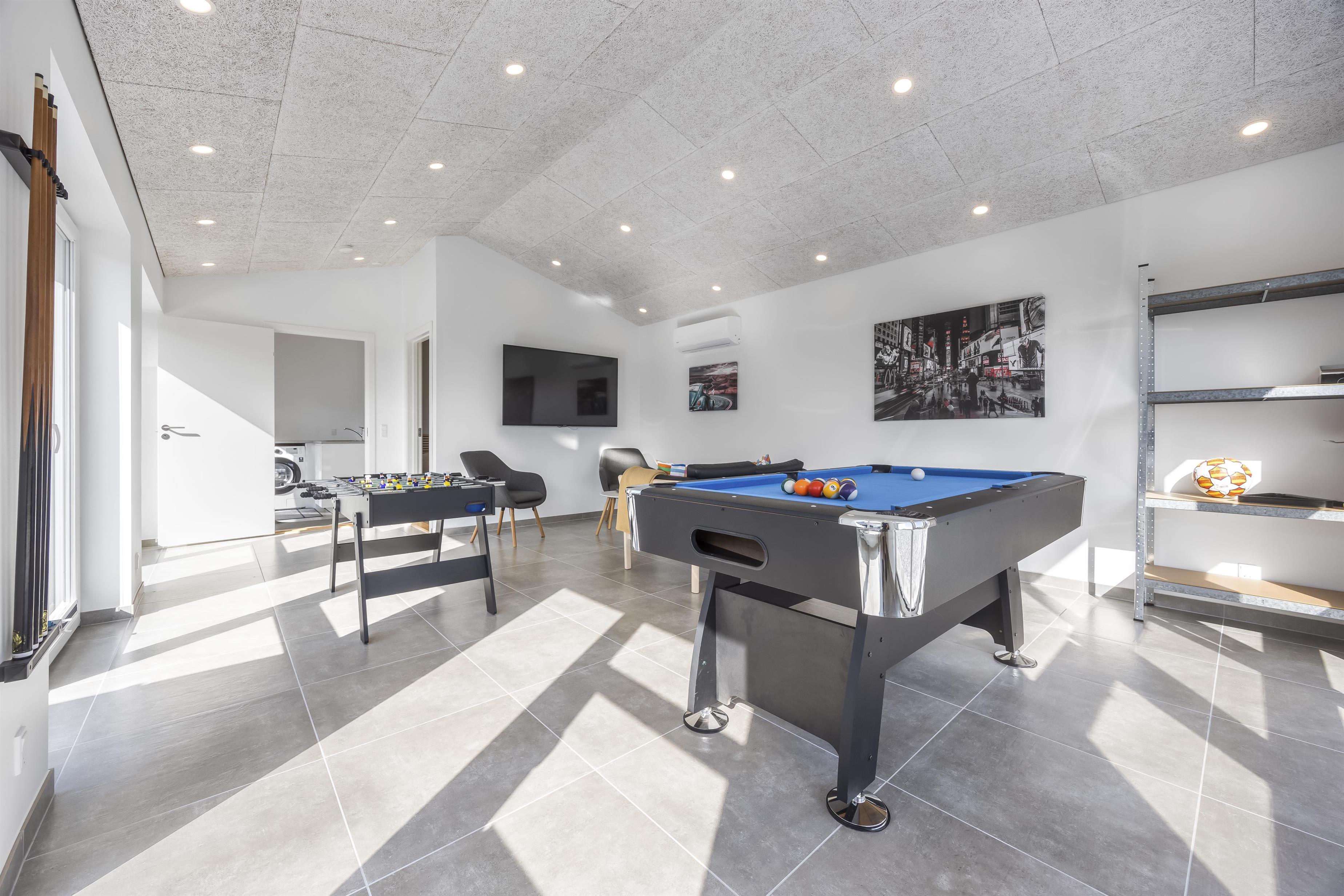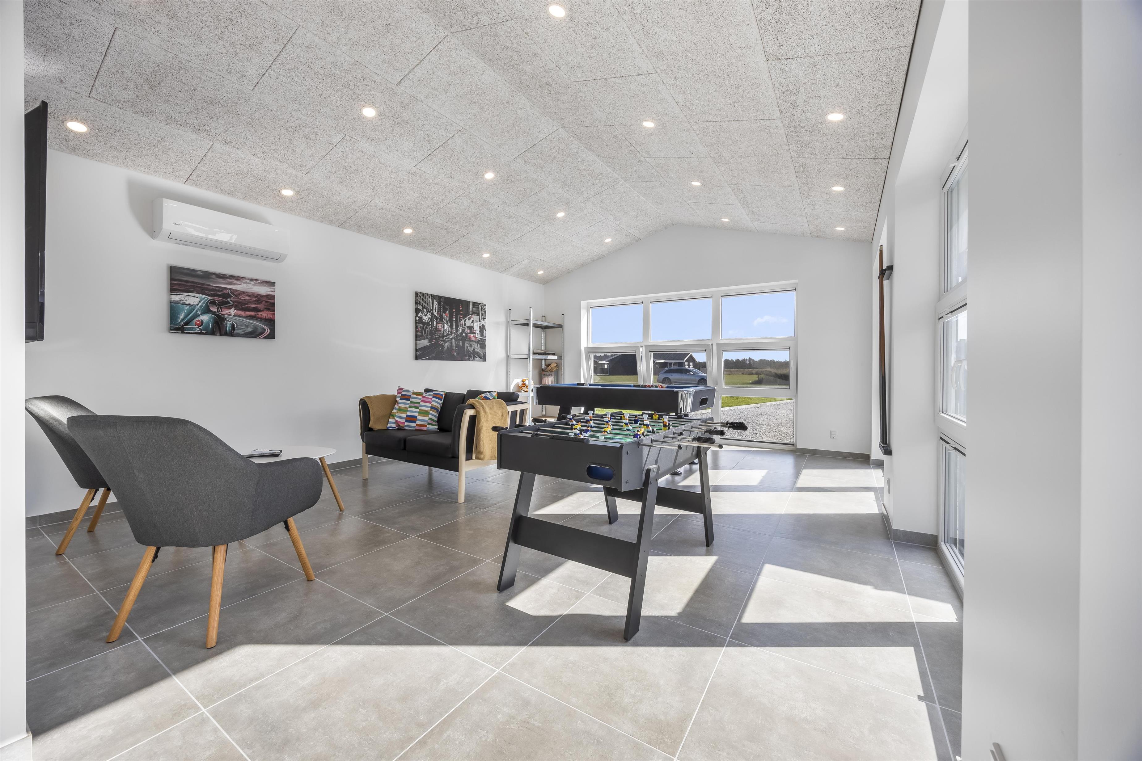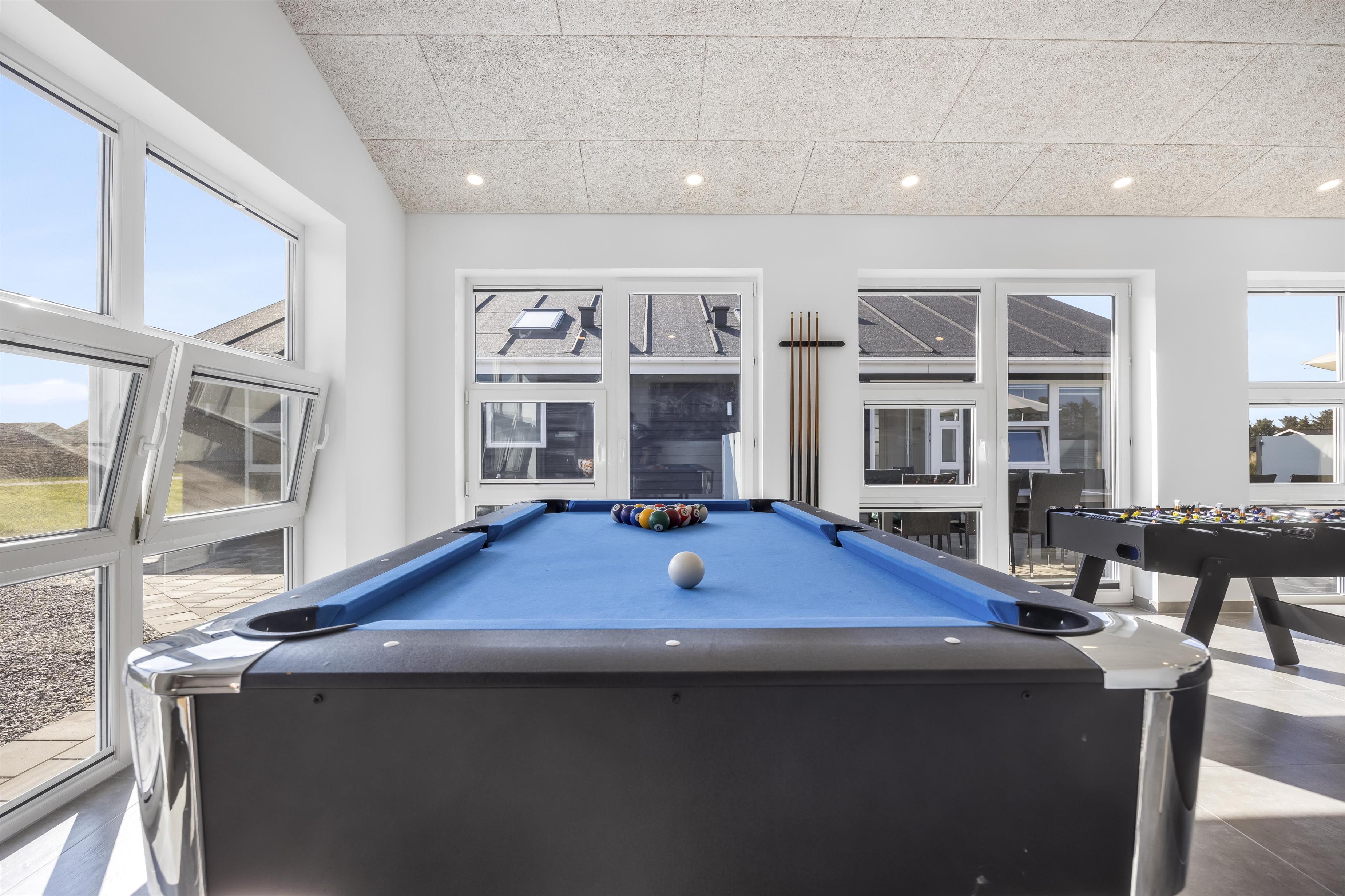 I annekset venter et ekstra soveværelse og et lyst aktivitetsrum med poolbord og stort TV – et oplagt sted til spil, film og hygge, når vejret kalder på indendørs samvær.