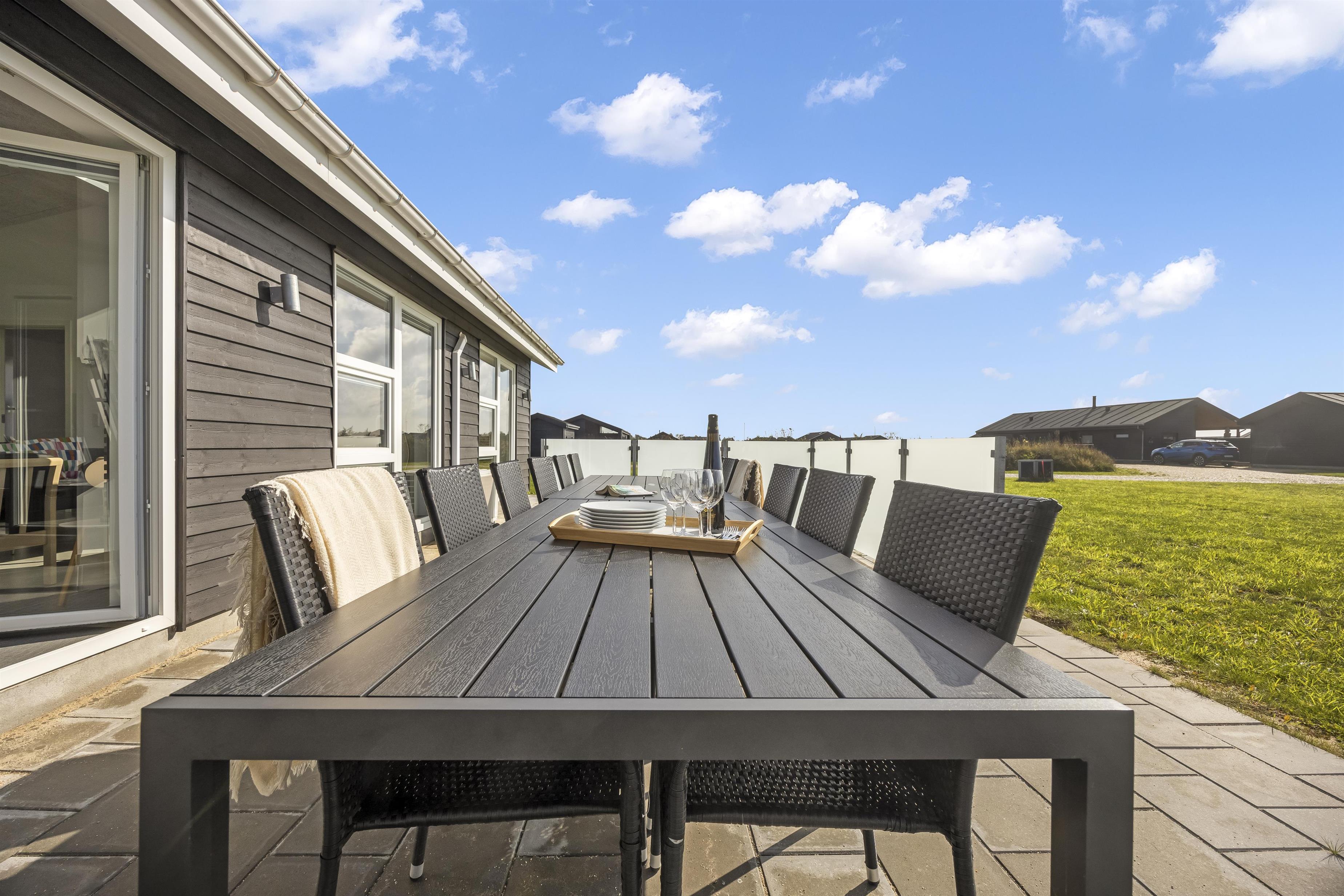 Rundt om feriehuset finder du flere dejlige terrasser med læ og god plads til både solbadning og fælles middage under åben himmel. Der er komfortable solsenge, spil til udeleg samt en stor plæne, perfekt til boldspil for både børn og voksne. Feriehuset er desuden energivenligt med varmepumpe og har egen lader til elbiler – en moderne løsning, der gør din ferie nemmere og grønnere.