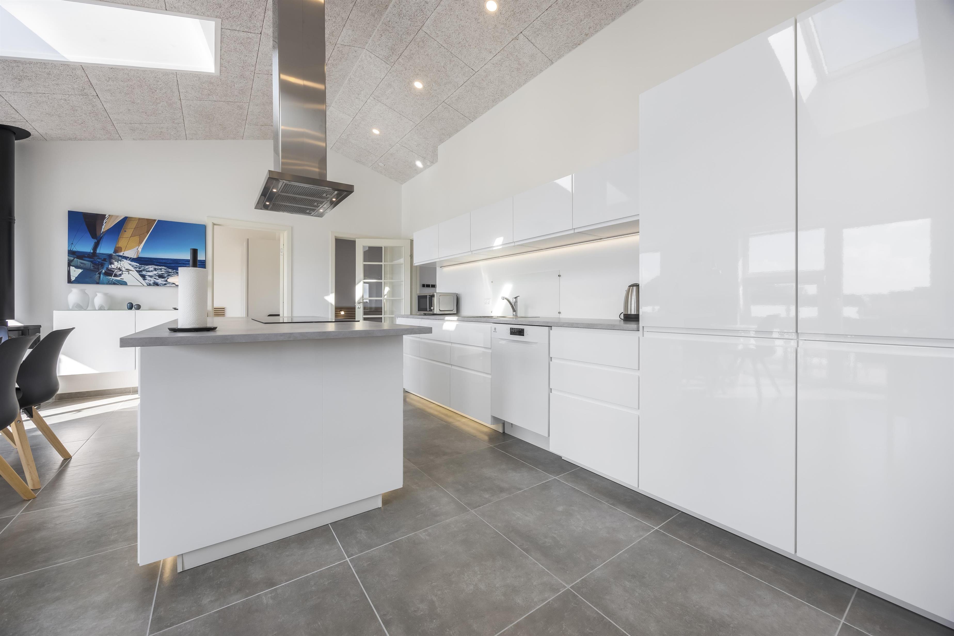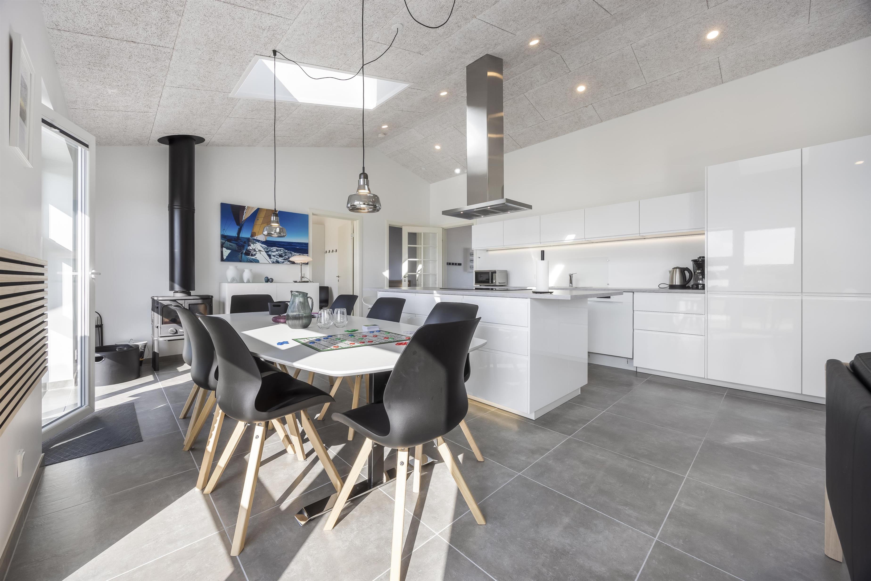 Huset er lyst, rummeligt og indrettet med fokus på både hygge og funktionalitet. Det store opholdsrum samler sofahjørne, spiseplads og et fuldt udstyret køkken – perfekt til fælles madlavning og hyggelige aftener efter en dag ved stranden.