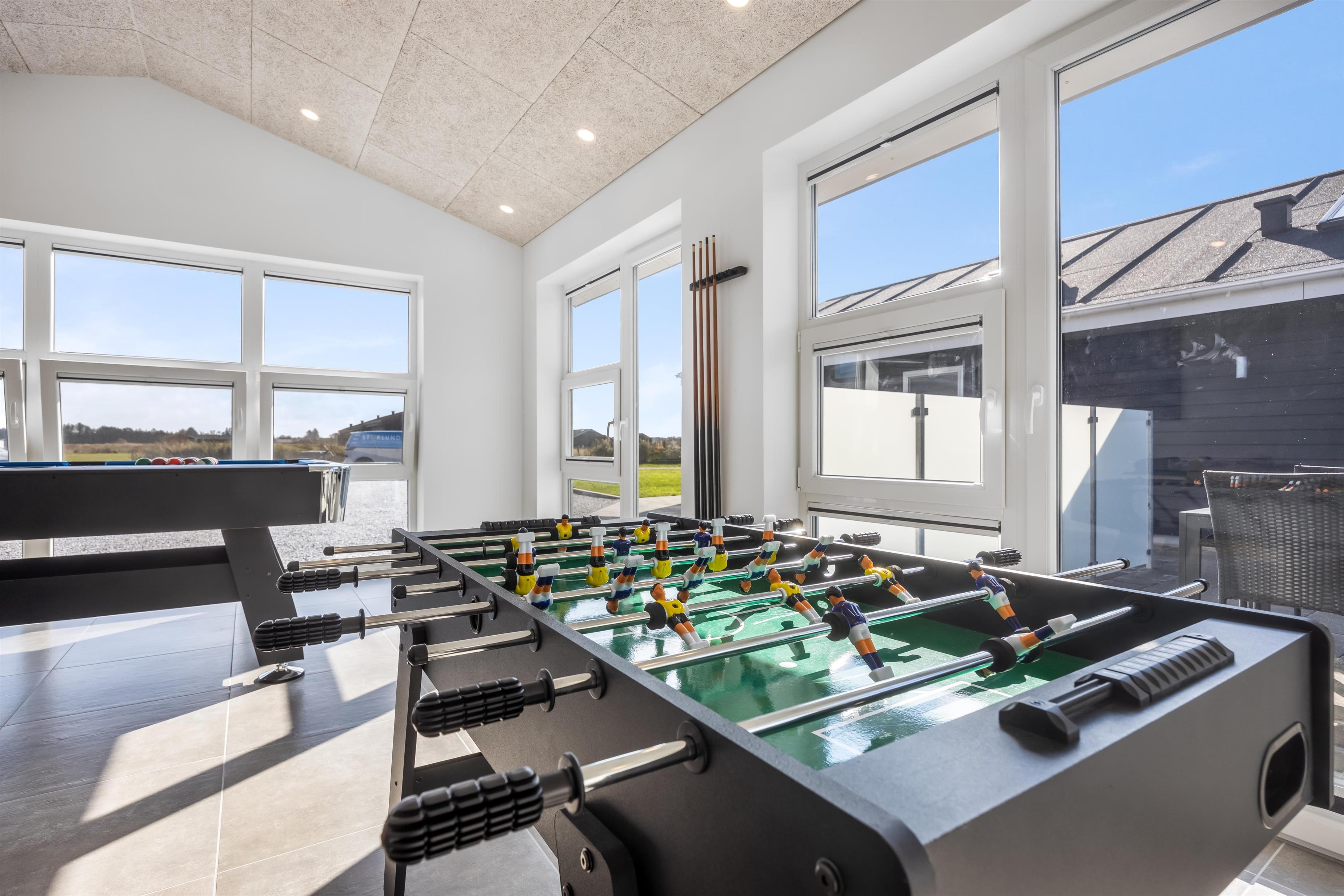 Annekset rummer yderligere et soveværelse samt et lyst aktivitetsrum med poolbord og stort TV – det ideelle sted til spil, film og samvær på dage, hvor I vælger indendørs hygge.