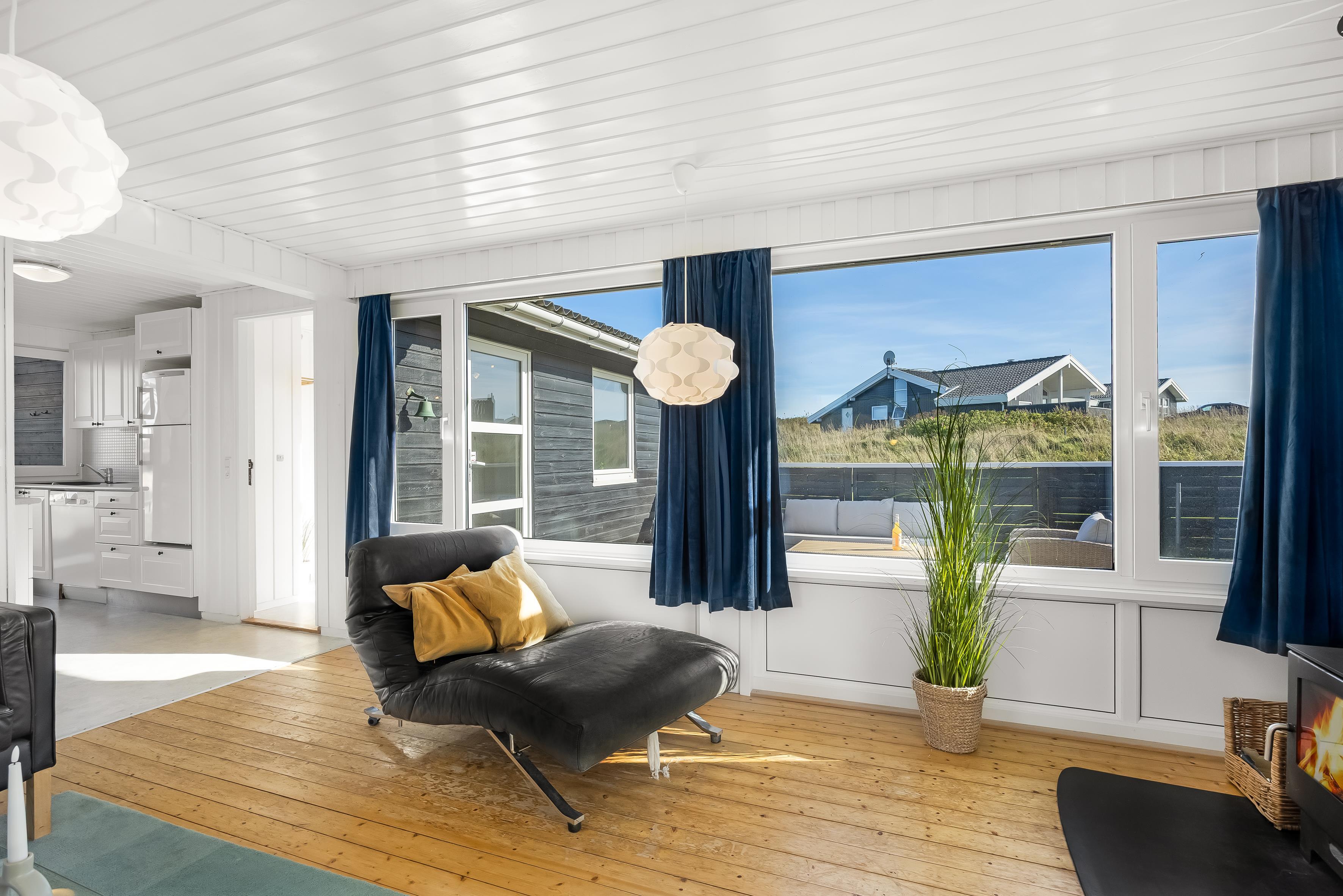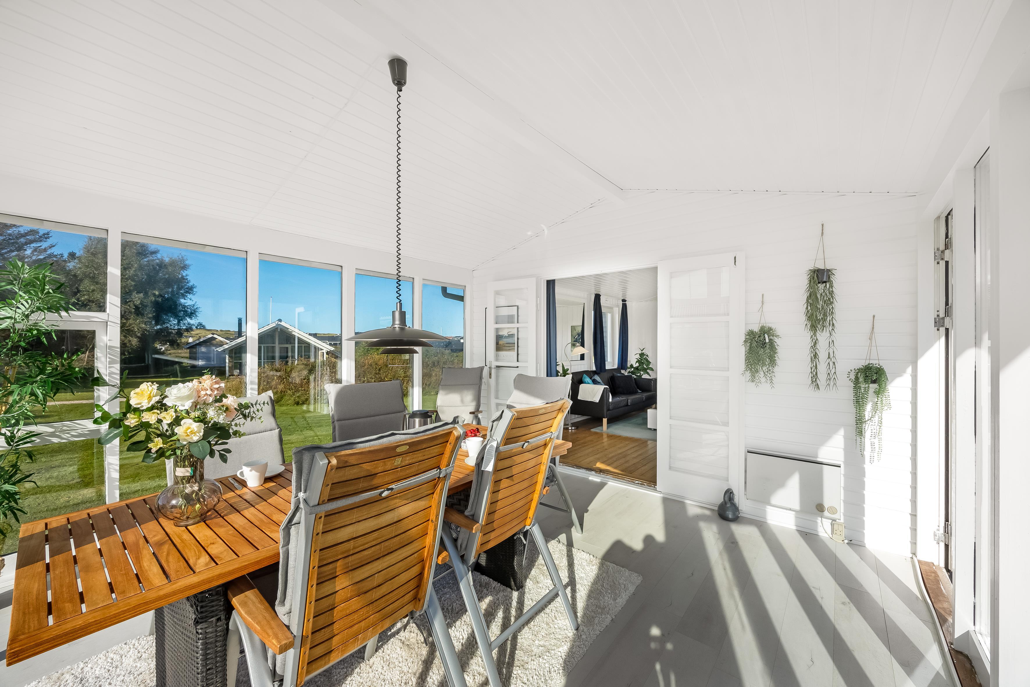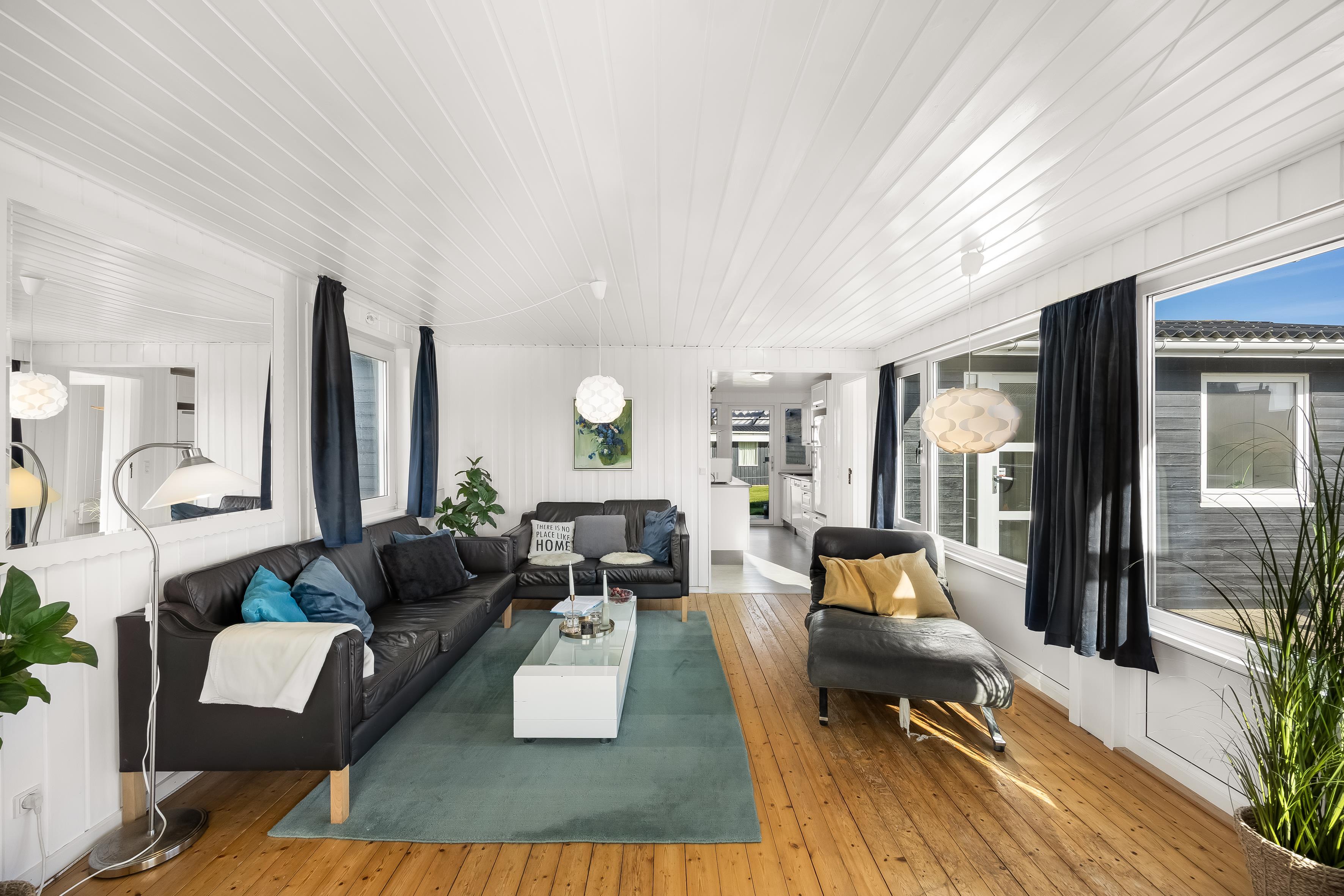 Sommerhuset har en personlig og hyggelig atmosfære, hvor funktionalitet og afslapning går hånd i hånd. Det centrale opholdsrum kombinerer stue og spiseområde, og her er både brændeovn og store vinduespartier, som skaber lys og varme. Den opvarmede havestue fungerer som et ekstra opholdsrum med udsigt over landskabet – perfekt til afslapning i al slags vejr.