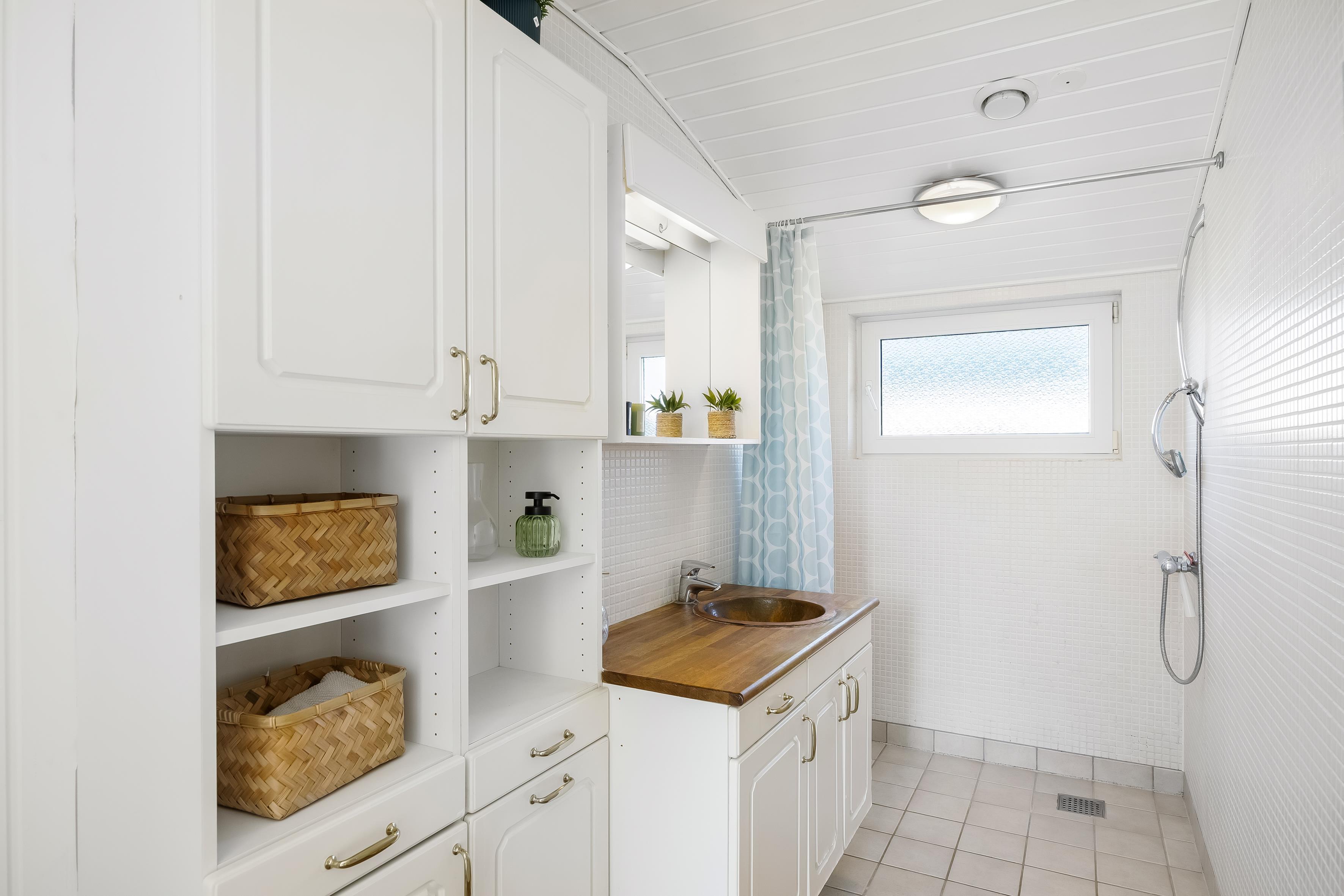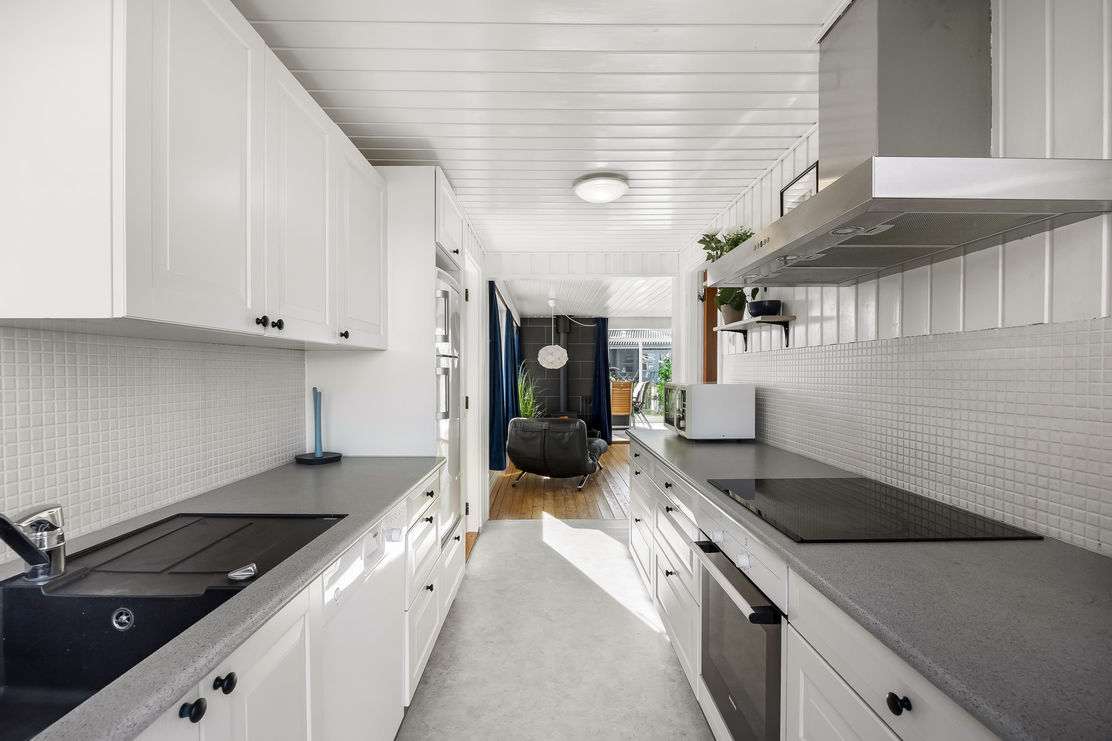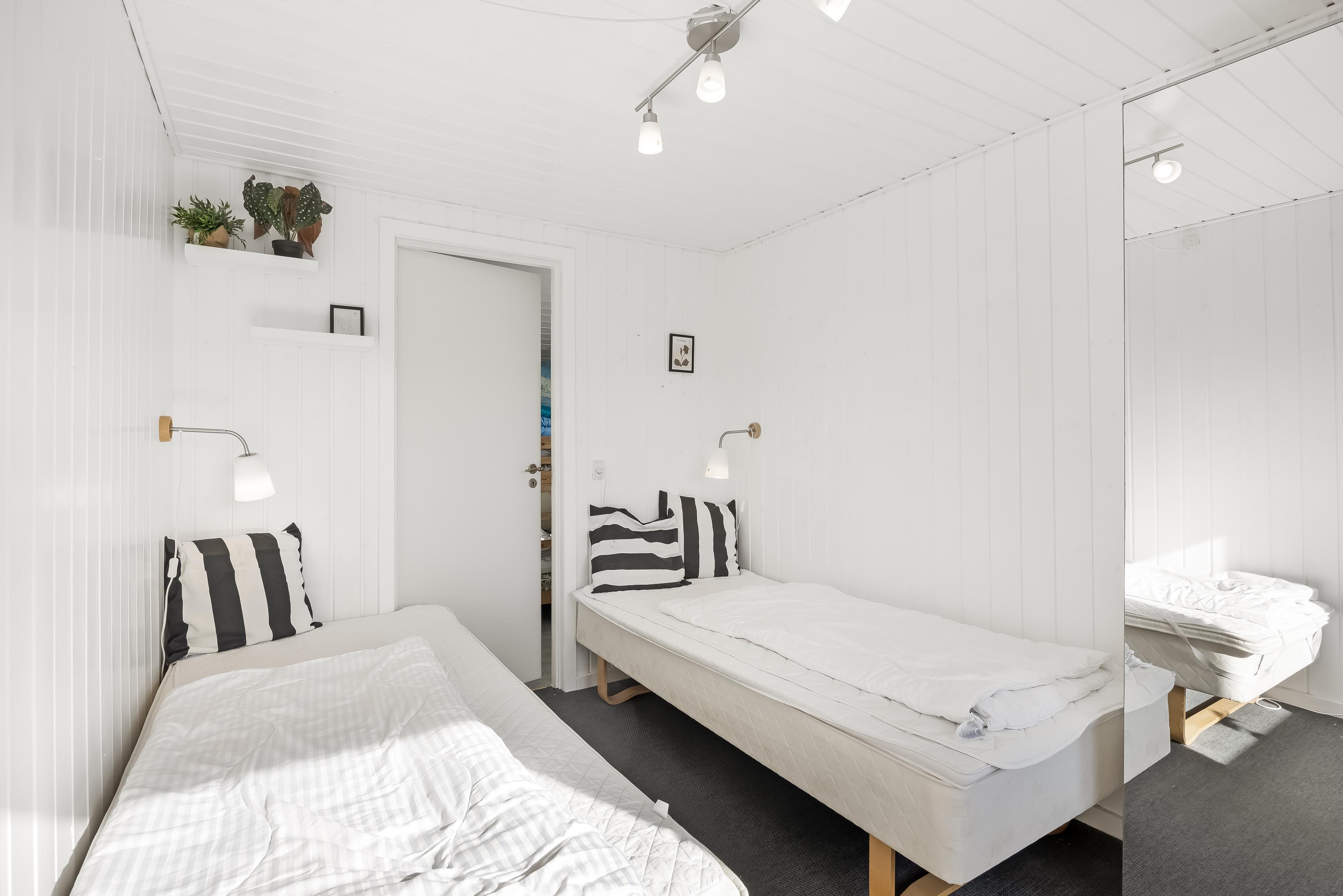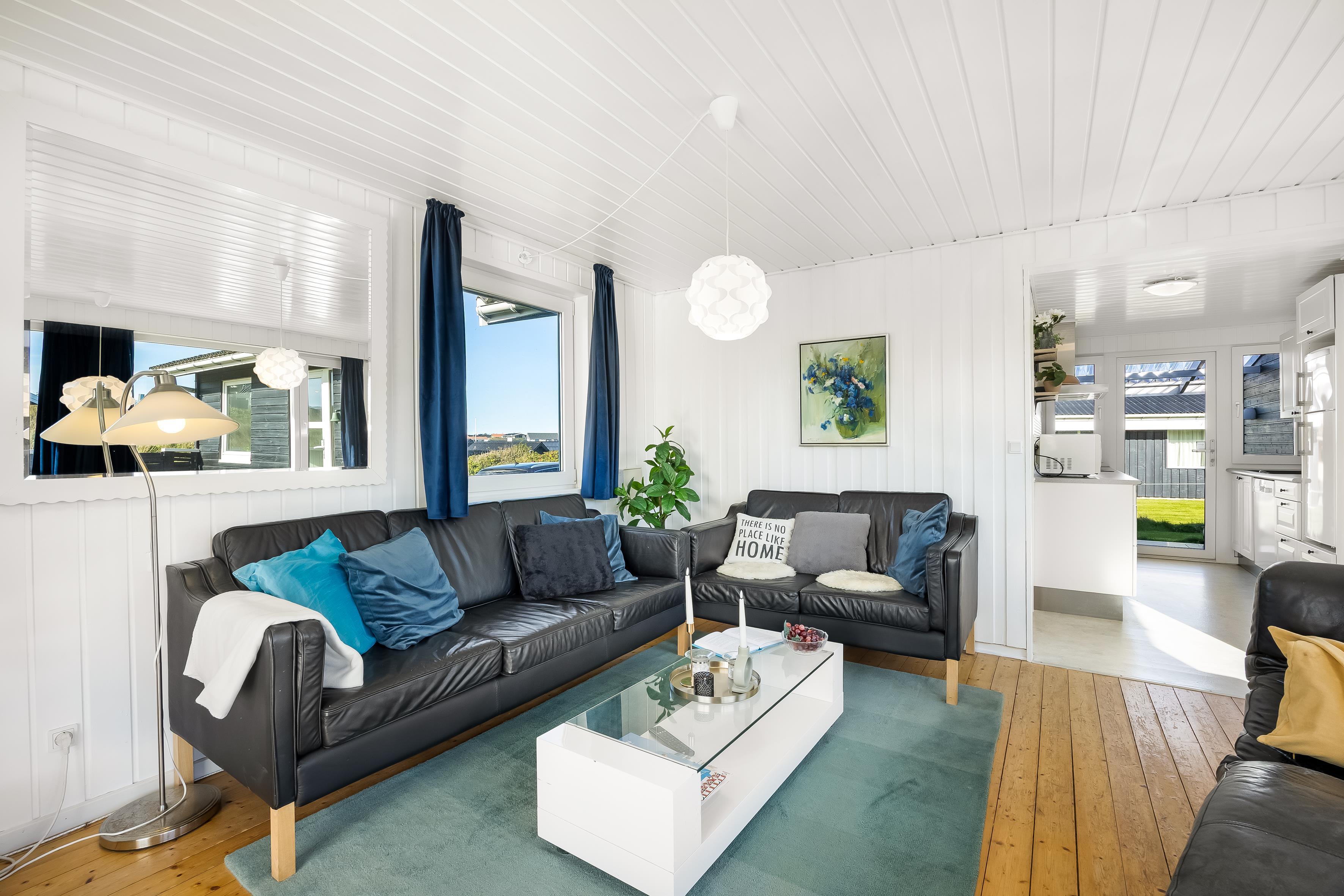 Sommerhuset har en personlig og hyggelig atmosfære, hvor funktionalitet og afslapning går hånd i hånd. Det centrale opholdsrum kombinerer stue og spiseområde, og her er både brændeovn og store vinduespartier, som skaber lys og varme. Den opvarmede havestue fungerer som et ekstra opholdsrum med udsigt over landskabet – perfekt til afslapning i al slags vejr.