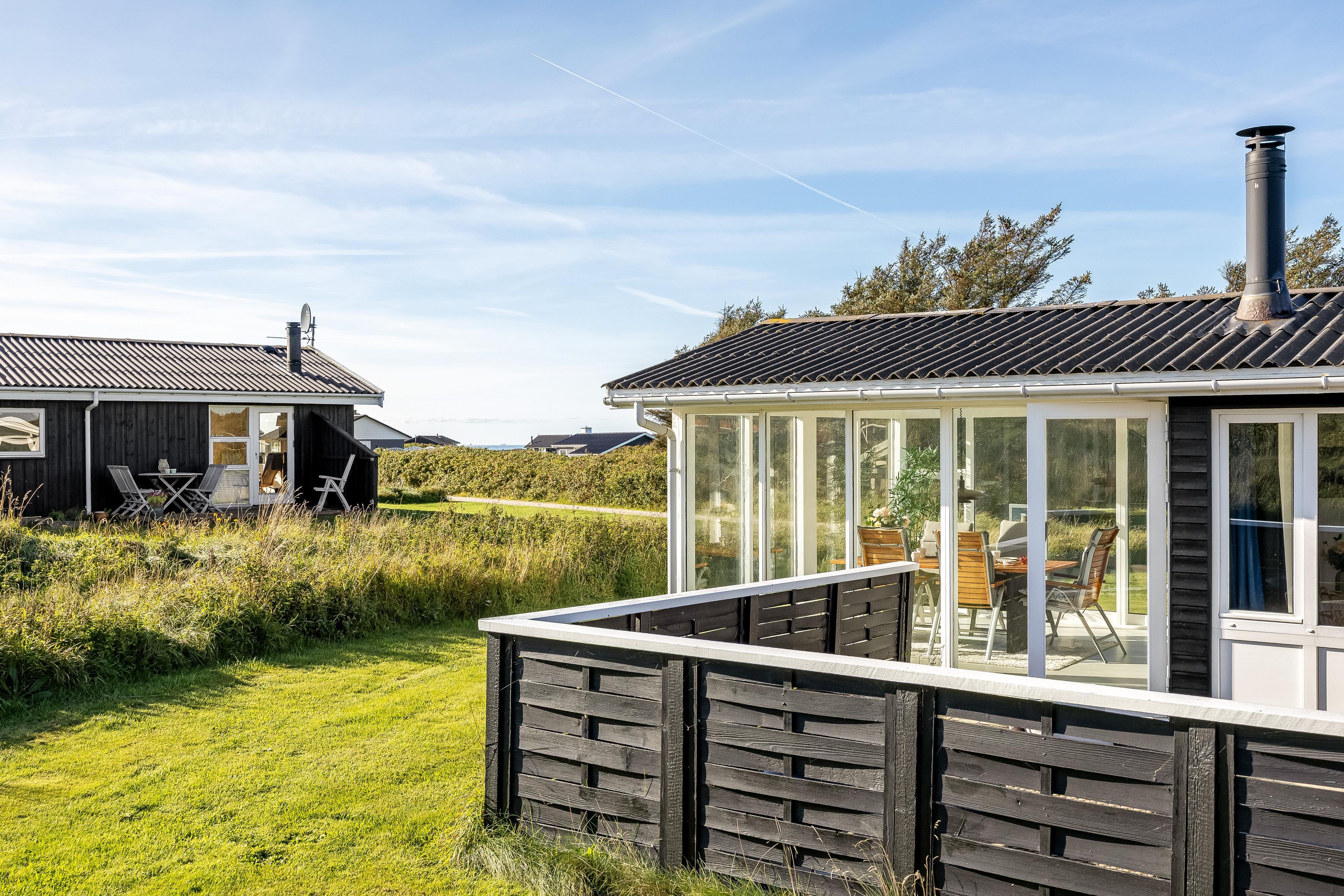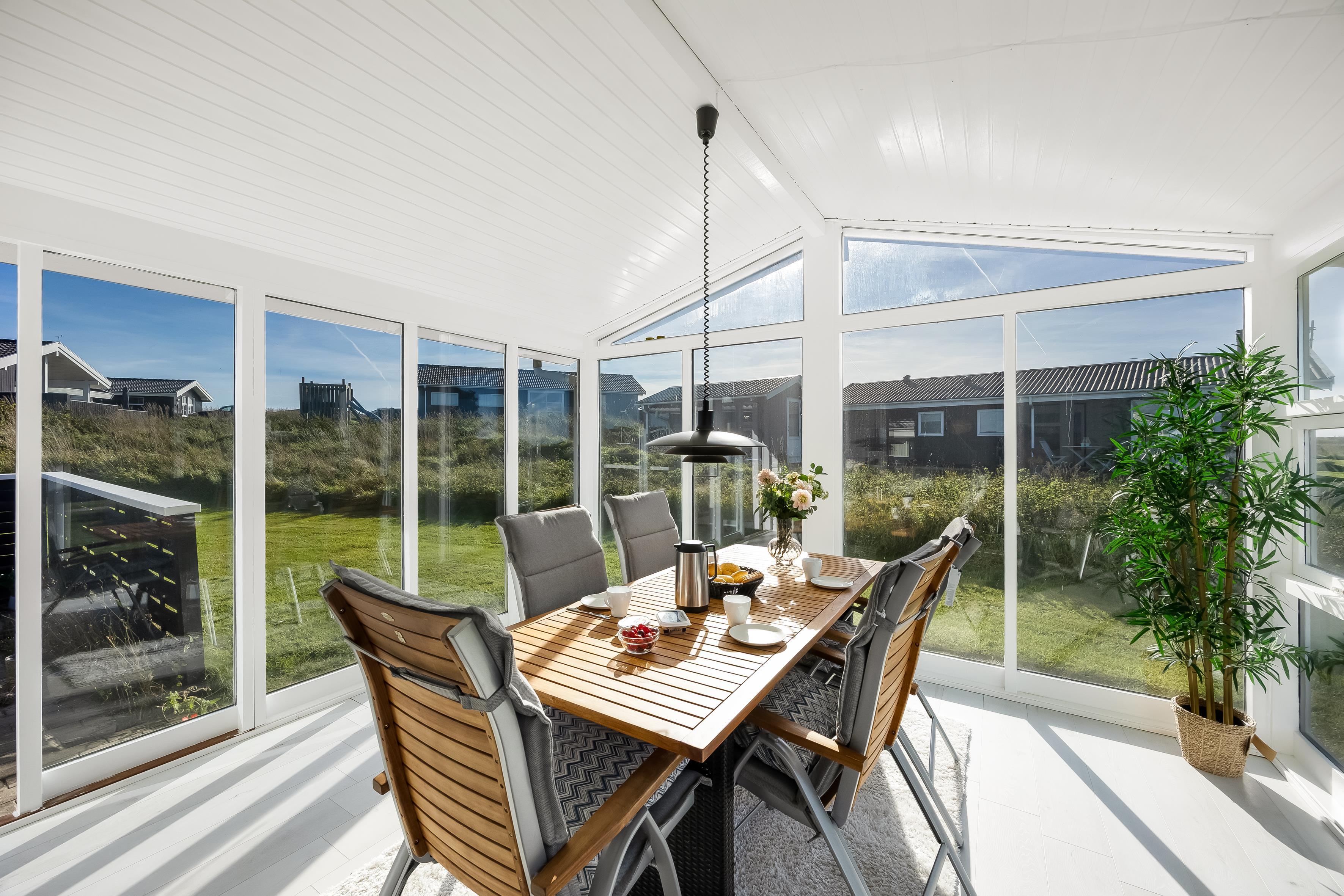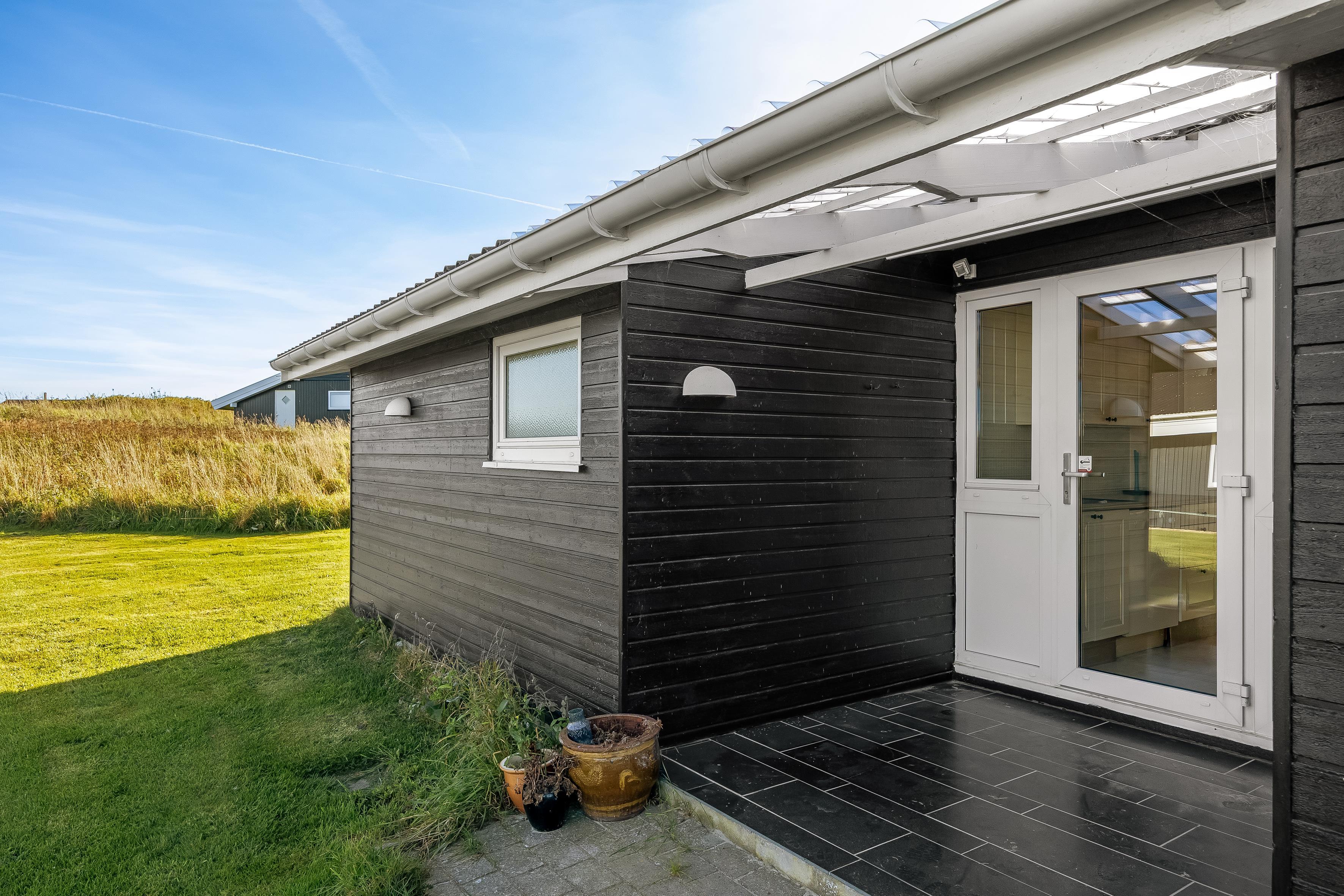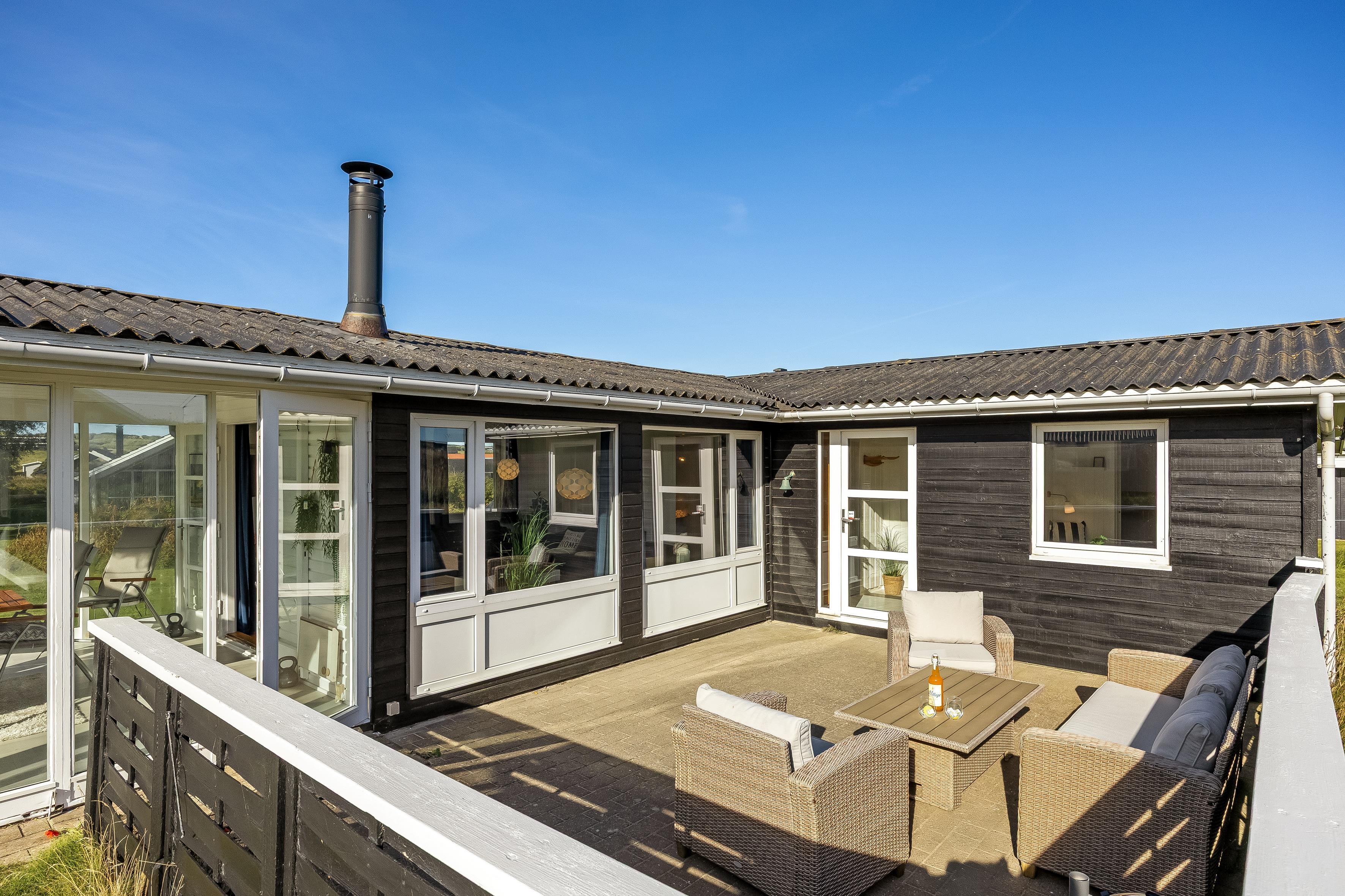 Udenfor finder du en dejlig afskærmet terrasse, som inviterer til ro, sol og nærvær. Her kan du nyde dagens måltider i det fri, læse en bog i liggestolen eller bare nyde stilheden, mens du lytter til naturen omkring dig. Den omkringliggende grund giver dig god plads og en følelse af privatliv – alt sammen tæt på kysten og med kort afstand til både Løkken og Nr. Lyngby.
