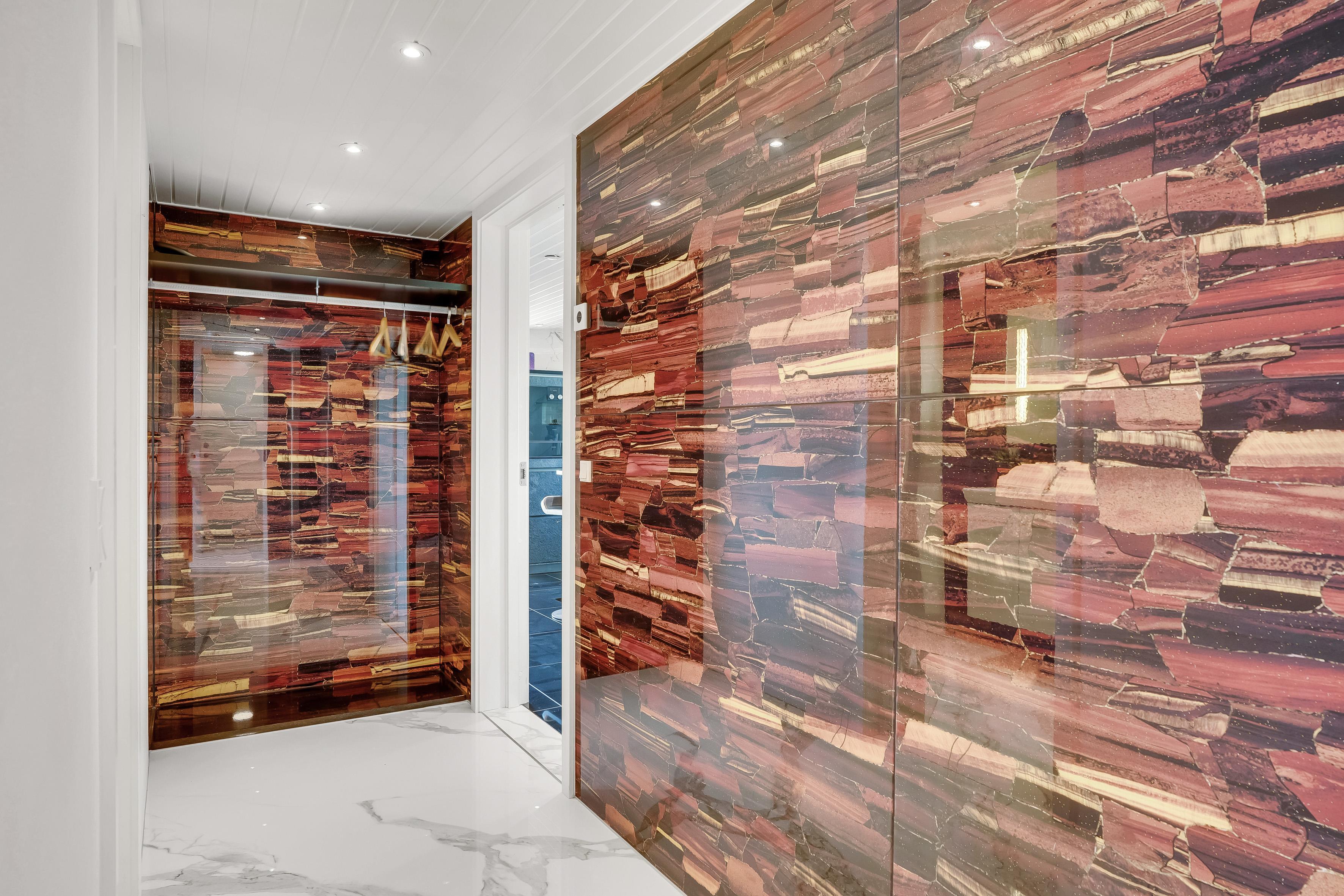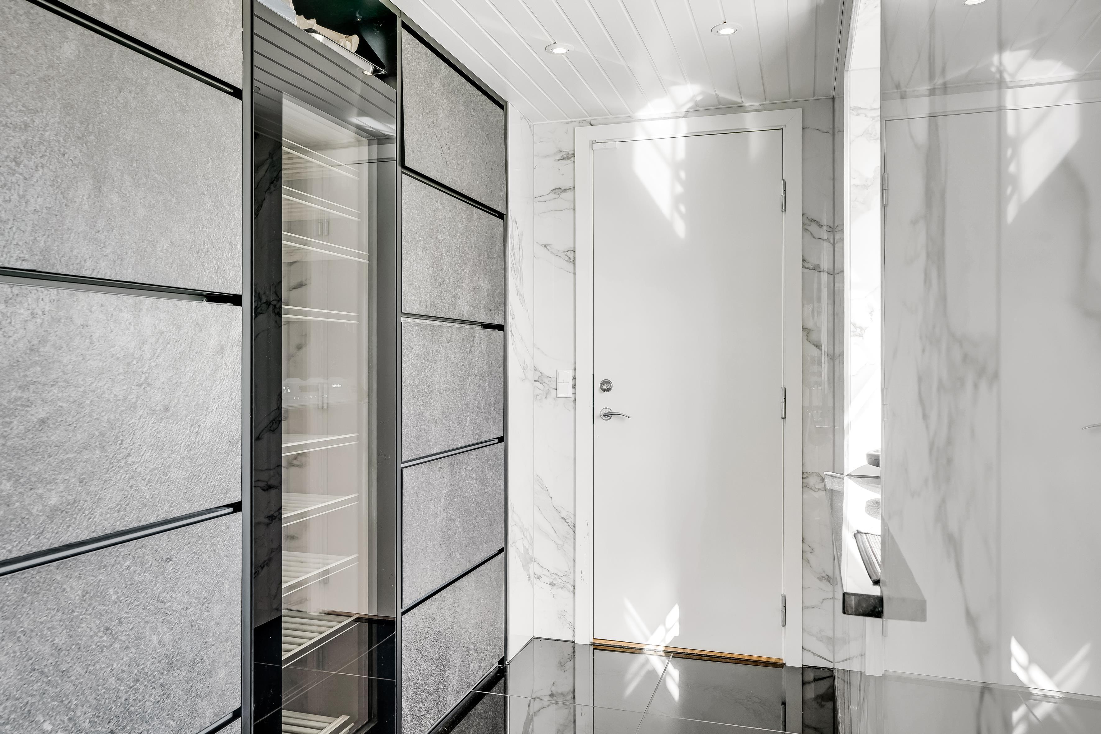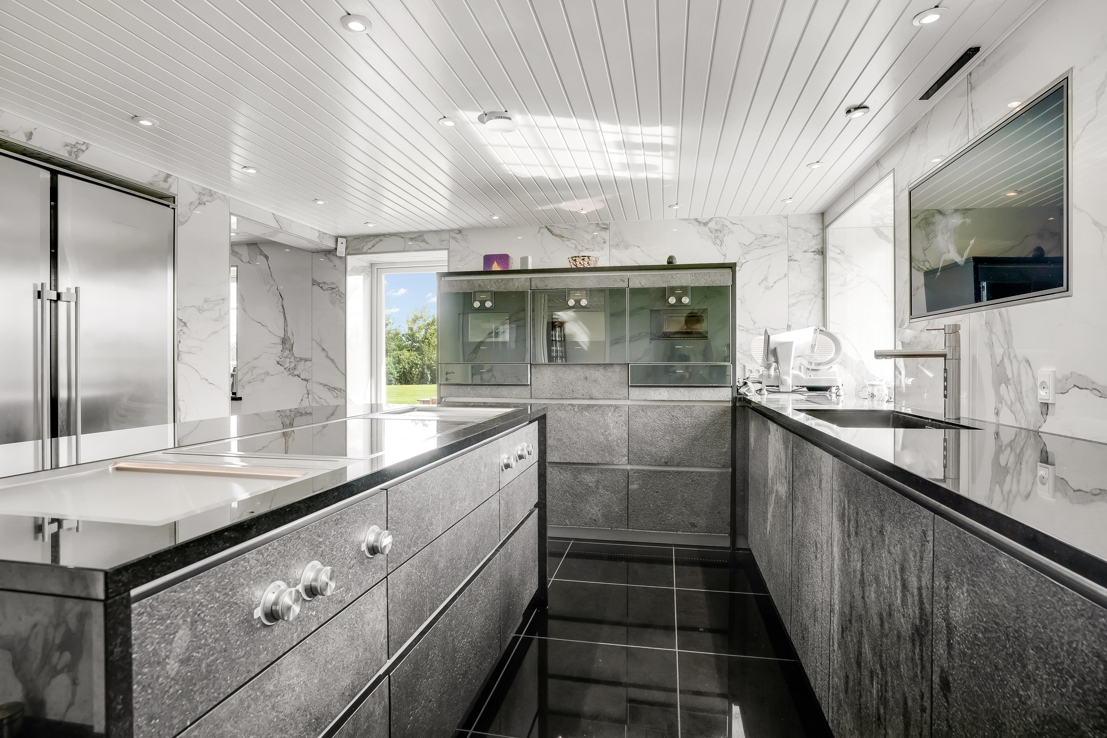 Køkkenet er i særklasse og skiller sig tydeligt ud fra det, man normalt ser. Med fronter og bordplade i granit, to indbyggede dampovne og en traditionel ovn fra Gaggenau, tilhørende mikroovn, bred zonefri kogeplade samt integreret emhætte i bordpladen er der tænkt på alt. Hertil kommer to teppanyaki-plader til japansk madlavning, der også fungerer perfekt til lune retter.