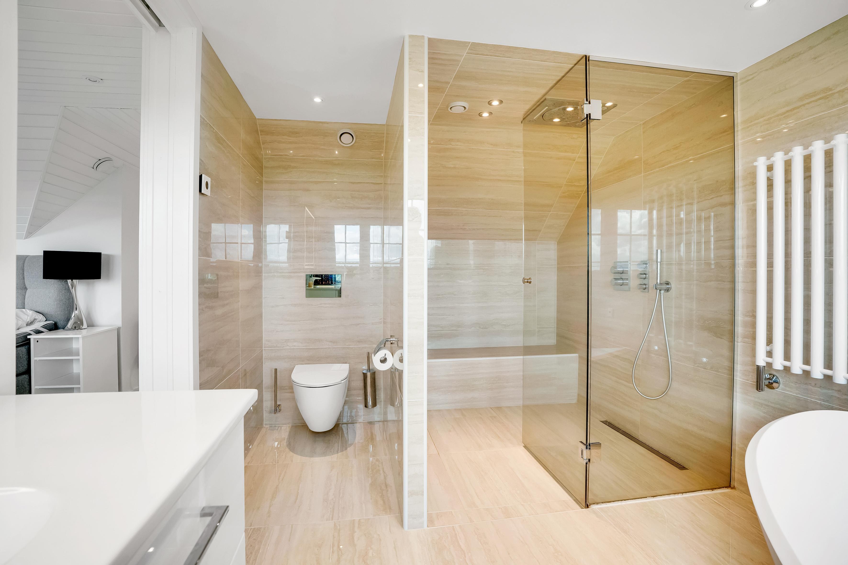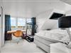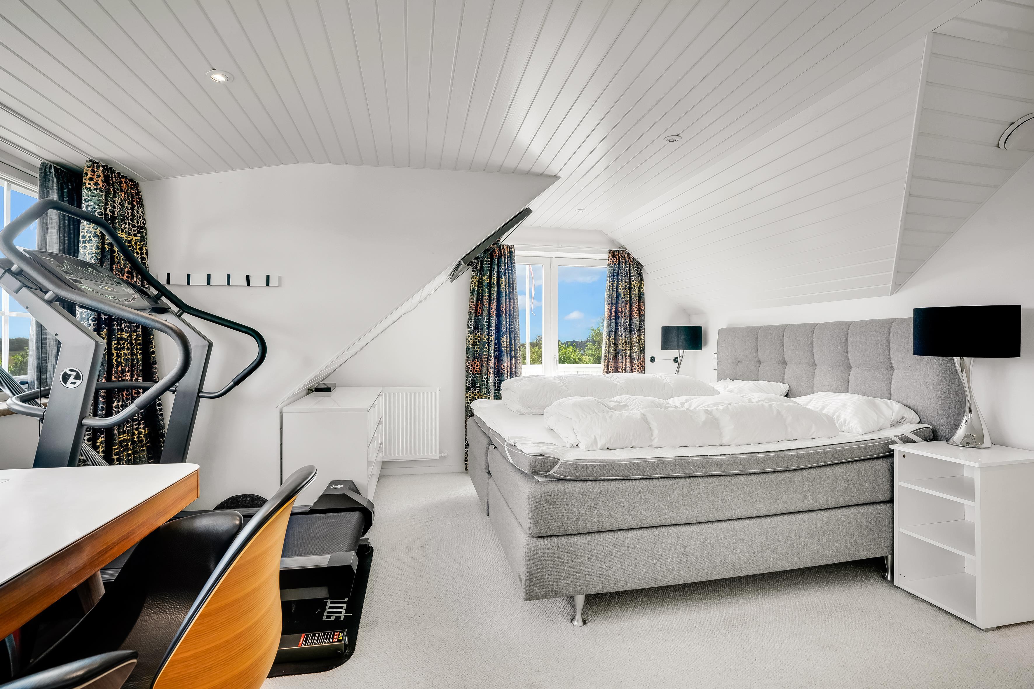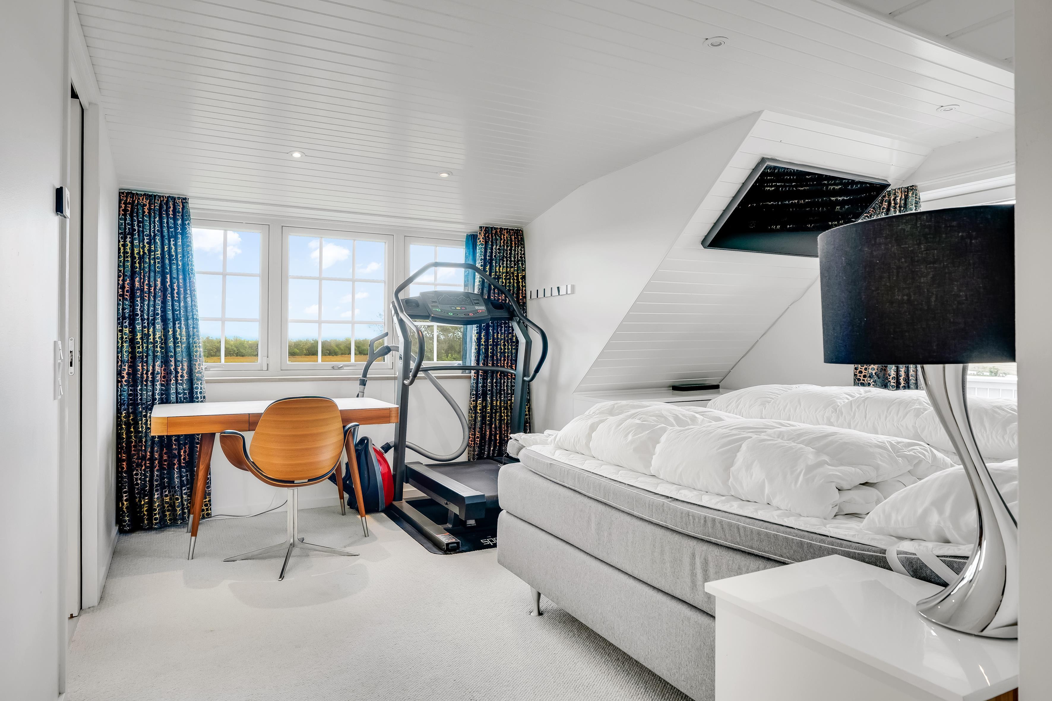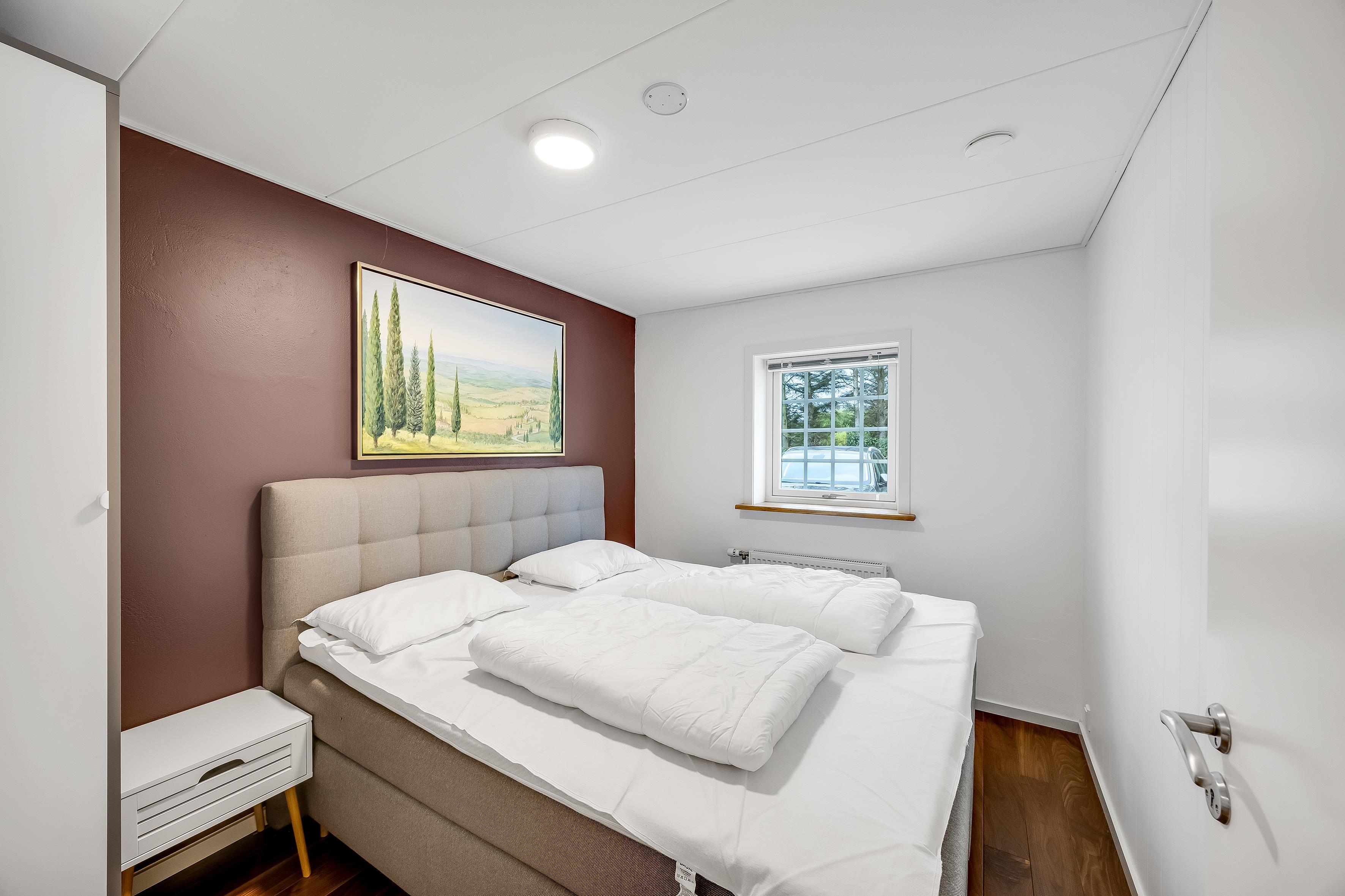 En del af soveafdelingen ligger på førstesalen. Her finder du to rummelige soveværelser, begge med TV, altan og lækre, nye dobbeltsenge fra Høie. Det ene værelse har eget badeværelse en suite. Badeværelset er udstyret med stor bruseniche med bænk, linjeafløb samt en luksuriøs regnbruser med vandfaldsfunktion.